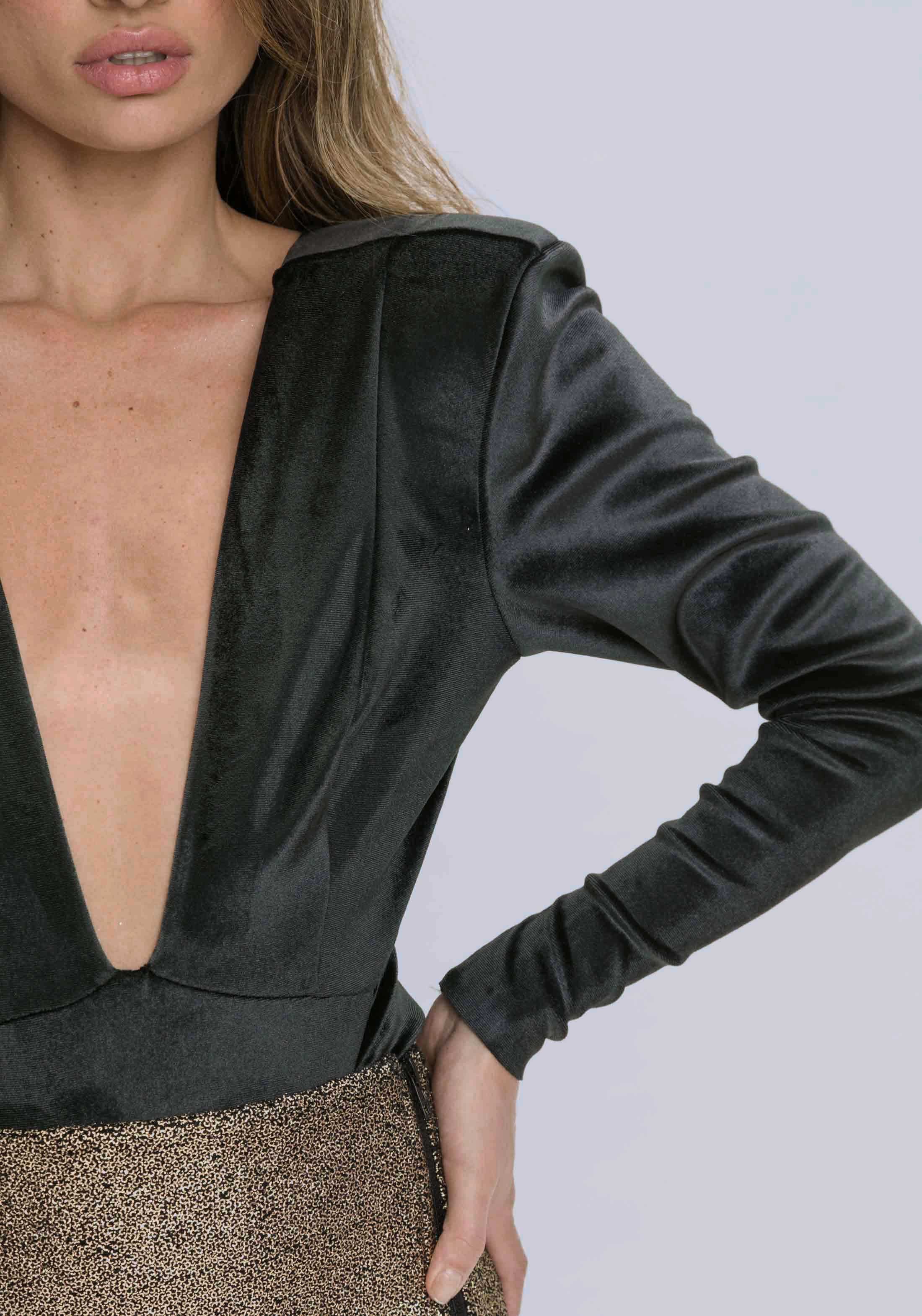 bODY CONFECCIONADA EM VELUDO COM MODELAGEM JUSTA E SHAPE RETO. POSSUI DECOTE FRONTAL PROFUNDO, MANGAS LONGAS, OMBROS ESTRUTURADOS E FECHAMENTO POSTERIOR COM ZÍPER. PEÇA CURINGA PARA COMPOR LOOKS COM SAIA E SALTO ALTO. *NÃO ACOMPANHA LUVA.
