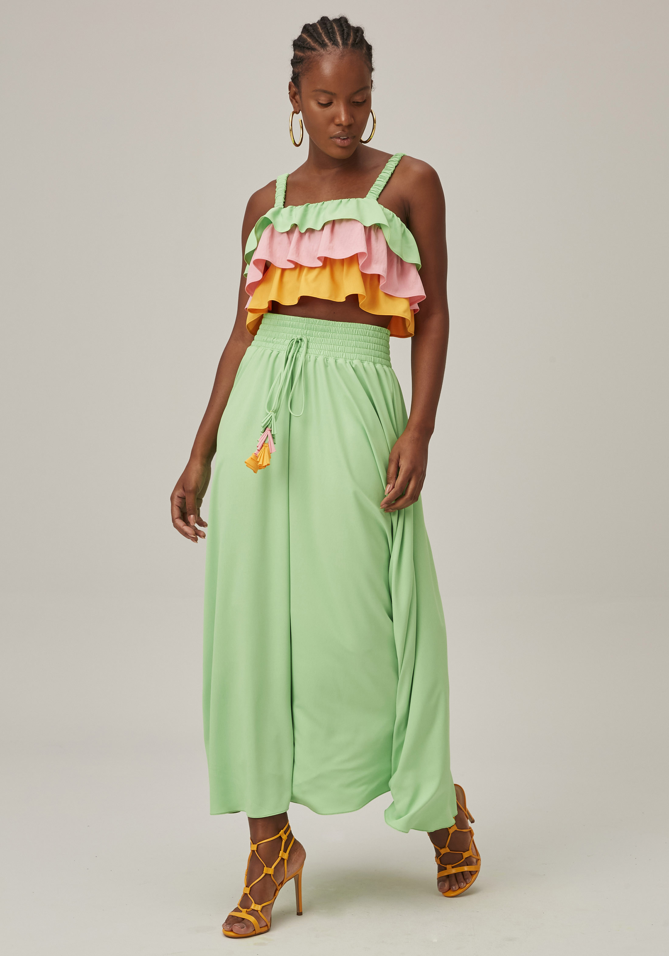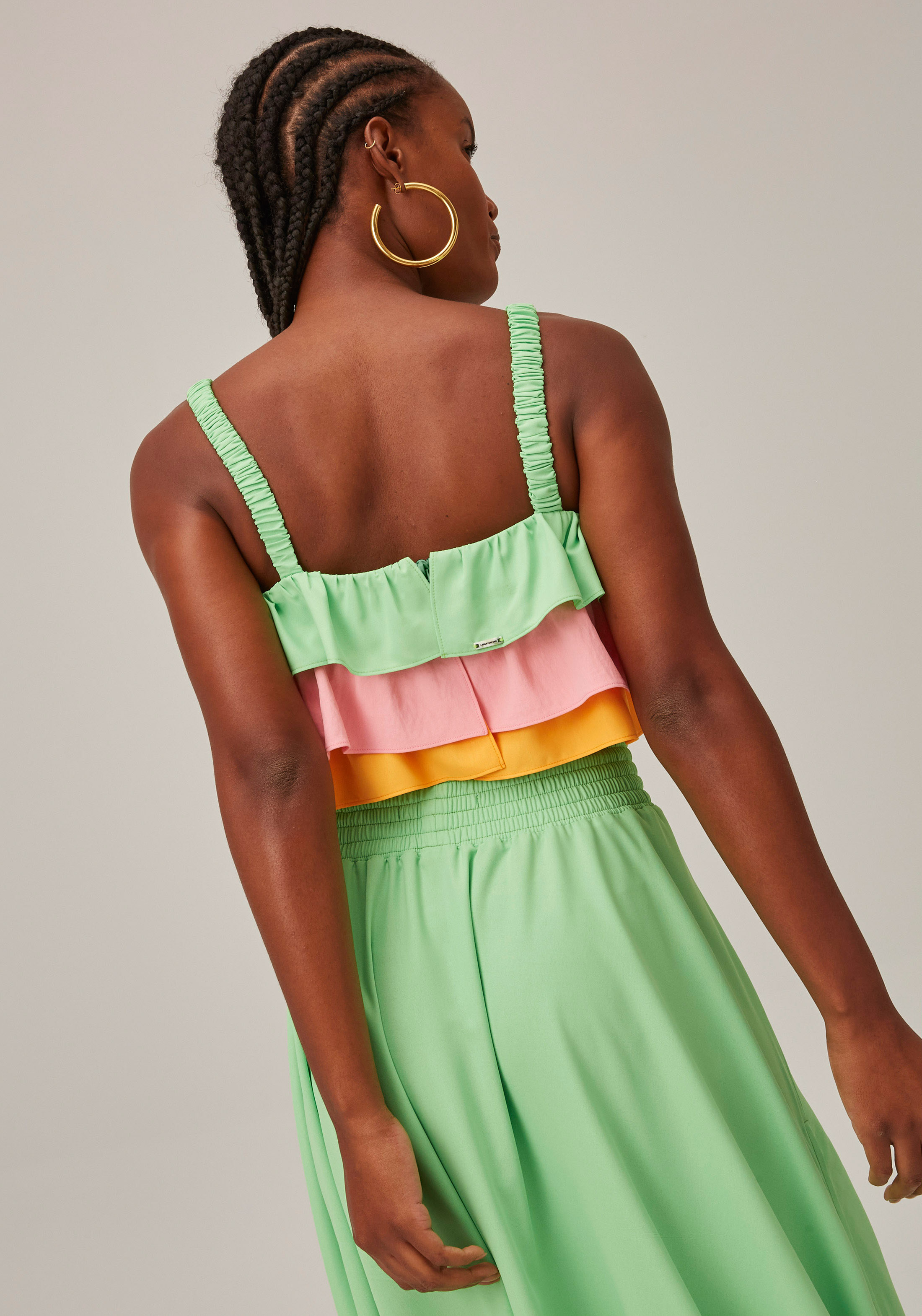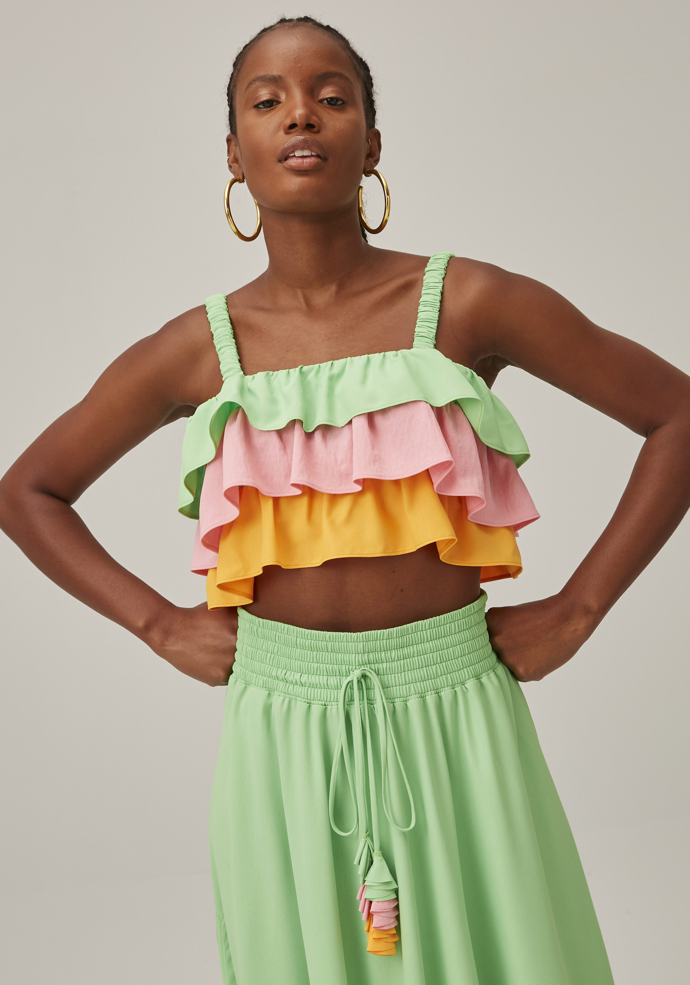 BLUSA DE ALÇAS APRESENTA MODELAGEM CROPPED COM BABADOS EM CAMADAS, TRAZENDO MAIS FRESCOR PARA AS PRODUÇÕES. A UNIÃO DE CORES É PERFEITA PARA PRODUZIR UM LOOK DESPOJADO E ATUAL. APOSTE EM SHORTS JEANS.