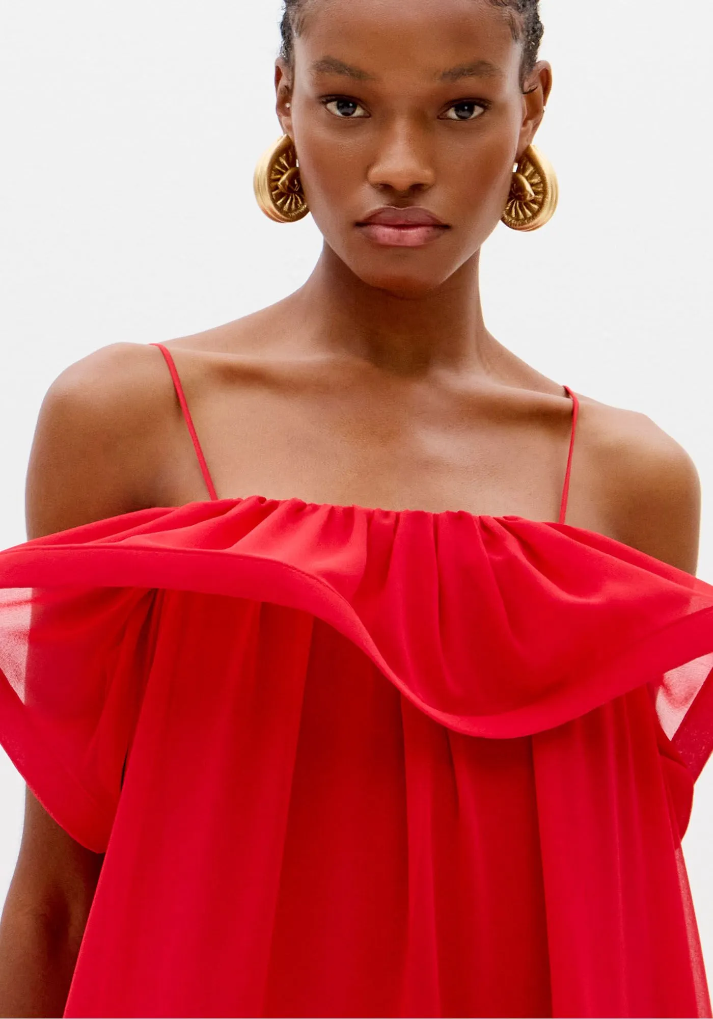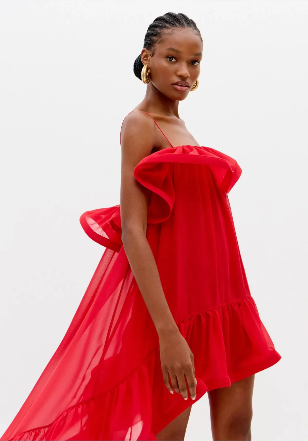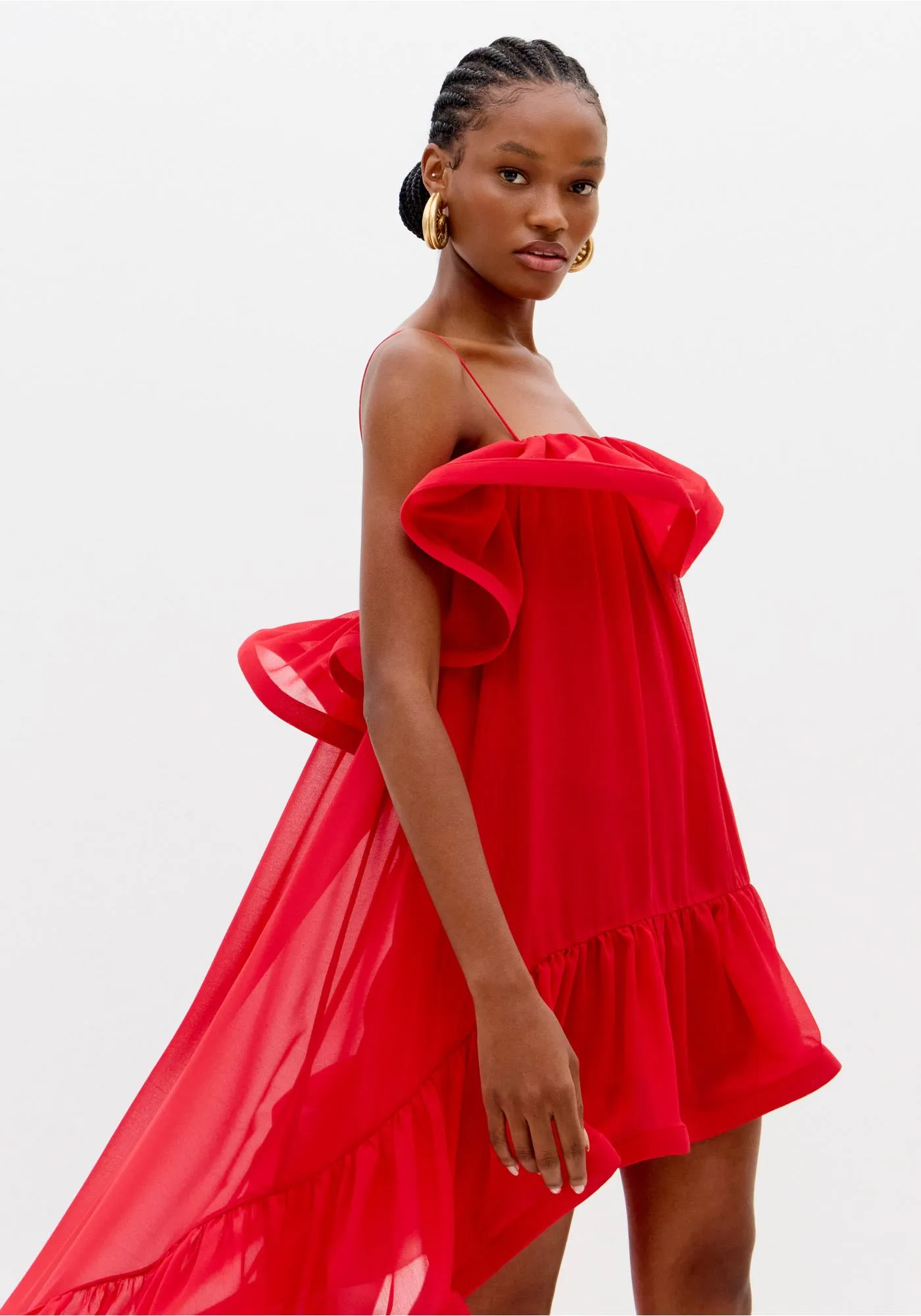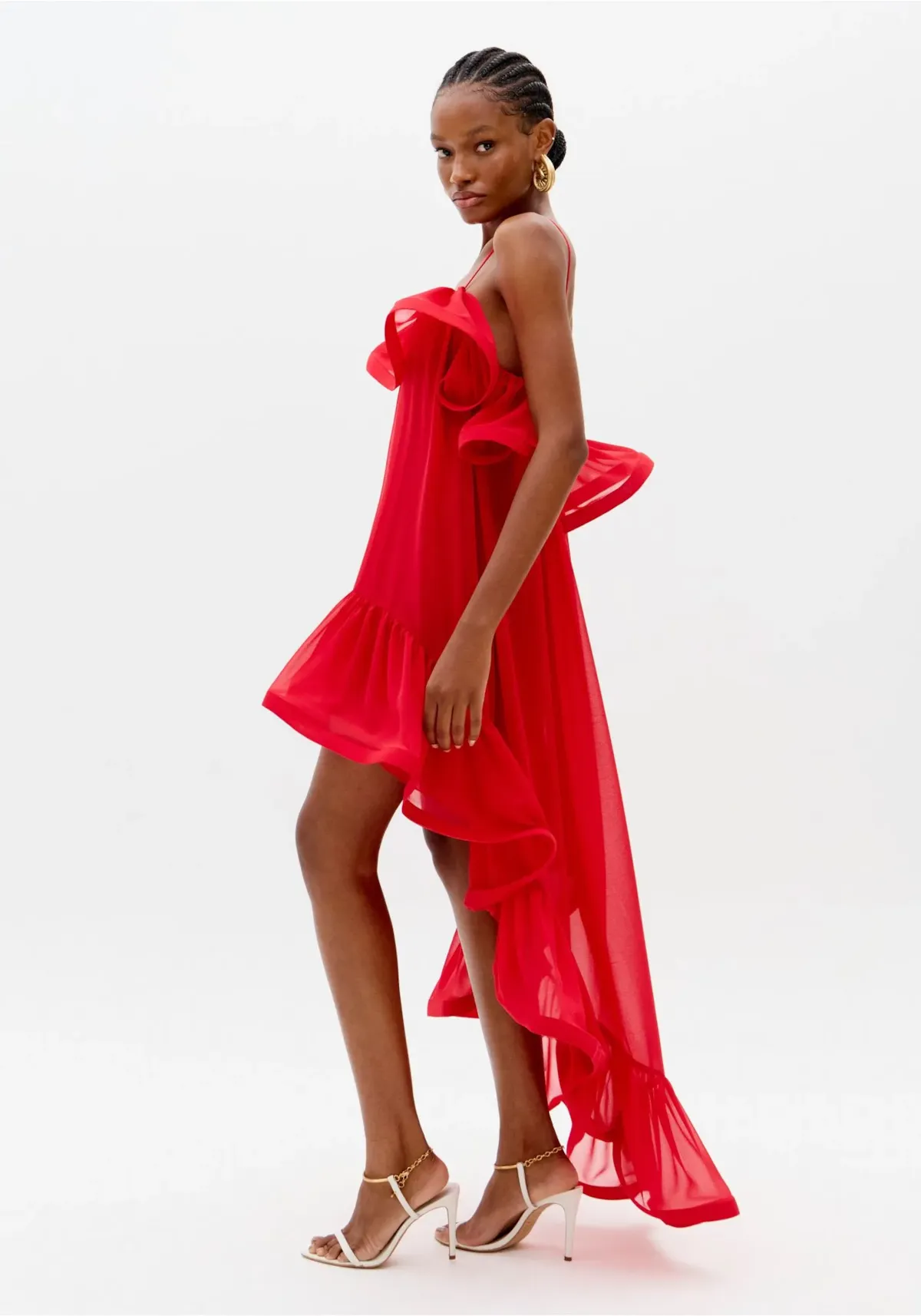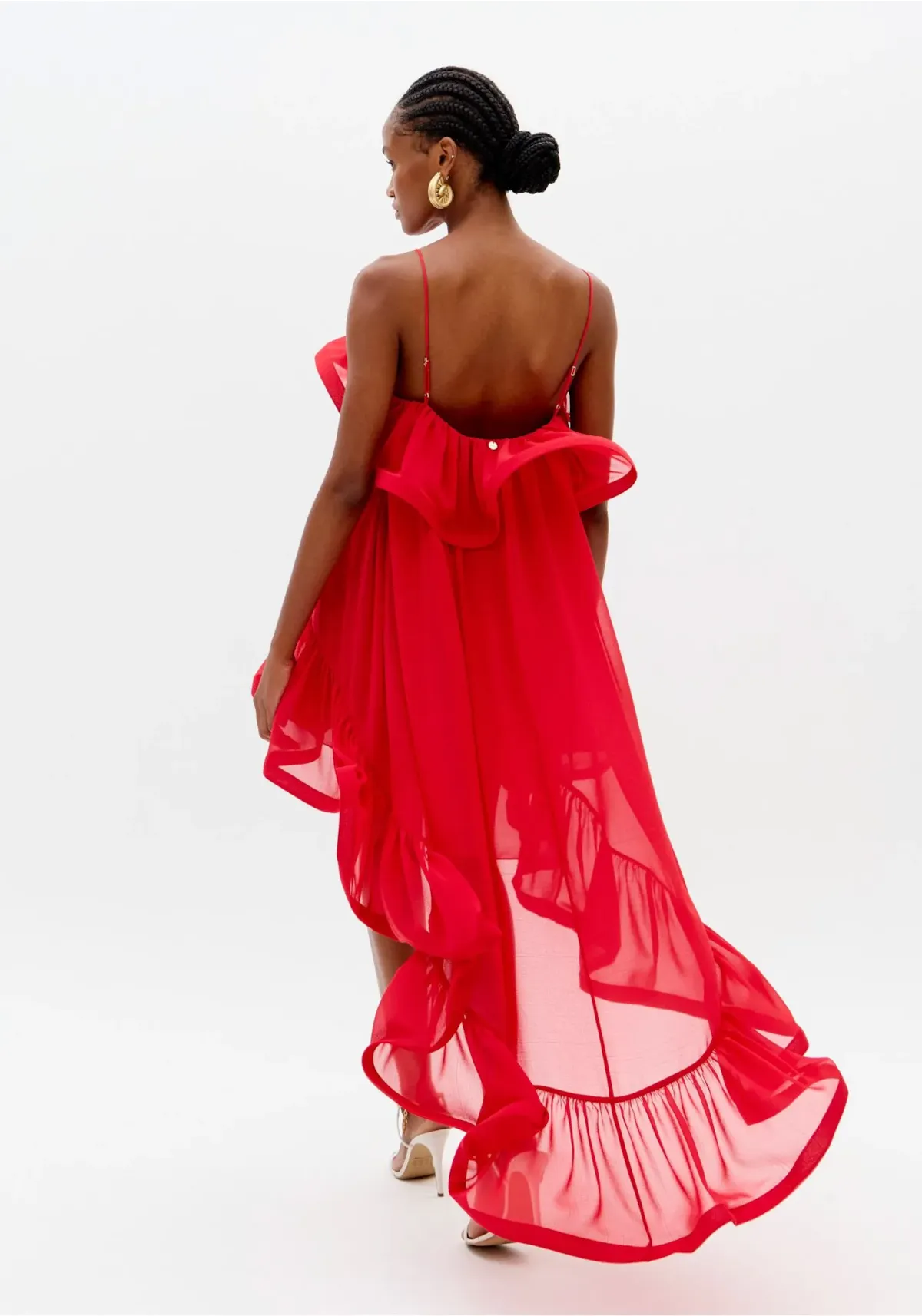 O vestido super midi em tecido leve e fluido é feito com modelagem mullet, mais longa na parte de trás. Possui alças reguláveis, decote reto e caimento amplo. O destaque fica por conta dos babados estruturados que agregam volume e movimento à produção.