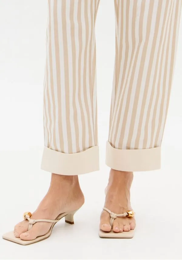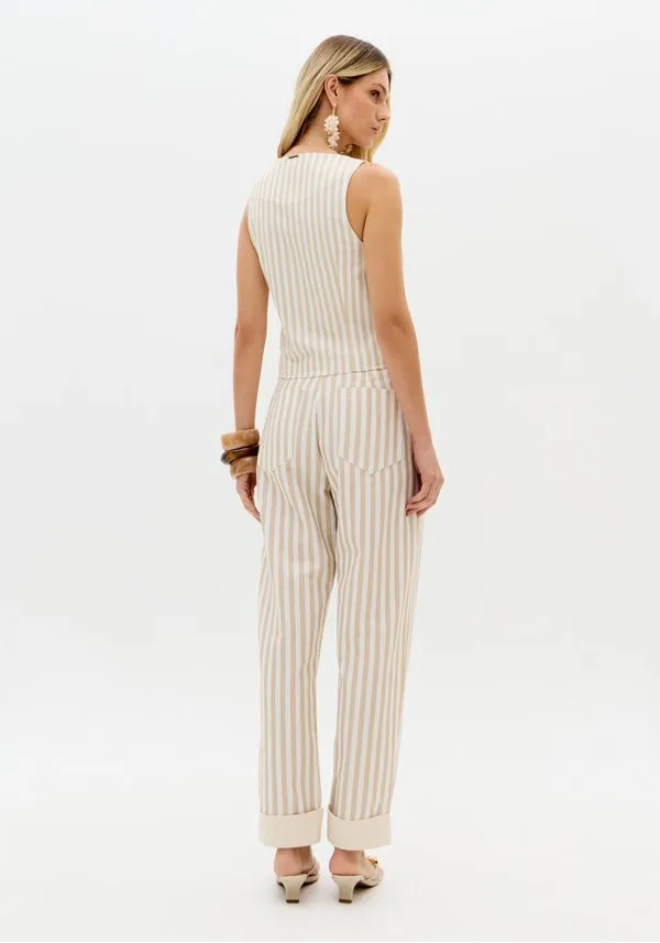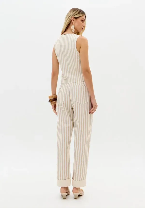 A calça em tecido encorpado de modelagem baggy tem quadril mais amplo e pernas que se afunilam levemente. Conta com cintura alta, bolsos funcionais, fechamento por botão e zíper, além das barras italianas que finalizam o visual. Aposta certa na estação!