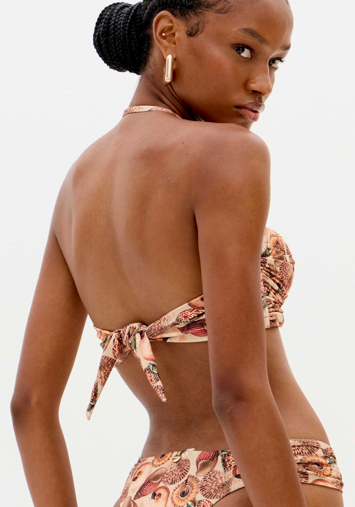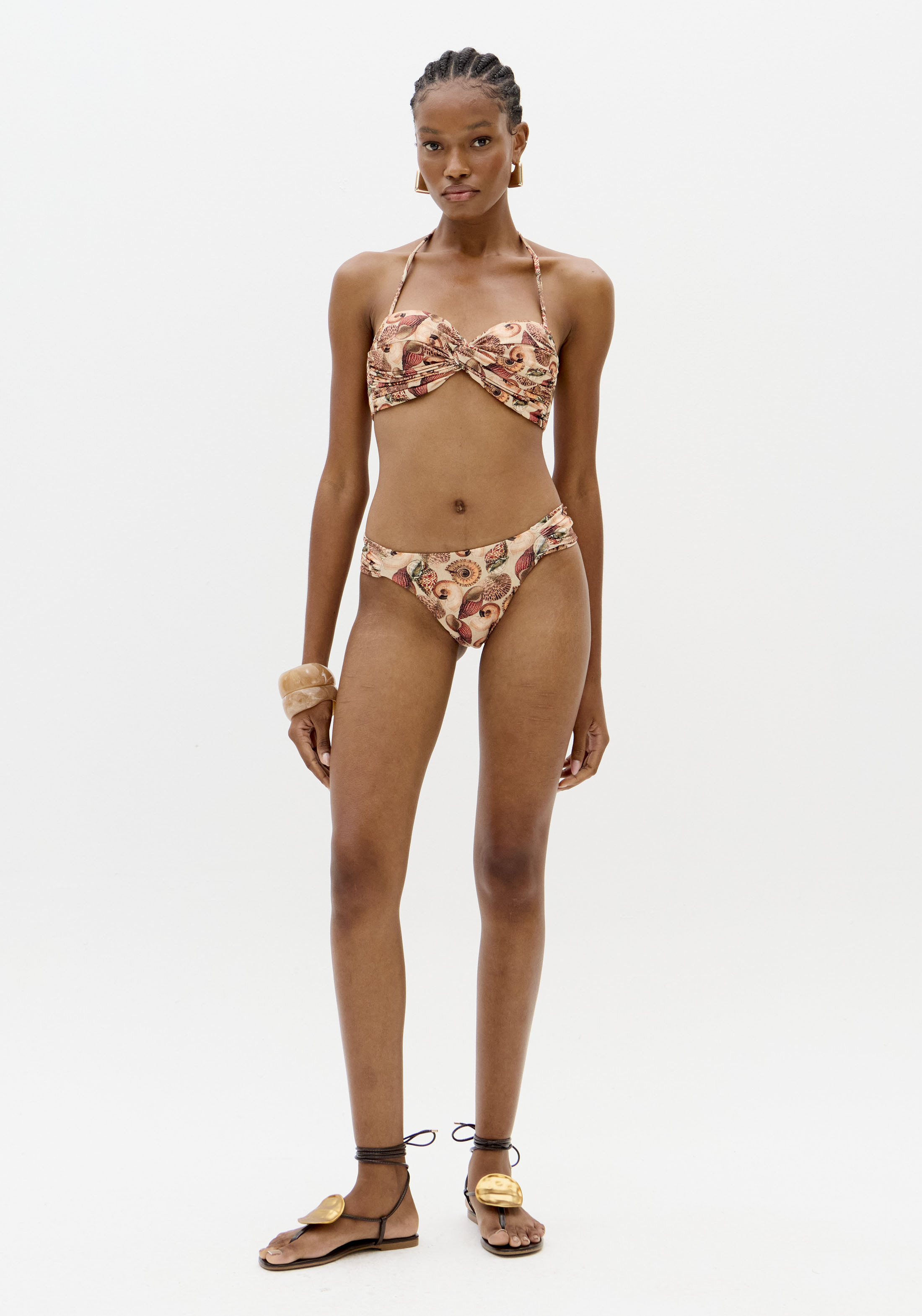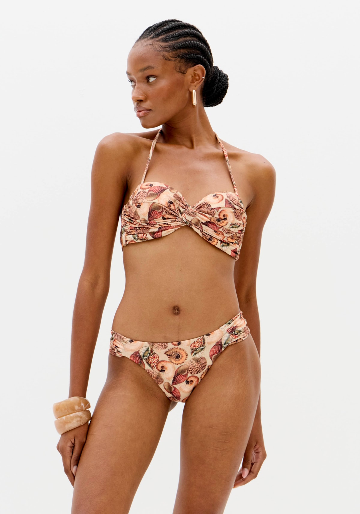 O biquíni reto estampado apresenta top estruturado com torção frontal e alça com amarração posterior que garante firmeza. A calcinha com laterais franzidas equilibra proporções e oferece caimento confortável. Sofisticação para brilhar sob o sol.