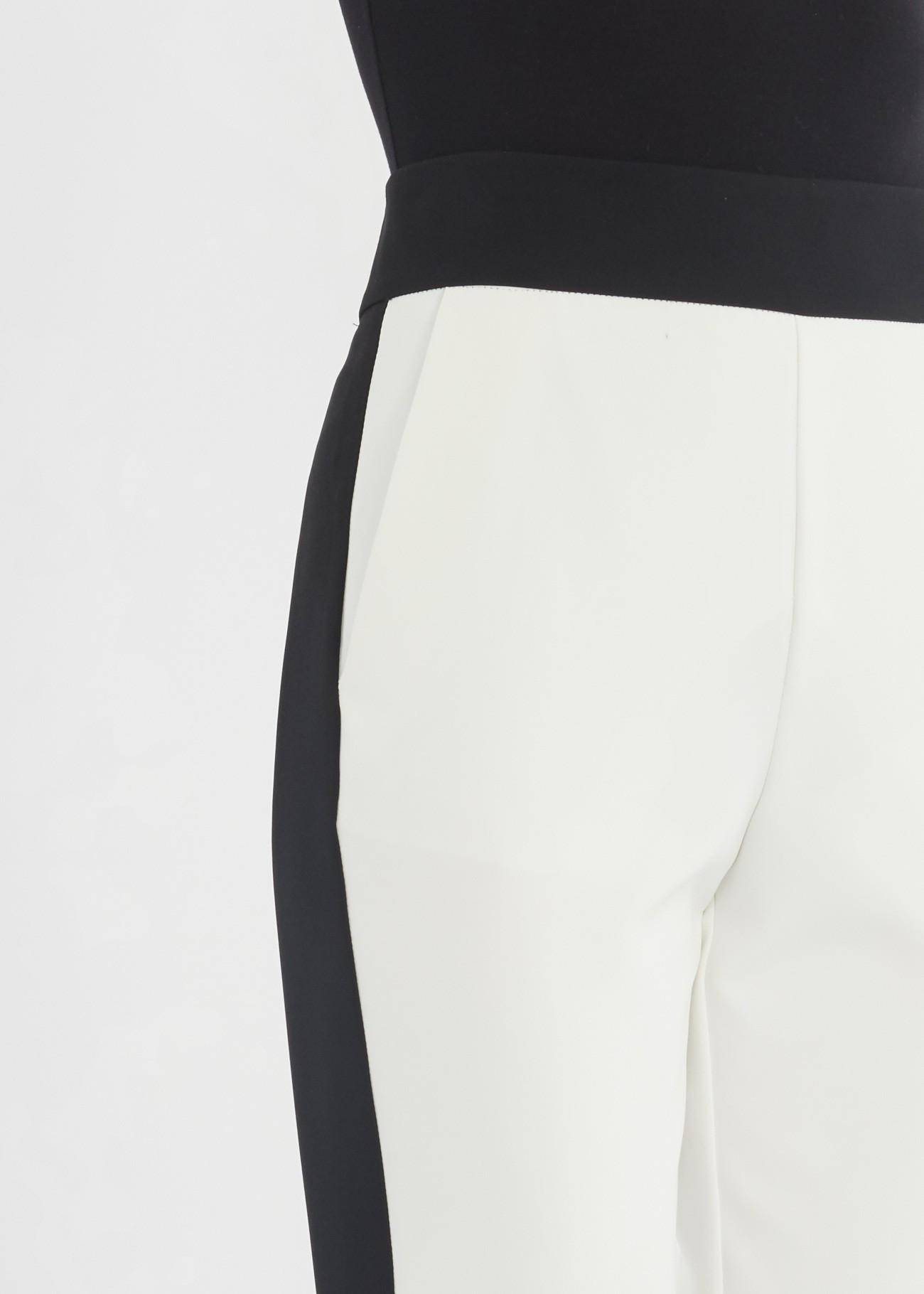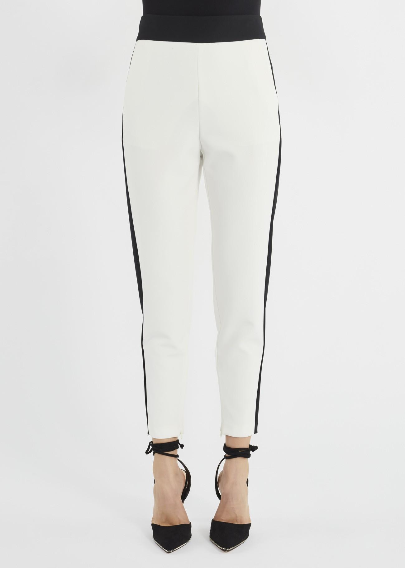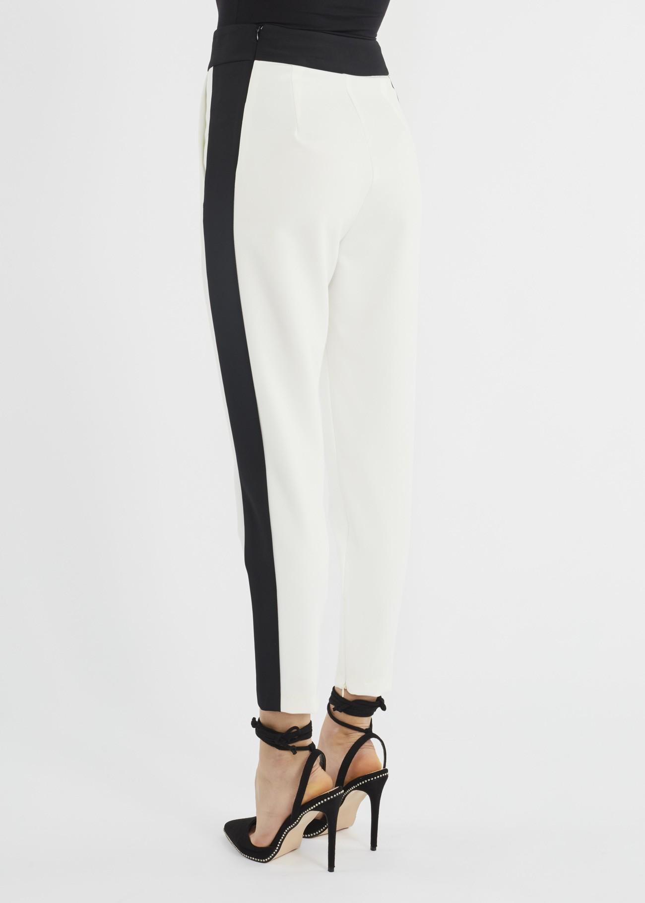 Calças tipo smoking confeccionadas em tecido técnico elástico. A peça fecha-se com fecho de correr lateral, tem cintura alta e riscas laterais numa cor contrastante que alongam a figura.
