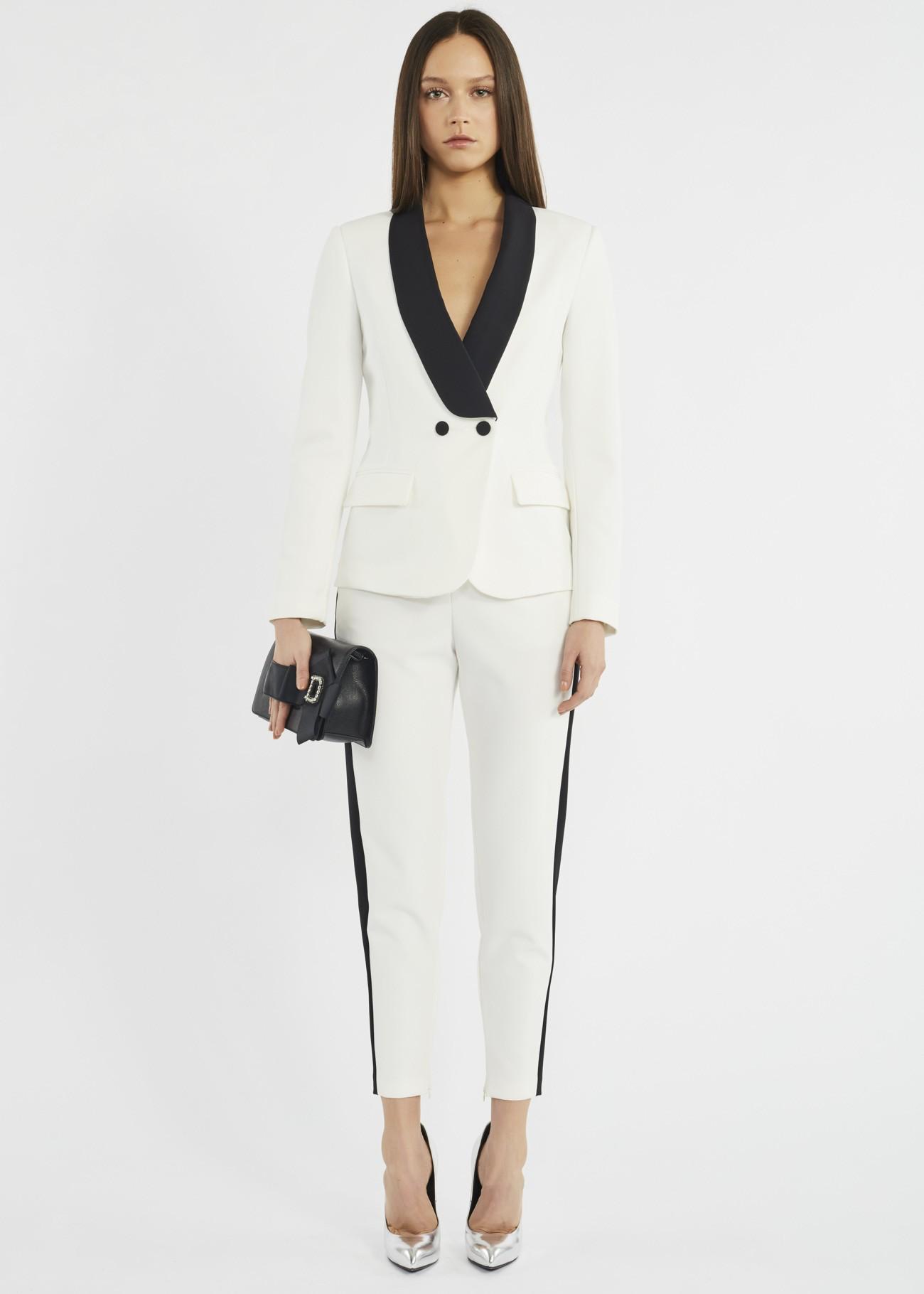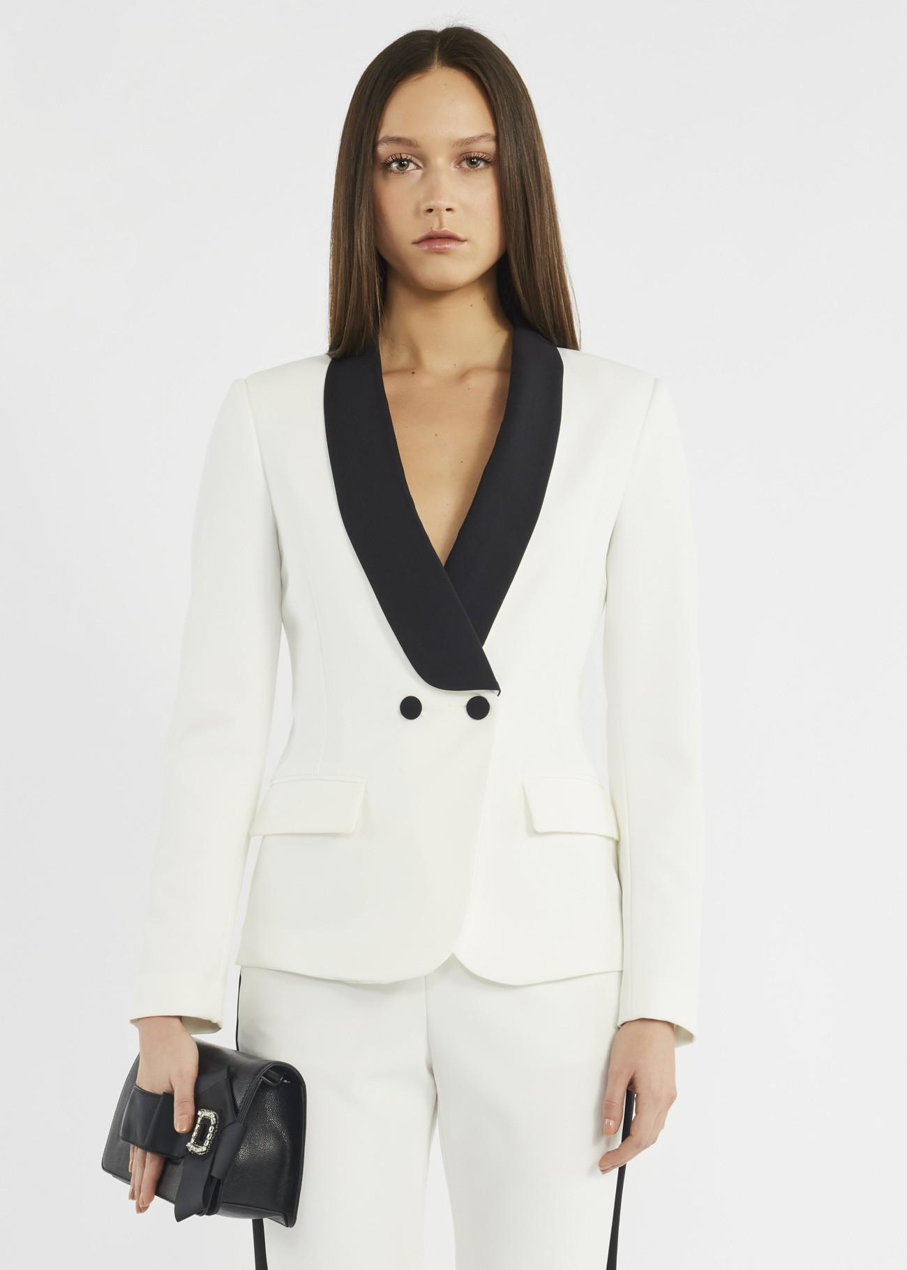 Casaco estilo smoking em tecido técnico elástico para um ajuste impecável. A peça tem uma linha slim, gola xale em cor contrastante, bolsos com aba e fecho de peito duplo com dois botões forrados.