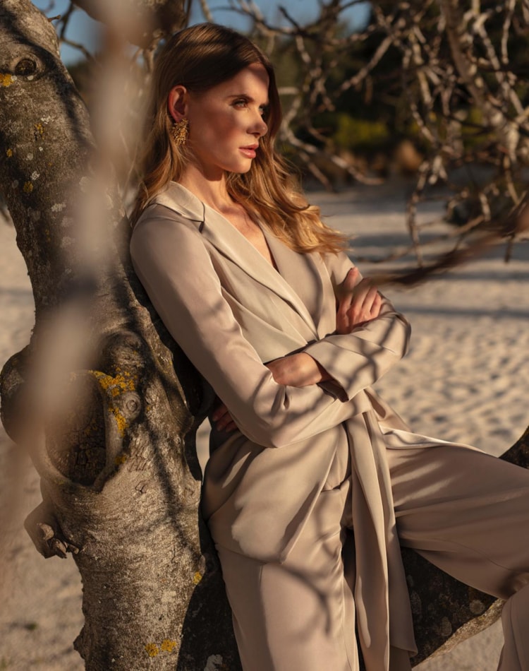 Blazer de corte clássico com cinto integrado no mesmo tecido. Gola de apela. Manga coprida Forro interno em tecido acetinado ao tom. Total look.