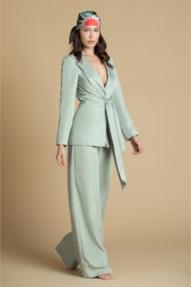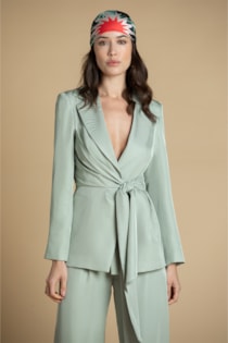 Blazer de corte clássico com cinto integrado no mesmo tecido. Gola de apela. Manga coprida Forro interno em tecido acetinado ao tom. Total look.