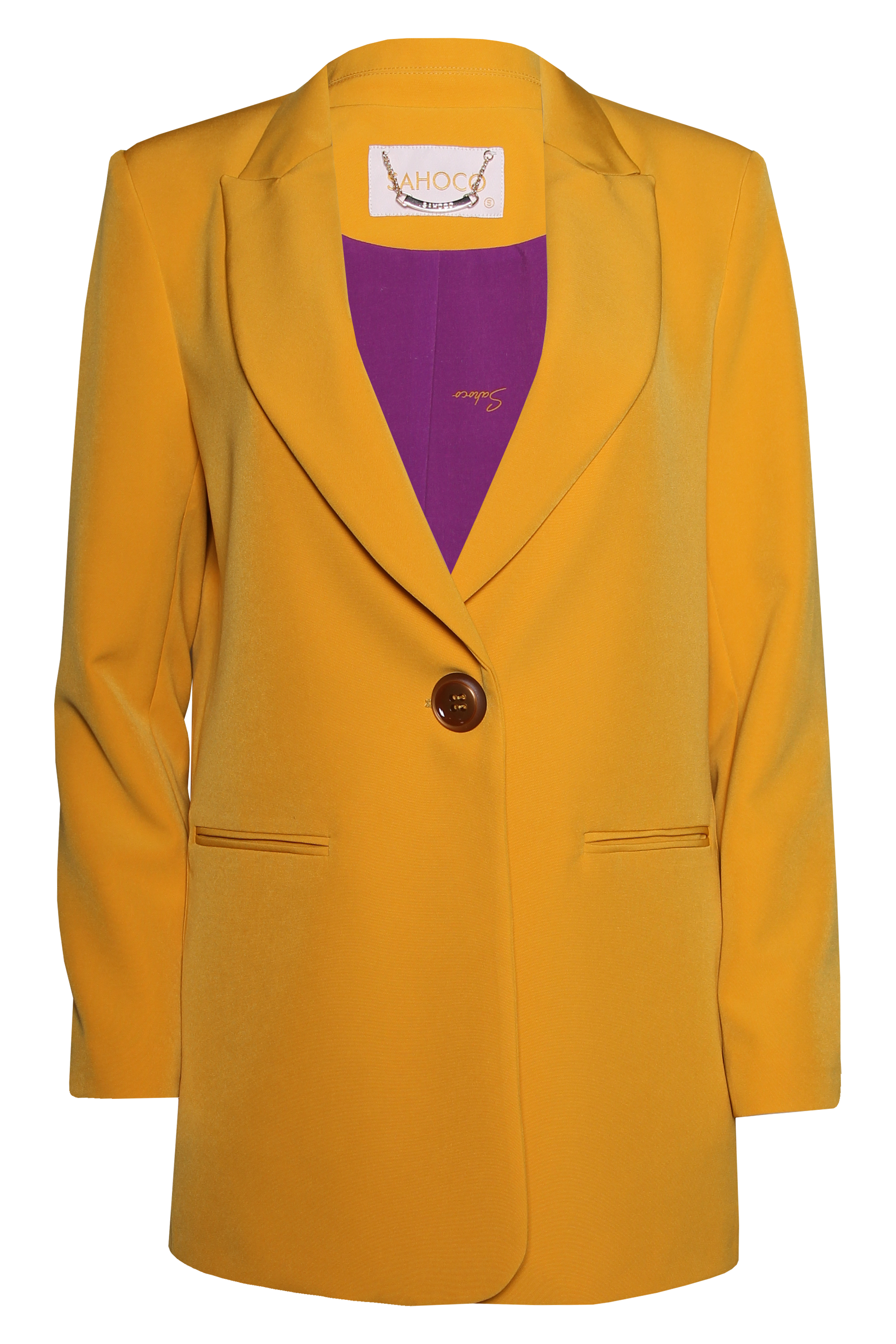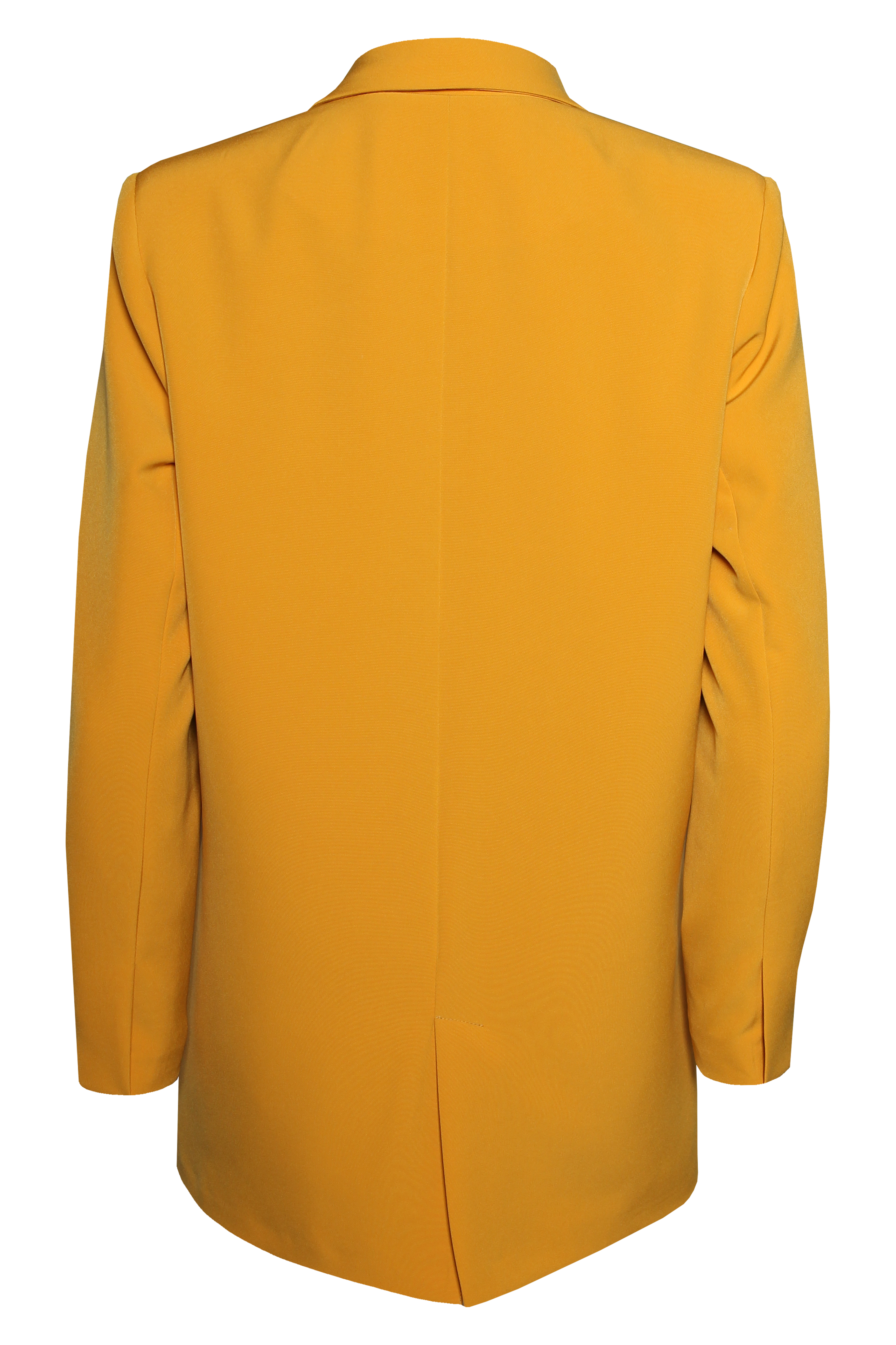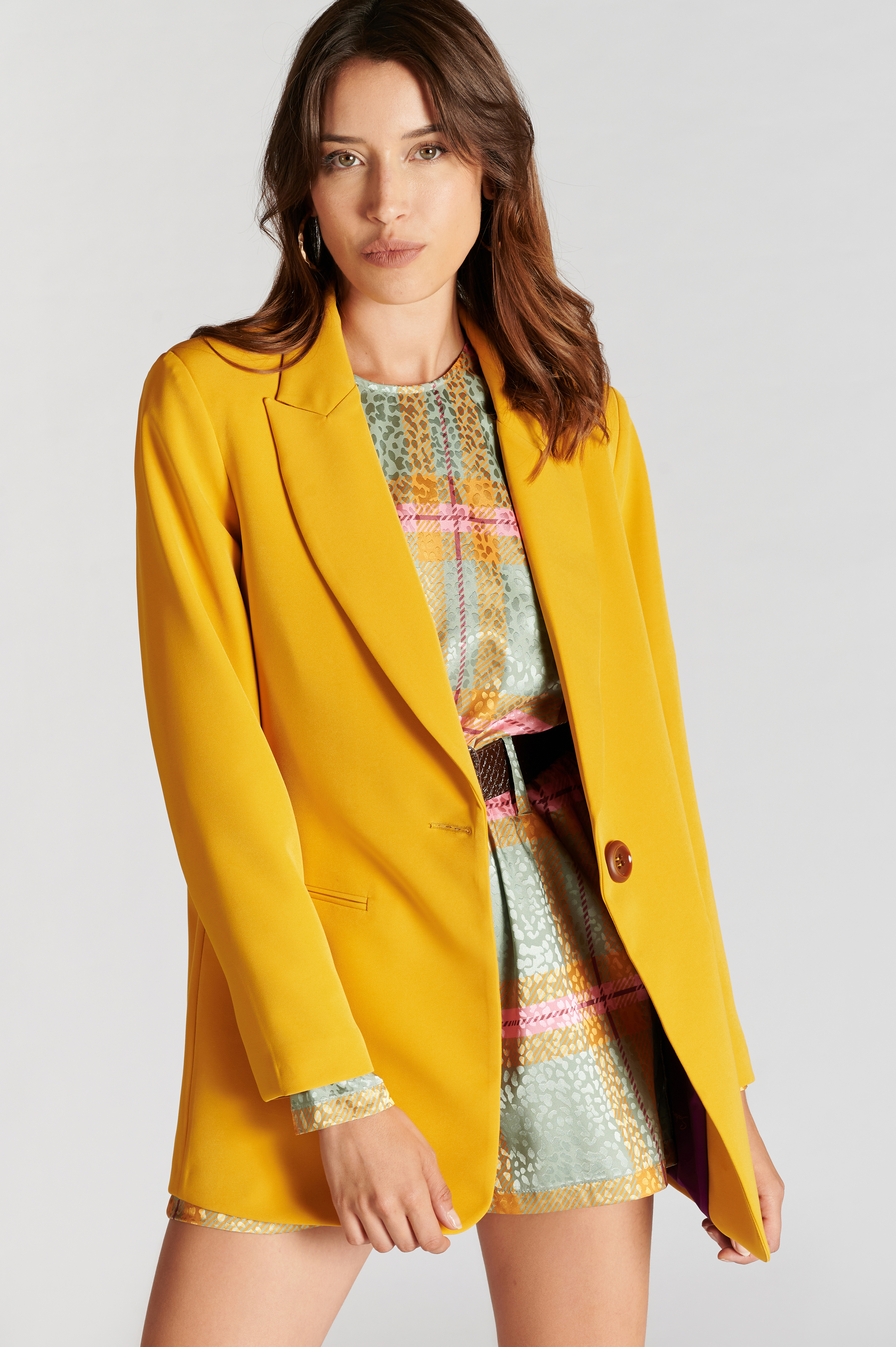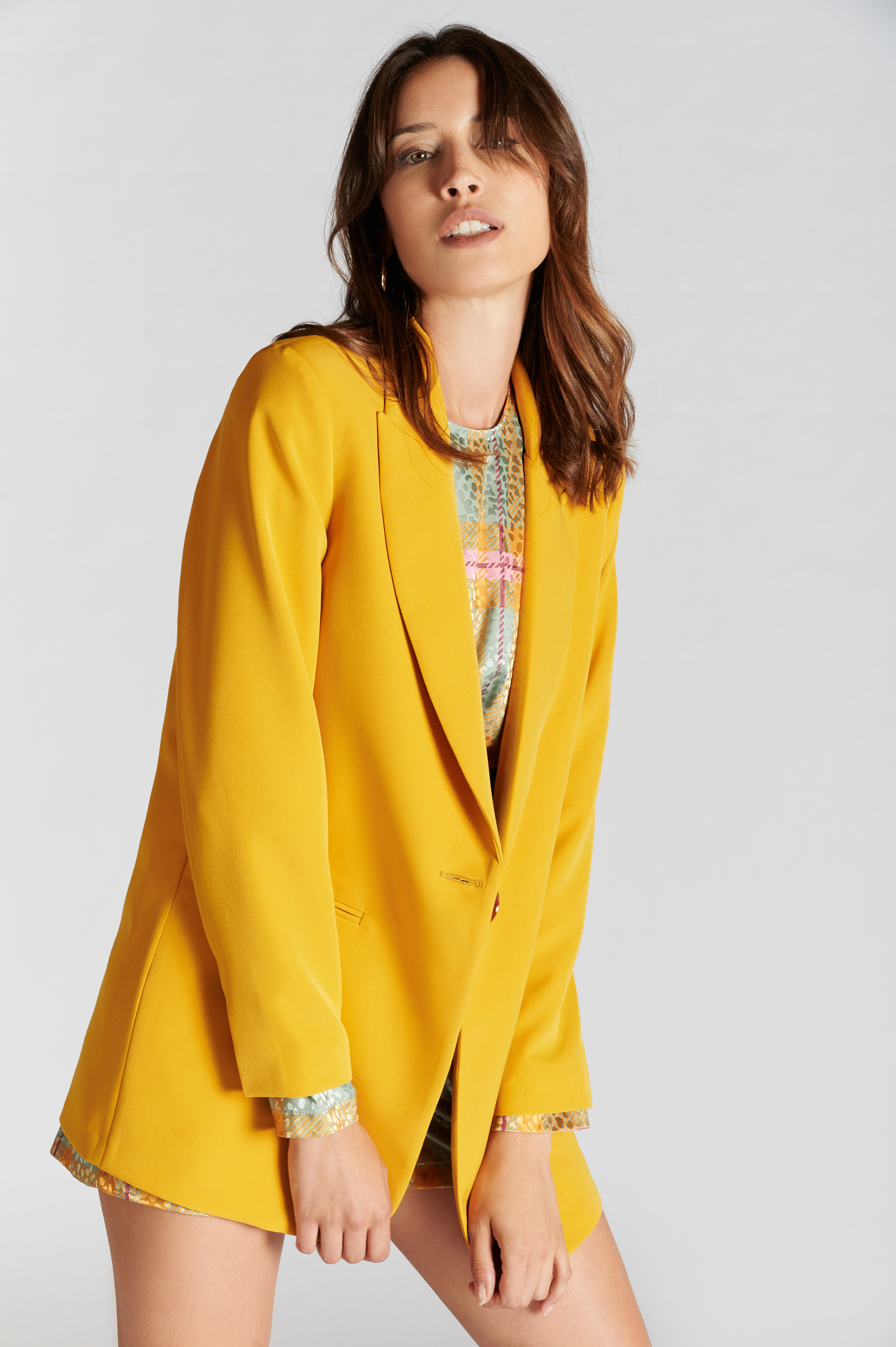 Blazer com gola de abas, ombros marcados e frente cruzada. Bolsos falsos de aba. Fecho frontal mediante botões.