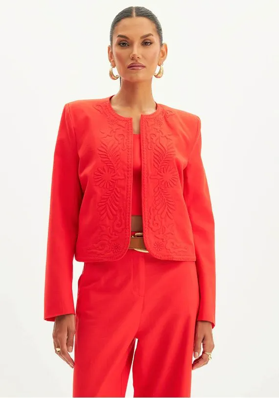 casaco curto apresenta bordados frontais que dão um toque de glamour. As ombreiras estruturam a peça. Aposte nessa opção para looks elegantes e atemporai