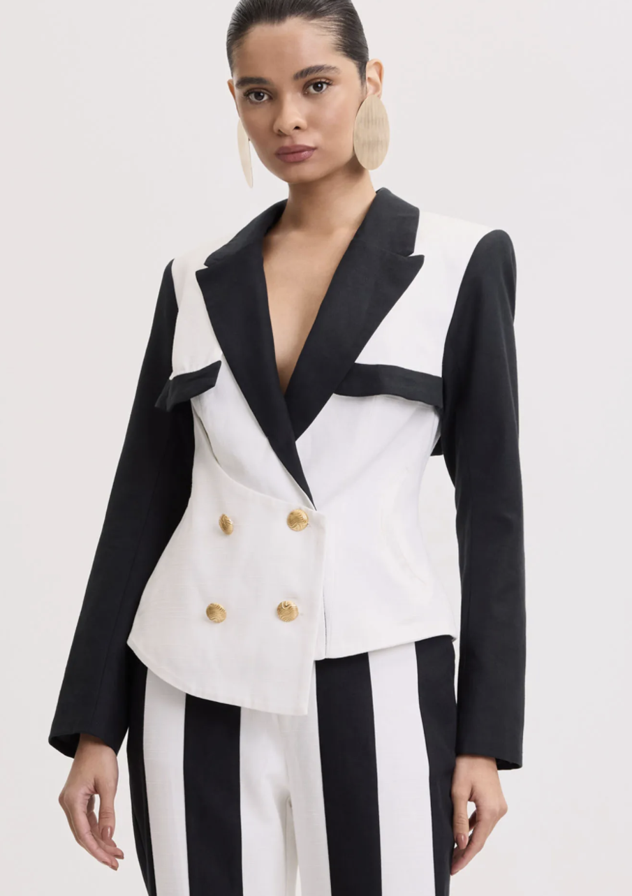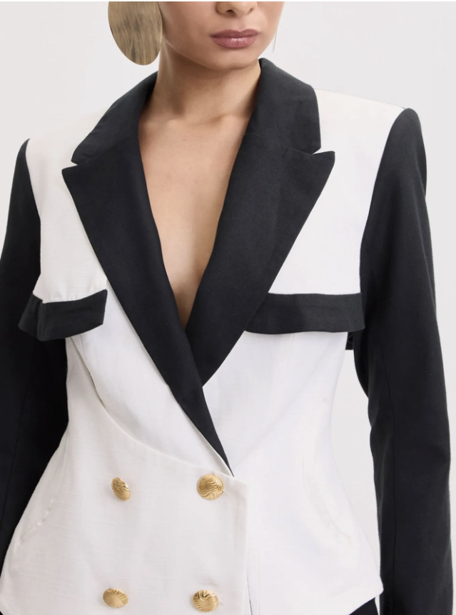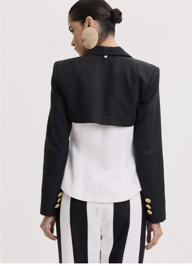 O blazer de alfaiataria combina elegância e modernidade com sua sobreposição impecável. Possui