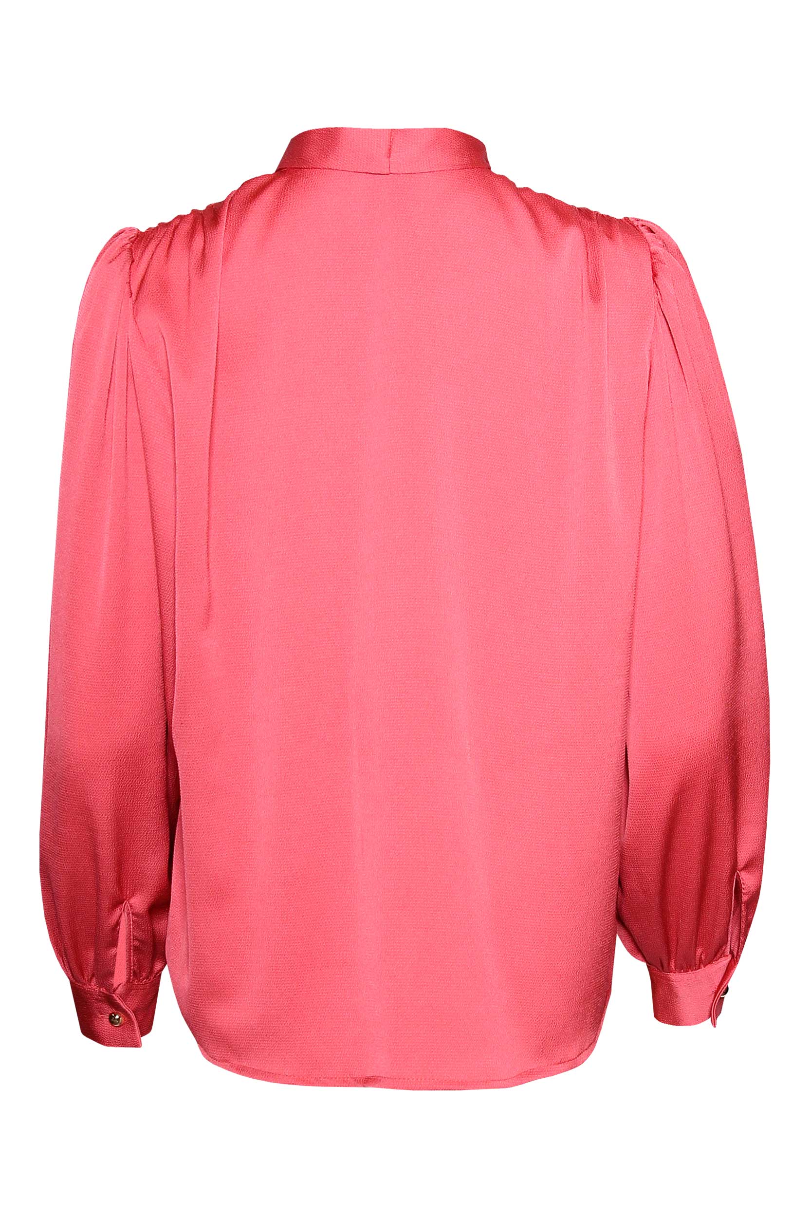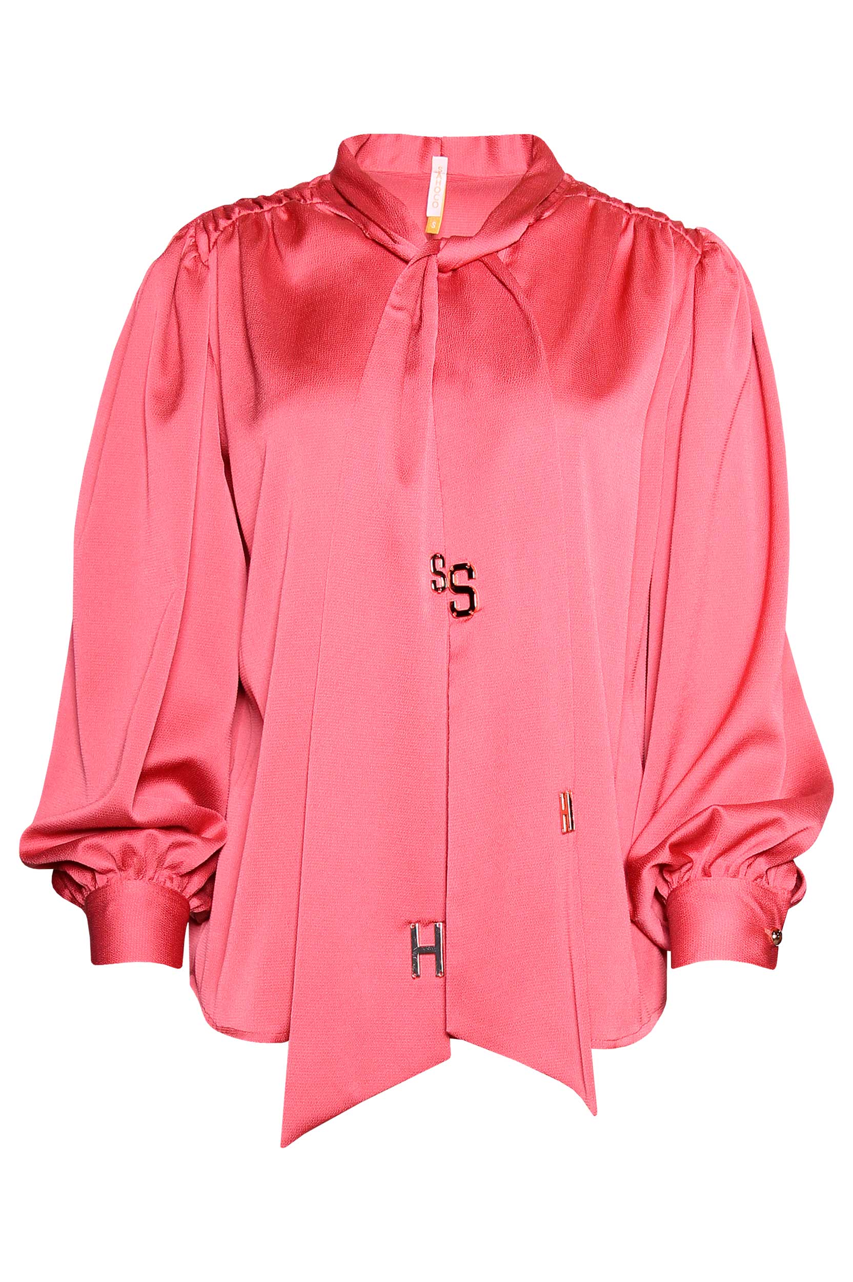Blusa acetinada com laço, e mangas compridas terminadas em punho ligeiramente abalonadas. Detalhe franzido nos ombros e aplicações na gola.