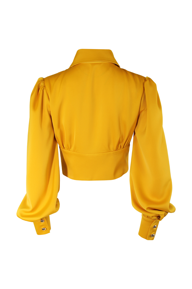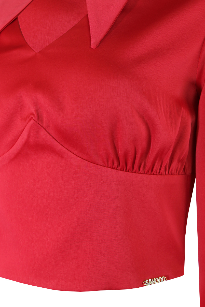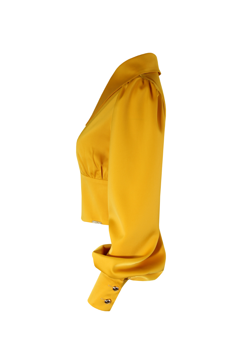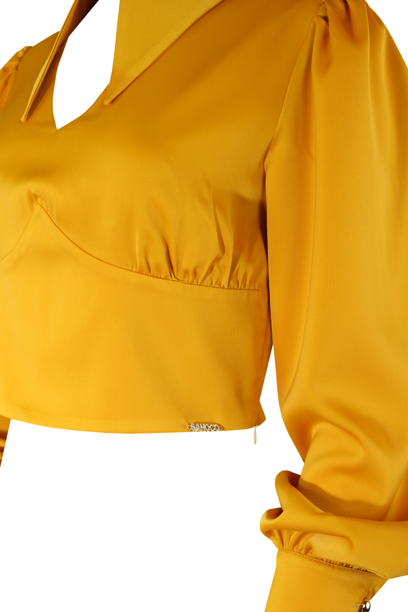 Blusa cropped. Pormenor de decote em bico com gola e fecho com botão dourado.