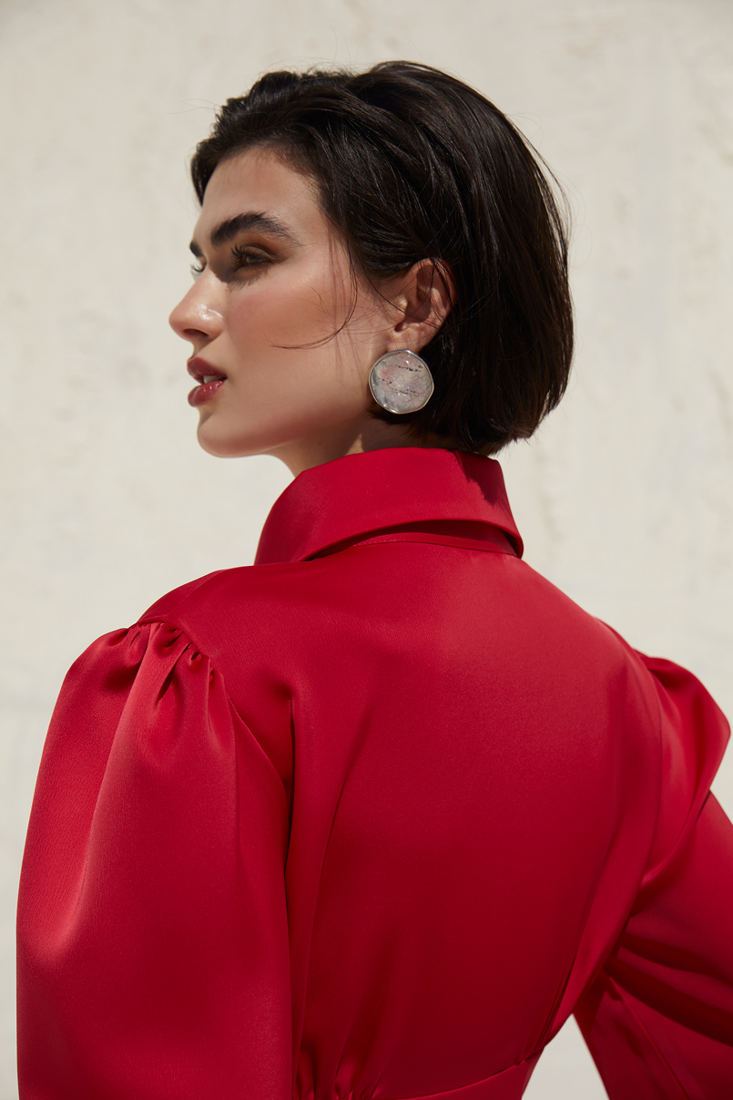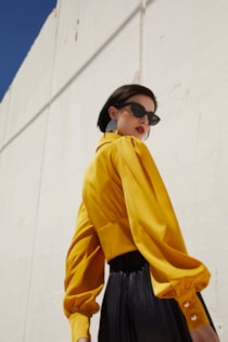Manga comprida acabada em punho largo com botões. Fecho lateral com fecho de correr oculto na costura.