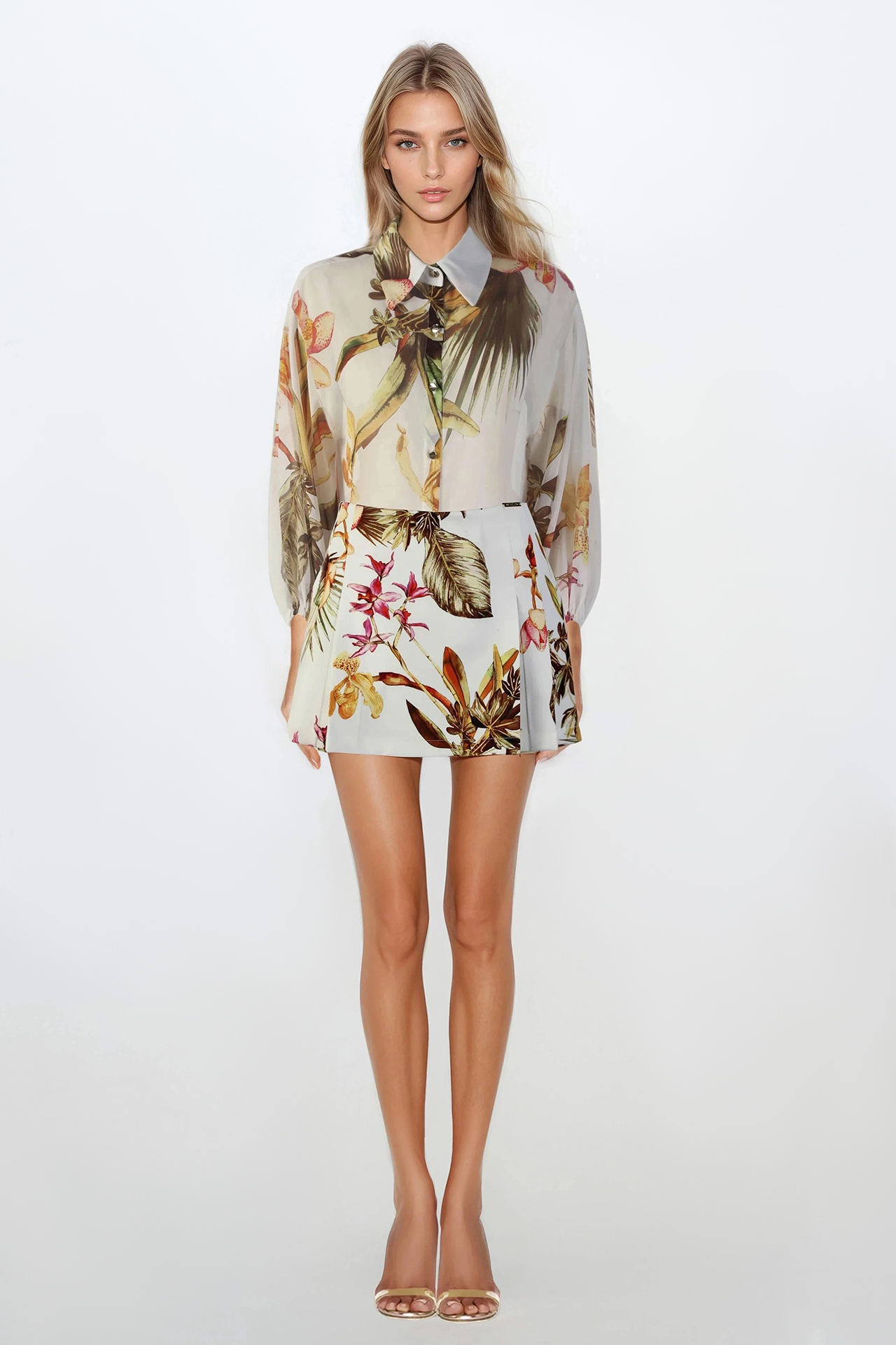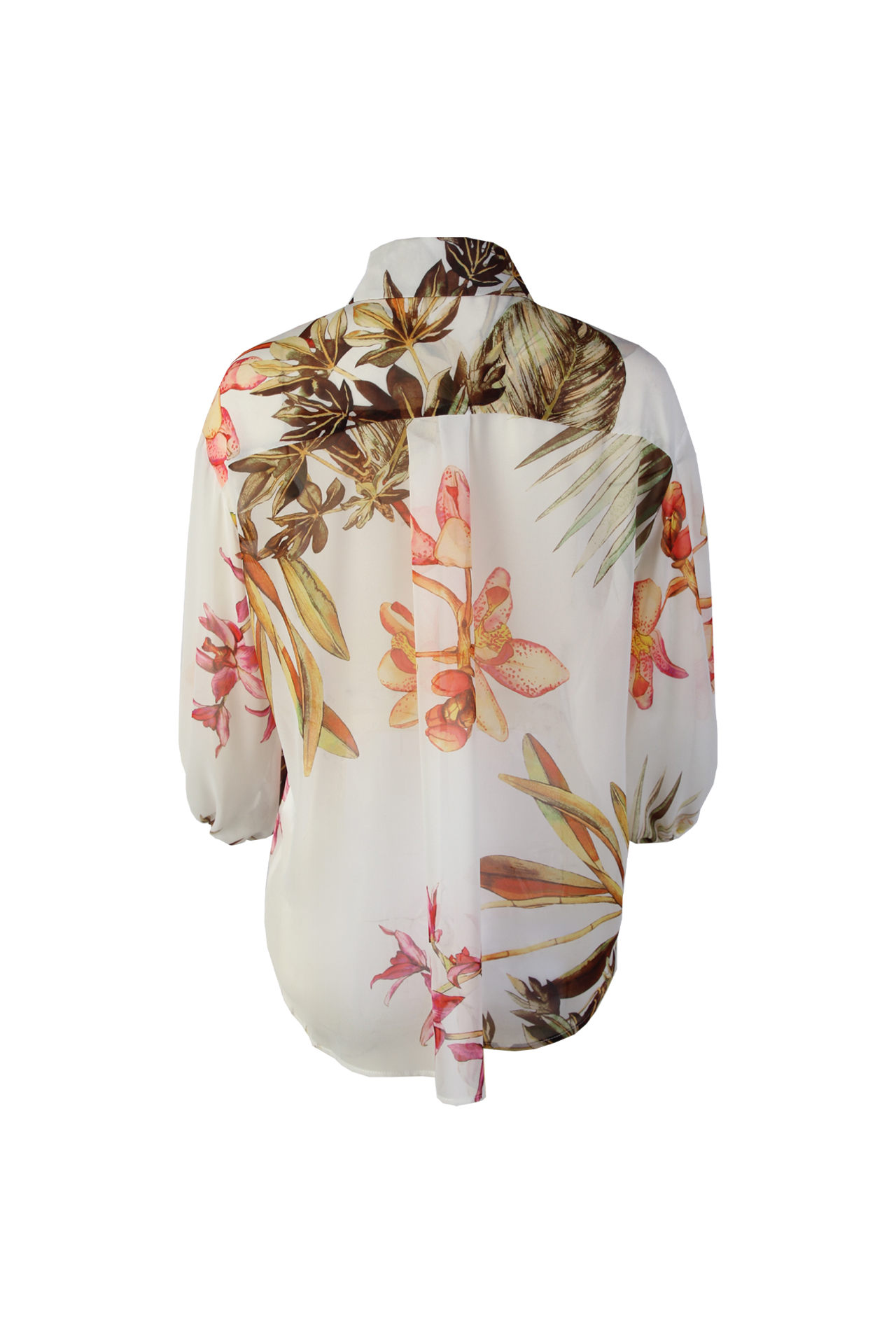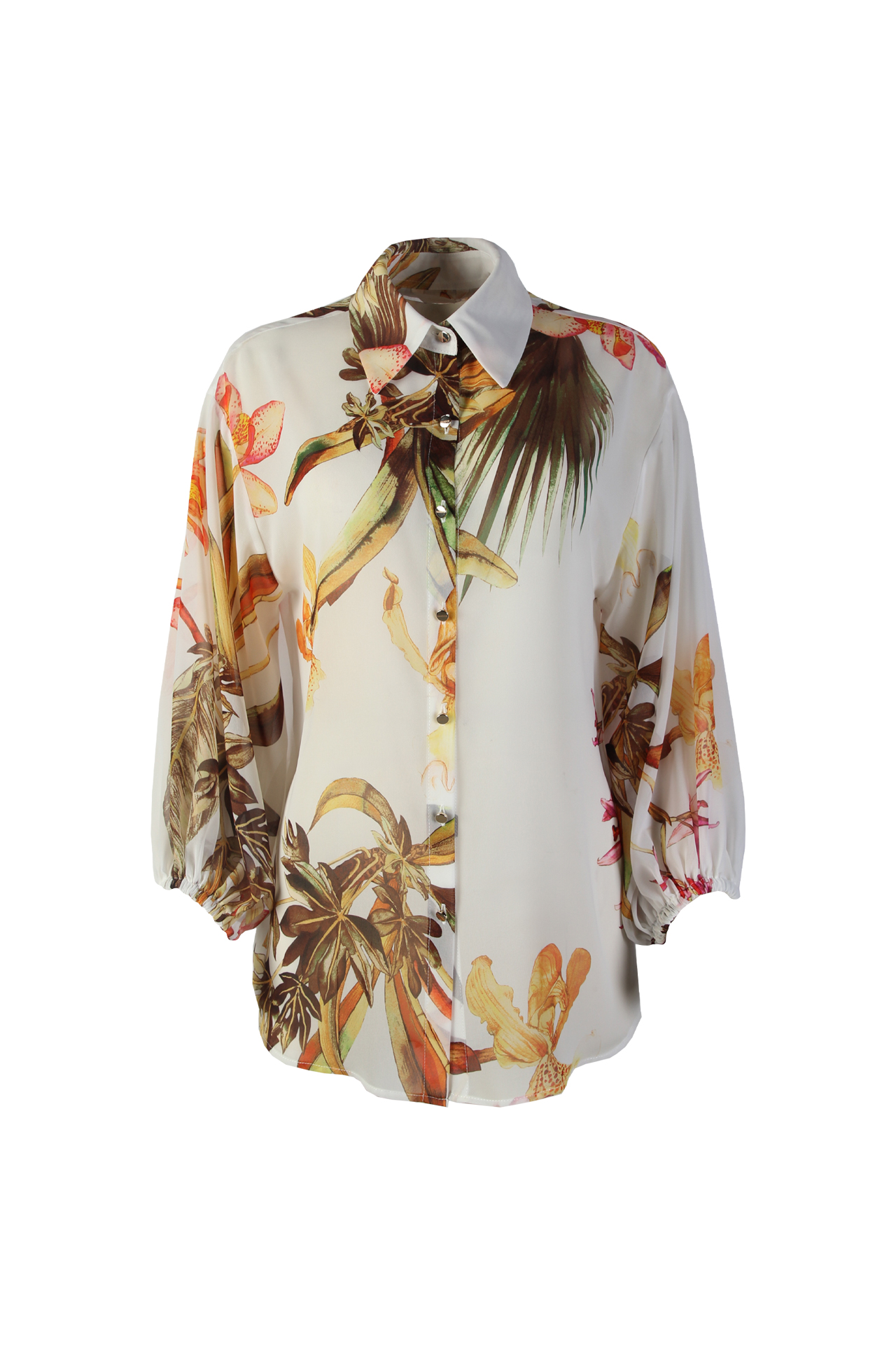 Camisa leve de silhueta solta, com estampa floral ou de bolas castanhas. Confeccionada num tecido semitransparente que oferece leveza e sofisticação, é complementada por botões dourados que acentuam o detalhe elegante da peça. O corte fluido e o colarinho clássico conferem versatilidade, ideal para coordenar com peças do mesmo padrão ou para um contraste contemporâneo.