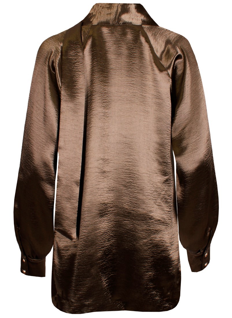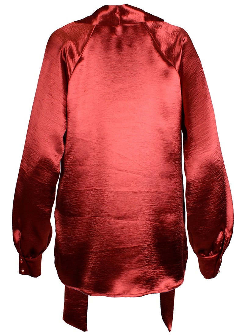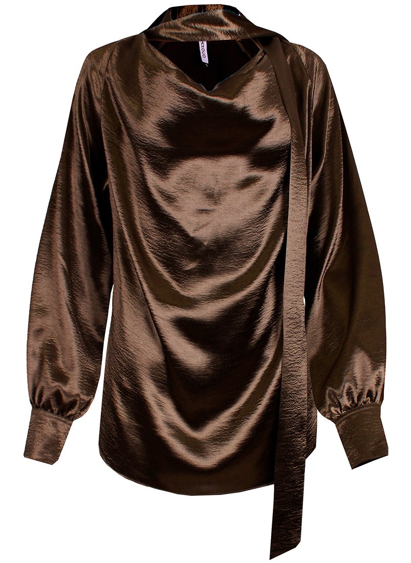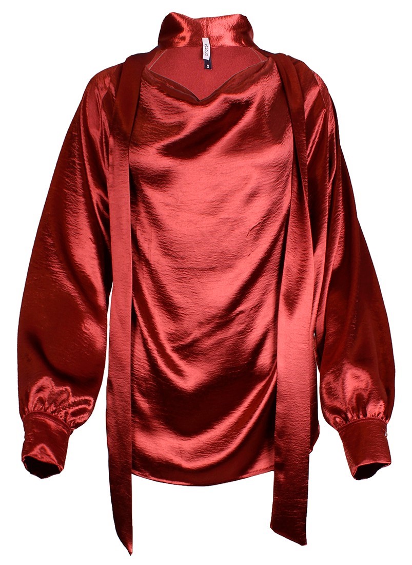 Blusa de gola subida acabada em laçada com manga comprida. Acabamento em punho.