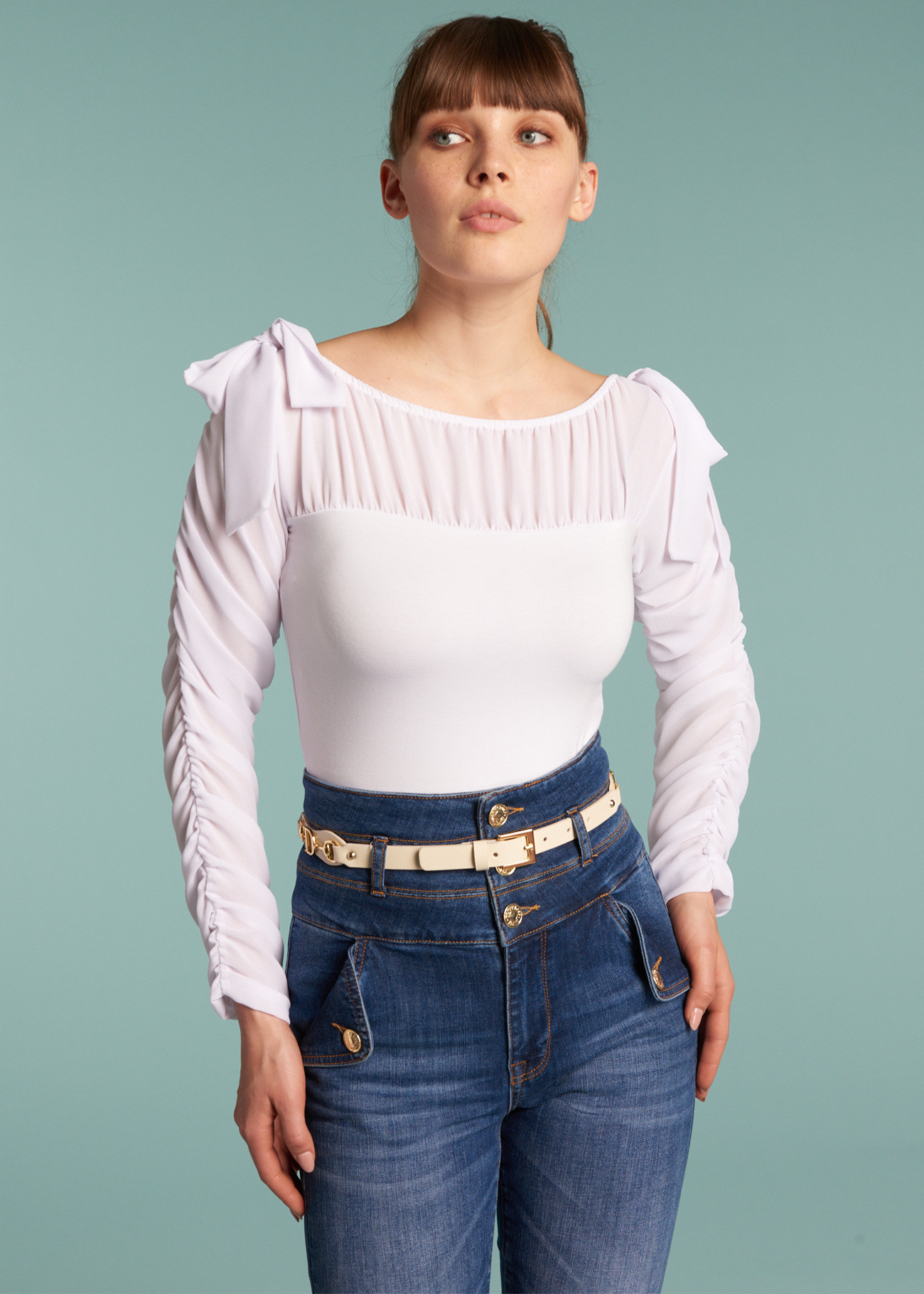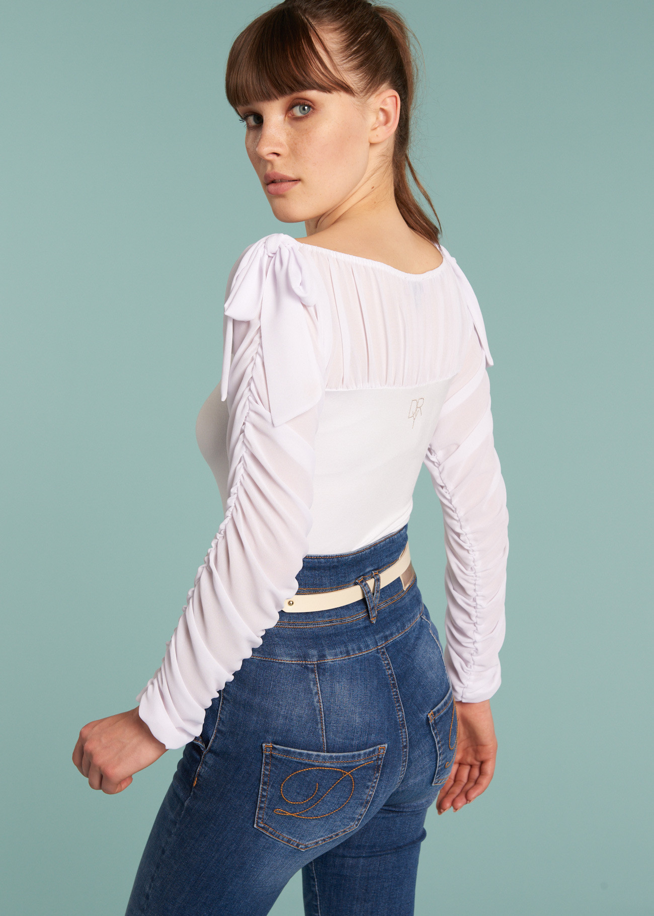 Blusa com cor única e pormenor de manga com folho e laço nos ombros