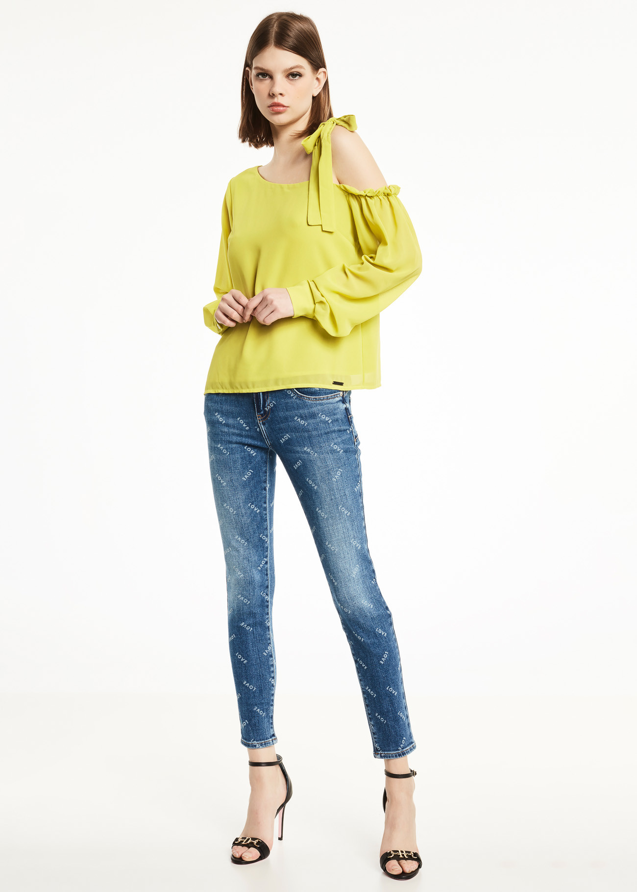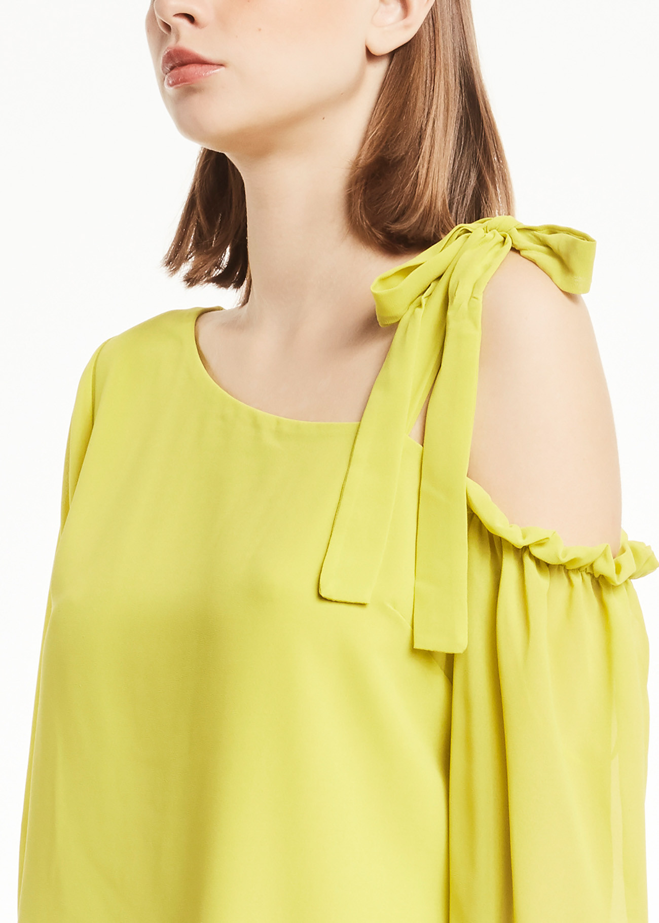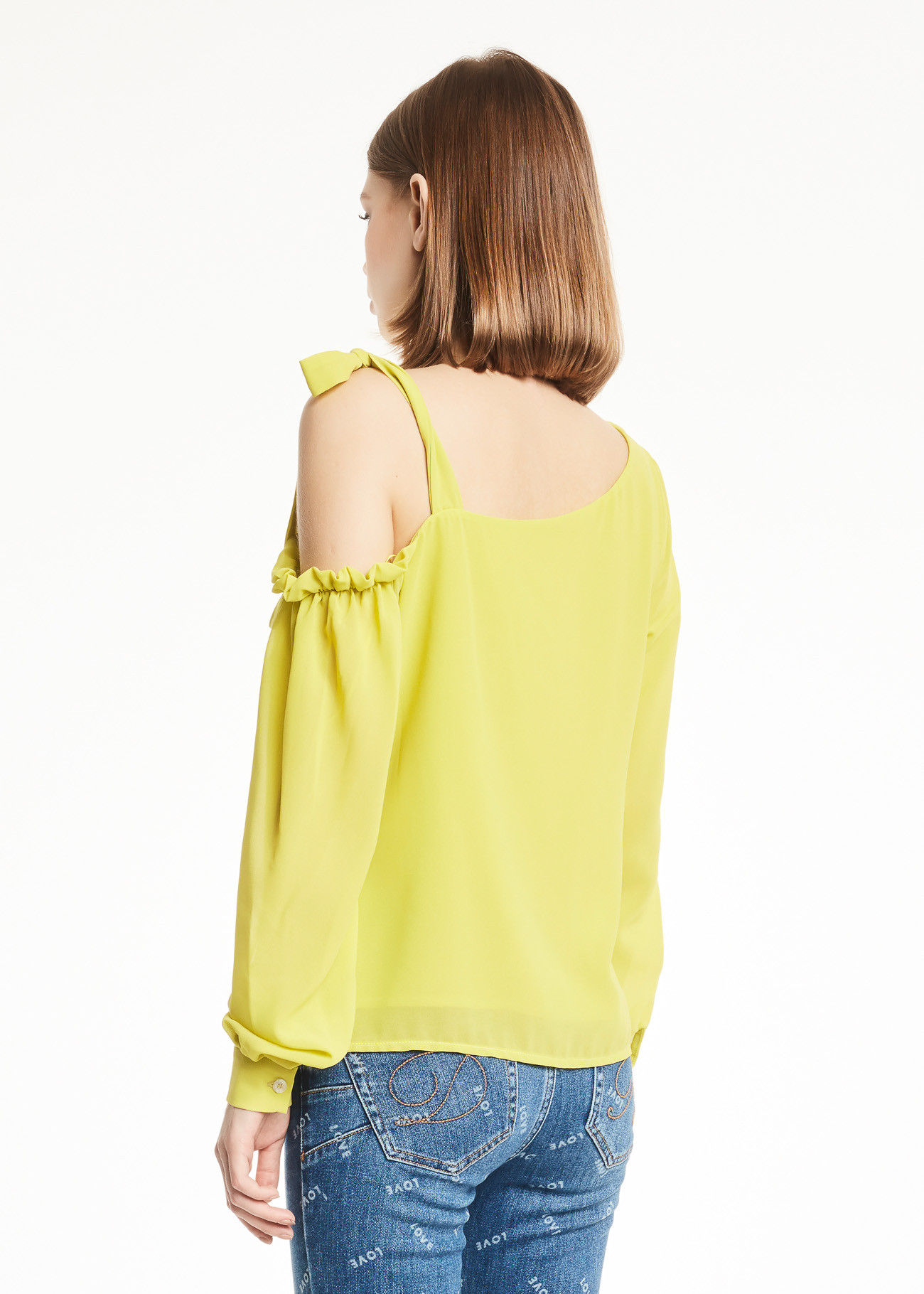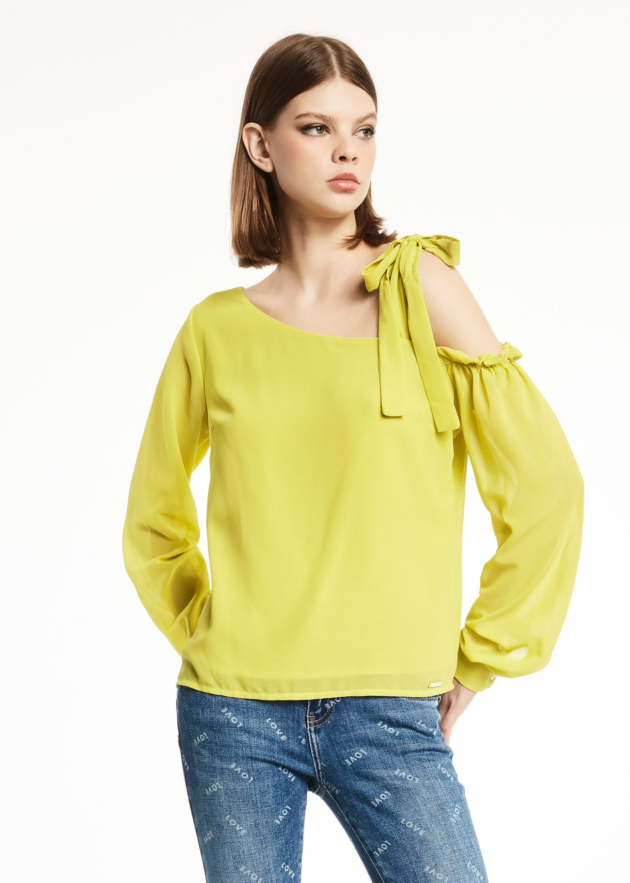 Blusa  linha A. Possui decote ombro único com acabamento em laço e mangas longas com leve corte balão.