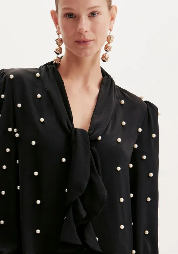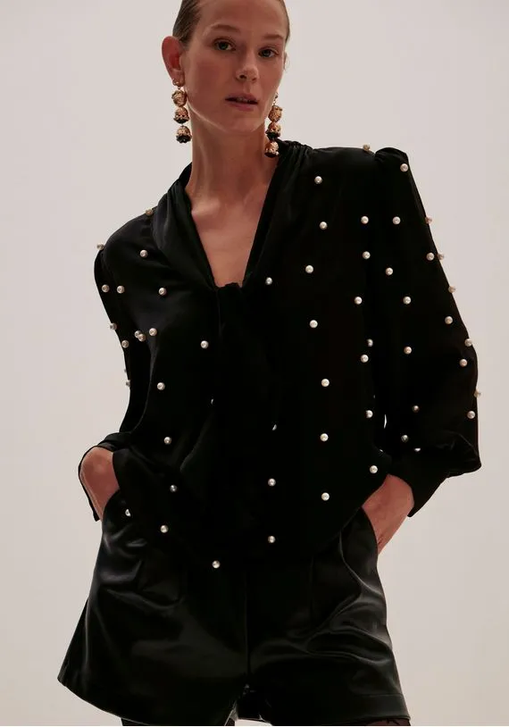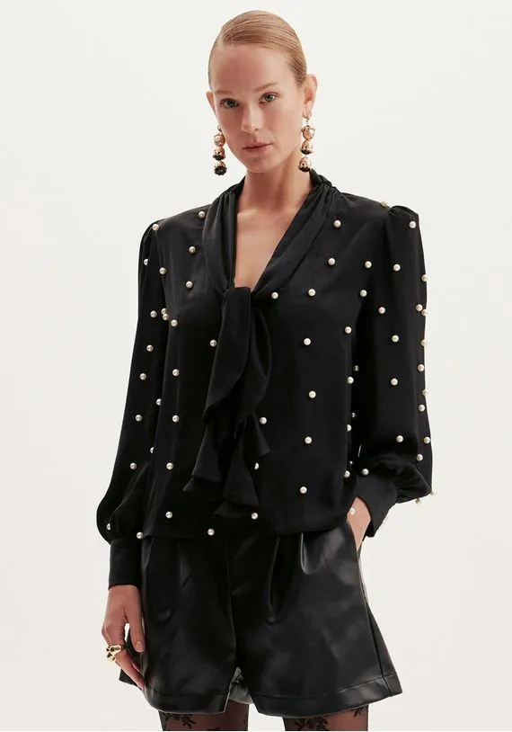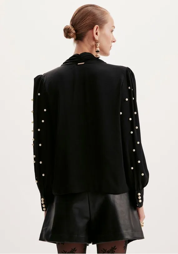 blusa de mangas longas possui aplicações de pérolas e detalhe com babados no decote. Elegante e clássica, é uma aposta que vai destacar seu look!