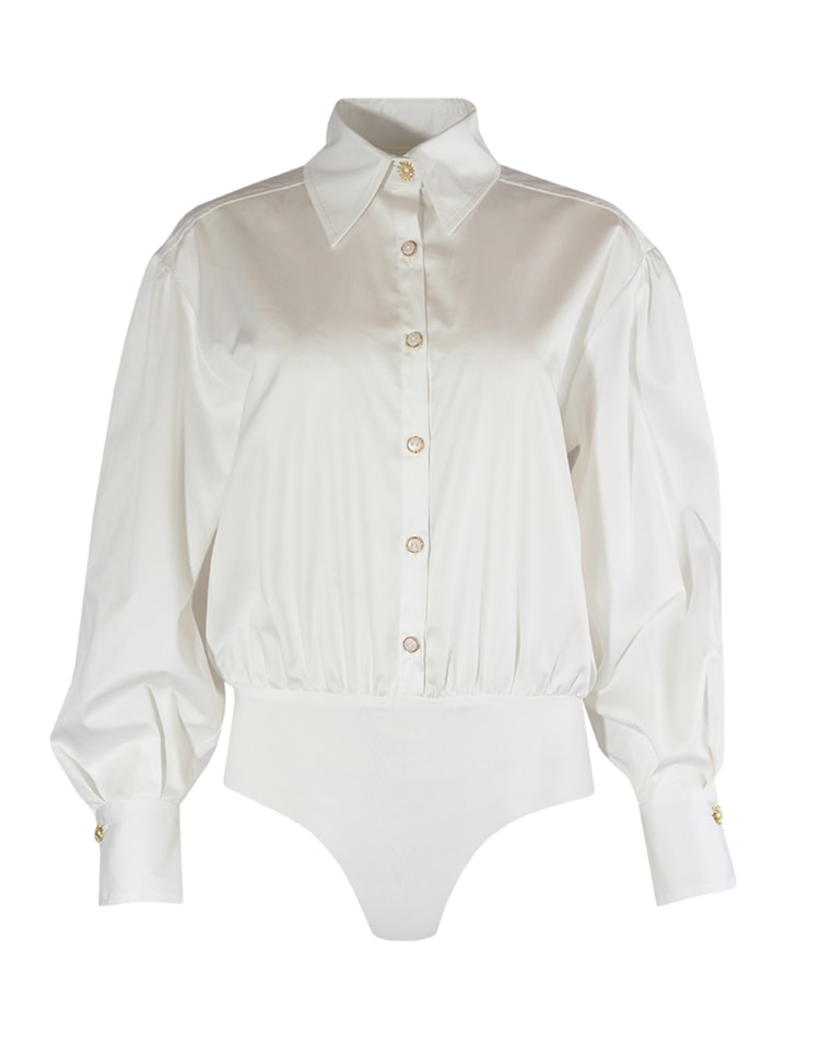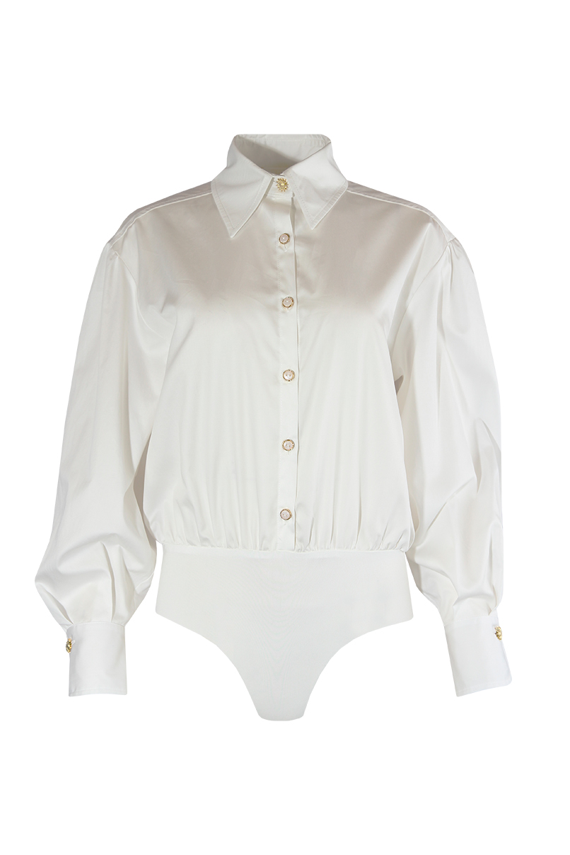 Camisa confecionada em tecido de algodão. Gola de lapela e manga comprida acabada em punho. Fecho frontal com botões e fecho em baixo com botões de pressão.