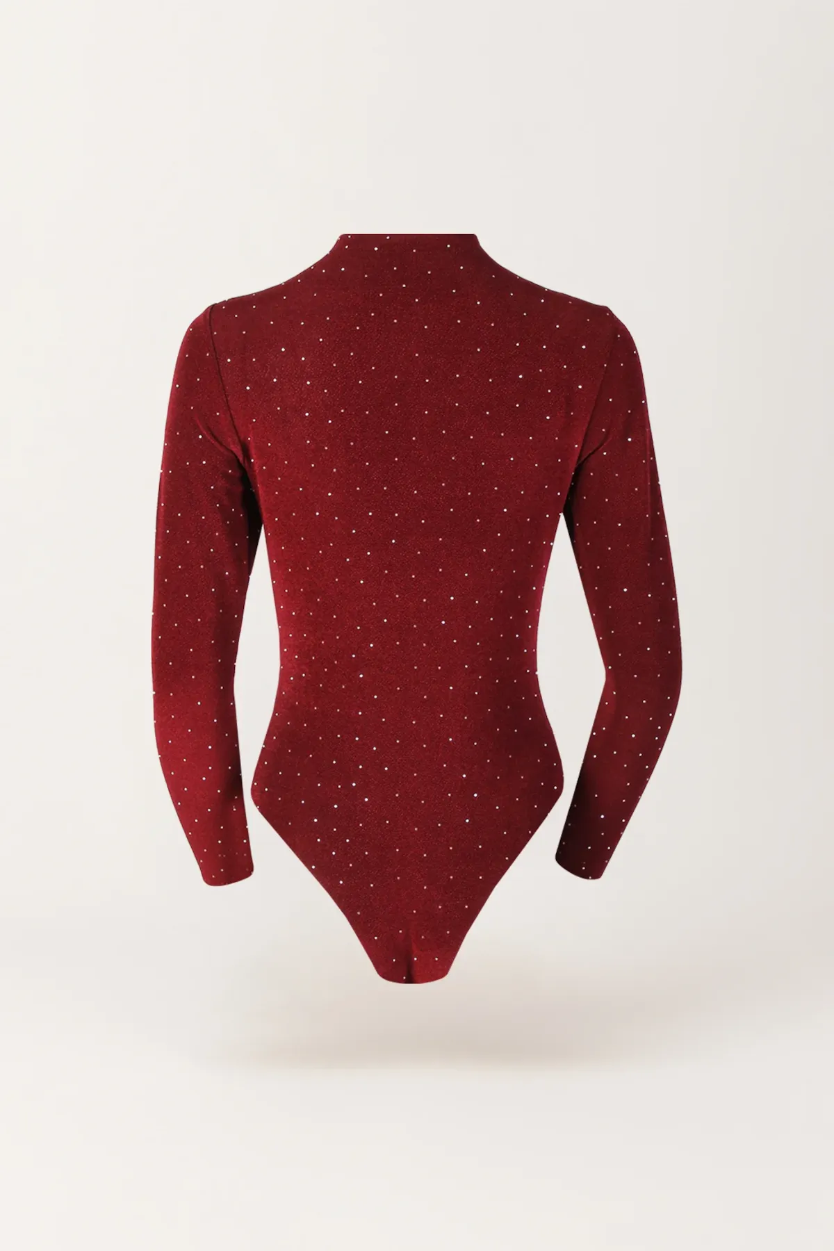 Body em malha fina aveludada com microbrilhos aplicados diretamente no fio, criando um reflexo subtil que acompanha o movimento. O recorte geométrico é formado por uma faixa cruzada que estrutura o decote e destaca a linha dos ombros. A malha elástica oferece ajuste firme mas confortável, mantendo o desenho limpo da peça. Base com fecho de pressão para maior funcionalidade.