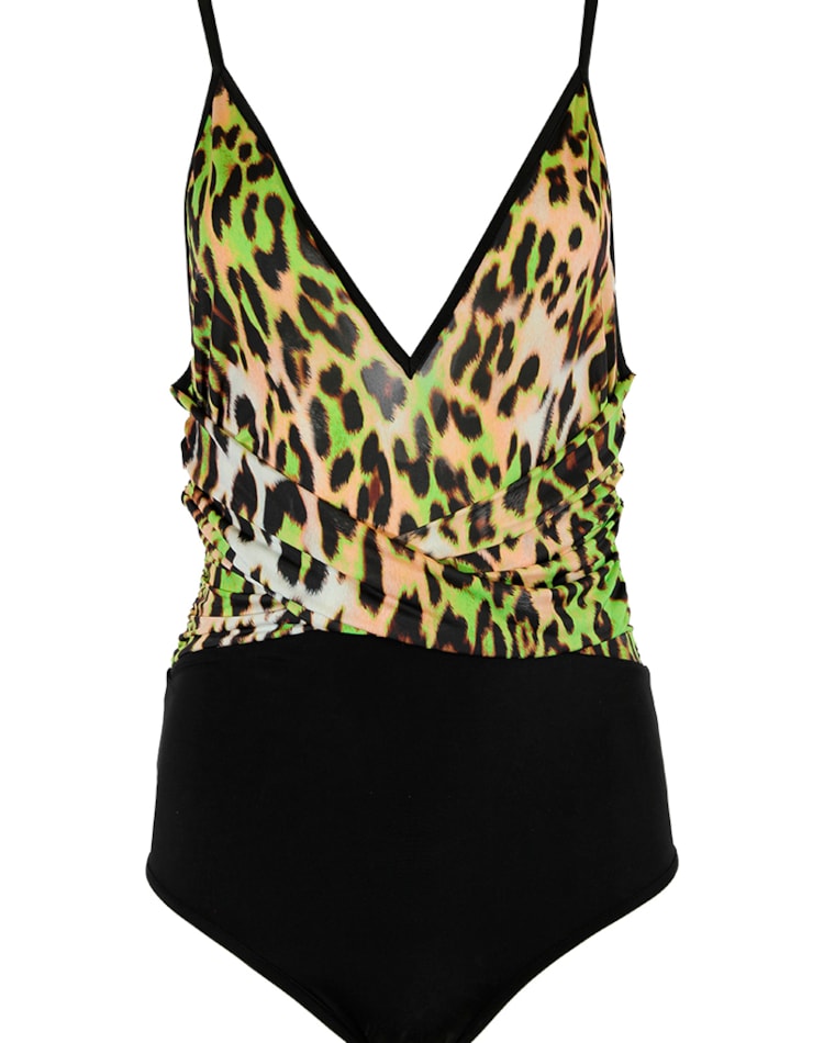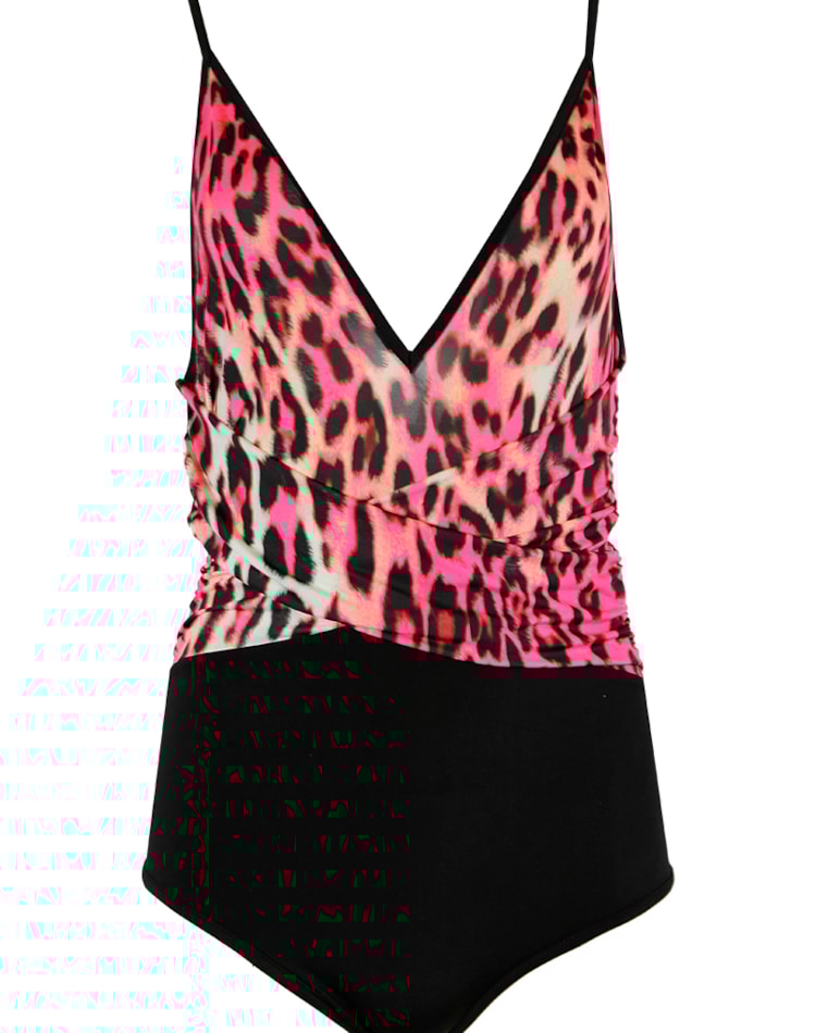 Body confecionado com tecido elástico estampado. Decote em bico. Alças finas.Tecido drapeado. Fecho em baixo com botões de pressão