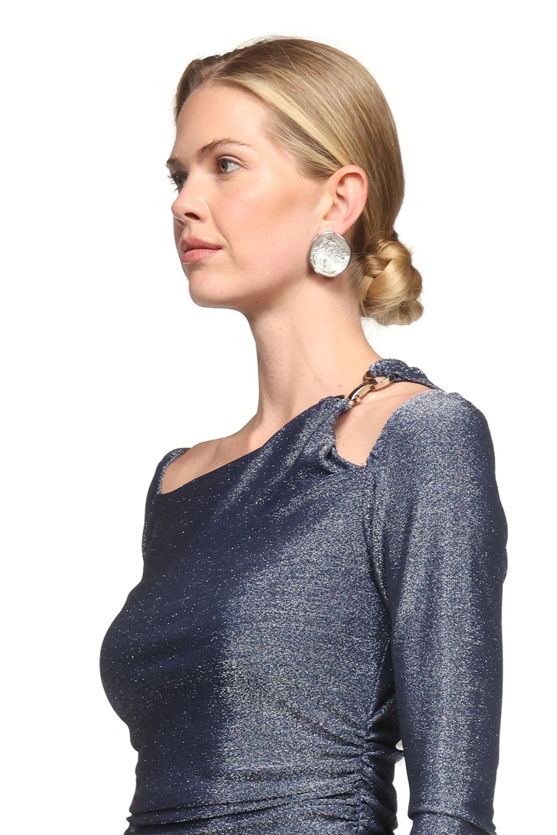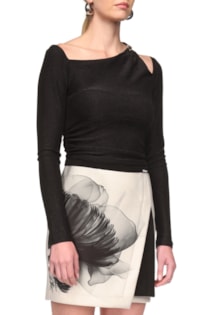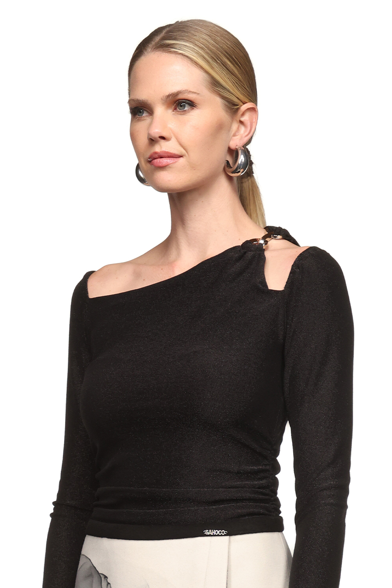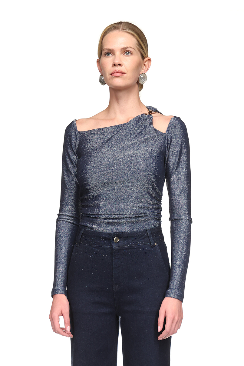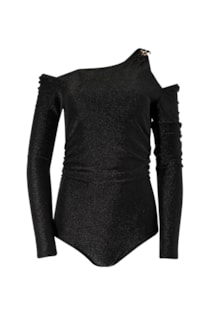 Body justo confecionado com tecido em mistura de poliamida. Decote redondo e manga comprida. Fecho na parte inferior com botões de clipe. Pormenor cut out no ombro com aplicação em metal.