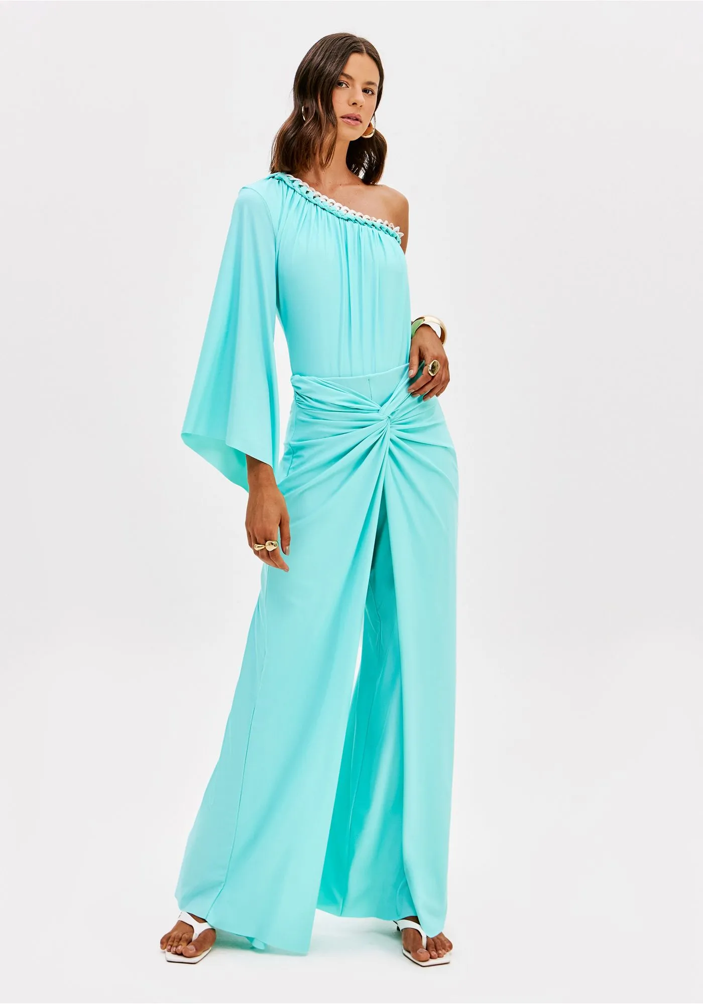Confeccionado em malha leve, o body com modelagem de um ombro só tem shape justo ao corpo e manga longa fluida que traz movimento ao visual. O decote é finalizado com aplicação de corrente, criando um detalhe de impacto. Essencial para um look ousado!