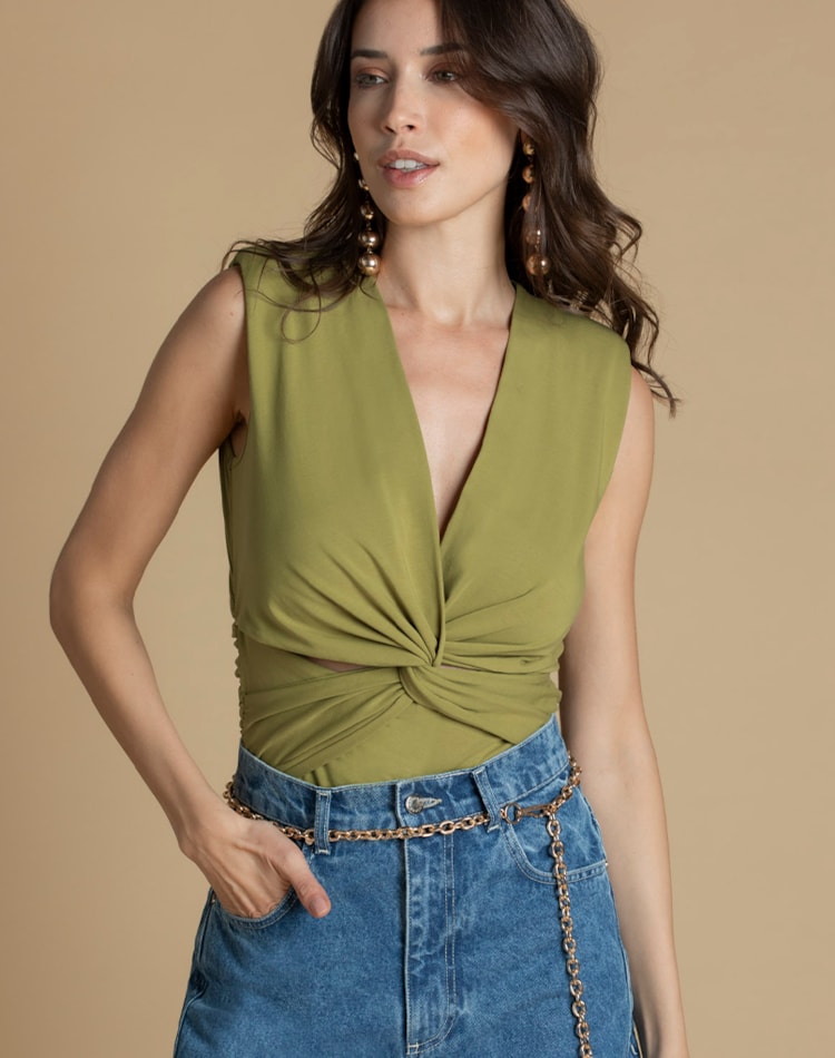 Body em algodão. Decote em bico e manga cava. Detalhe de nó franzido com abertura. Fecho em baixo com botões de pressão.