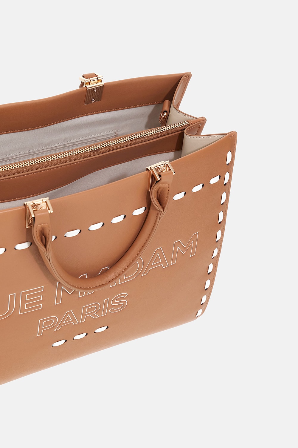 Bolsa tote em couro sintético macio com design moderno e elegante, apresentando um logotipo em relevo e impresso, além de costura contrastante para um toque de personalidade. Possui alças em couro sintético com detalhes metálicos dourados da marca e uma alça de ombro dupla para diversas opções de uso. O interior inclui um bolso central com zíper em couro sintético e forro de algodão com um bolso interno para melhor organização. Dimensões: L 35 cm × A 27 cm × P 15 cm.