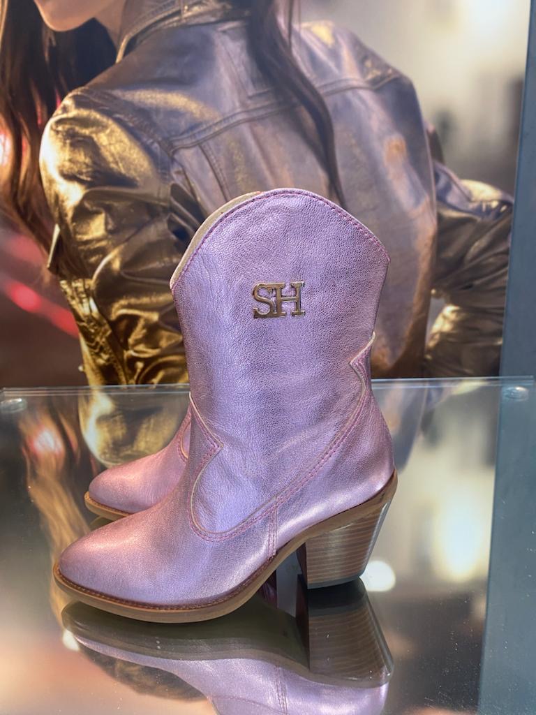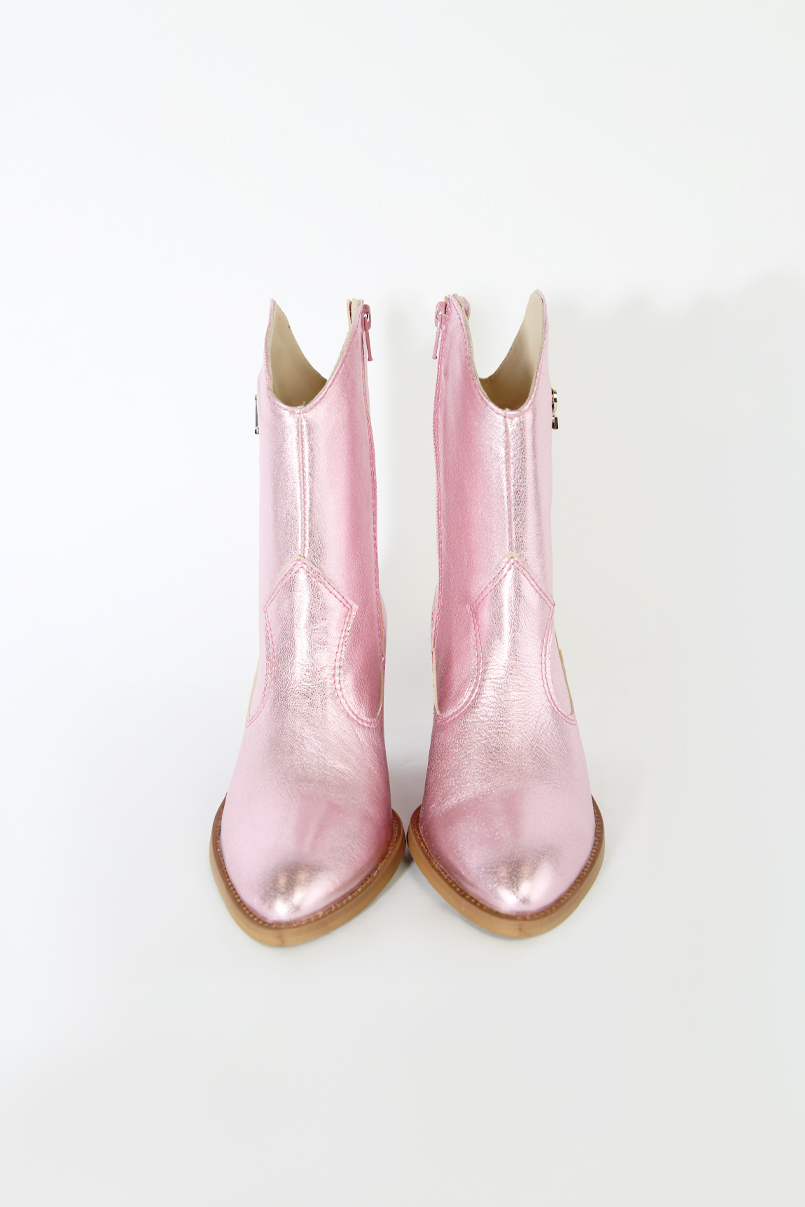 Sapato tipo bota de cano médio em pele efeito metalizado. Estilo cowboy.