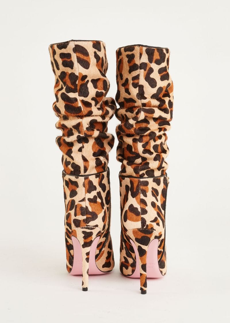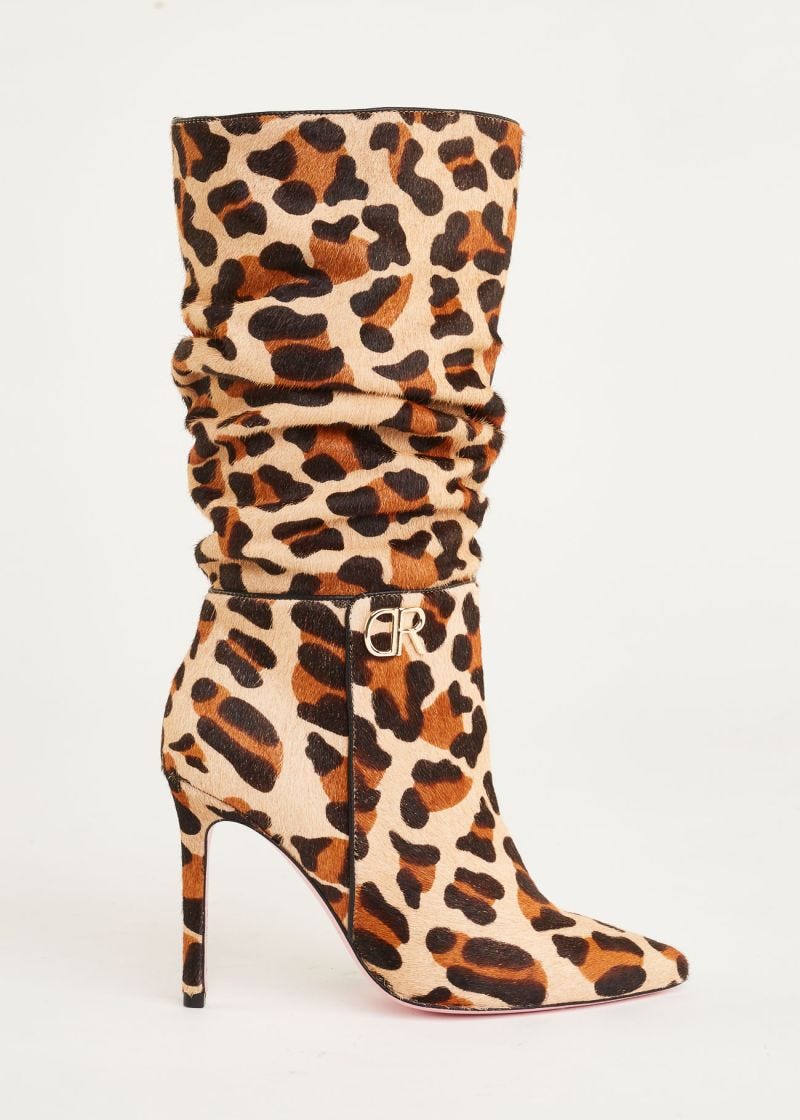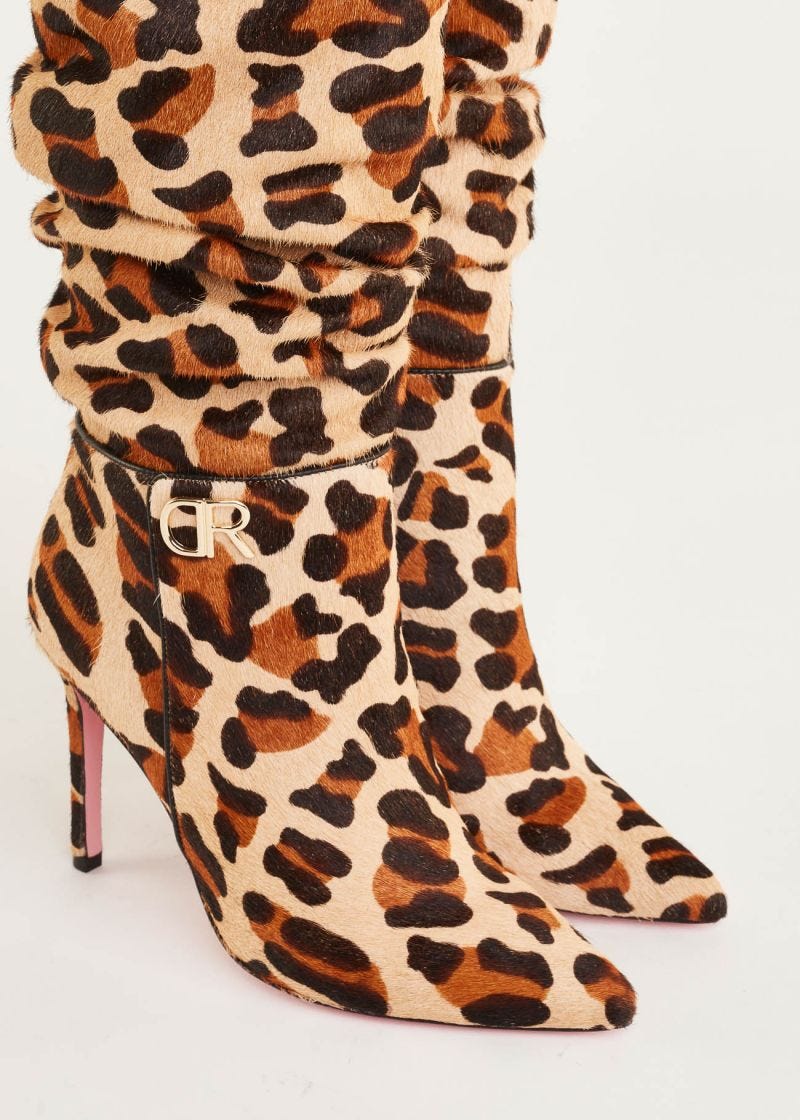 Bota com biqueira afunilada, bootleg franzido e acessório DR de metal. Com construção em pele de pônei com estampa animal e solado em couro, forro em Lycra® e palmilha em couro. Salto agulha forrado, 10 cm de altura.