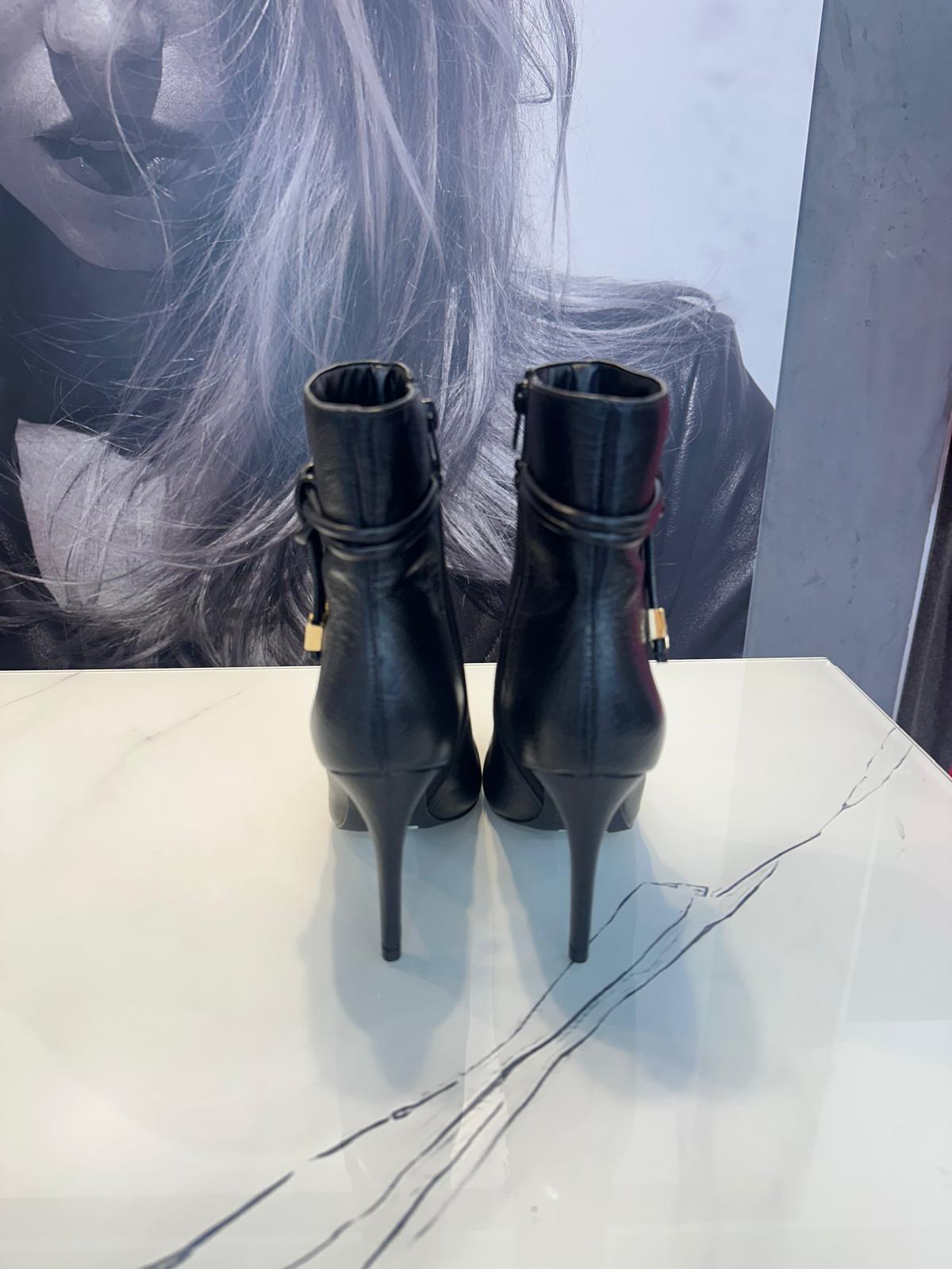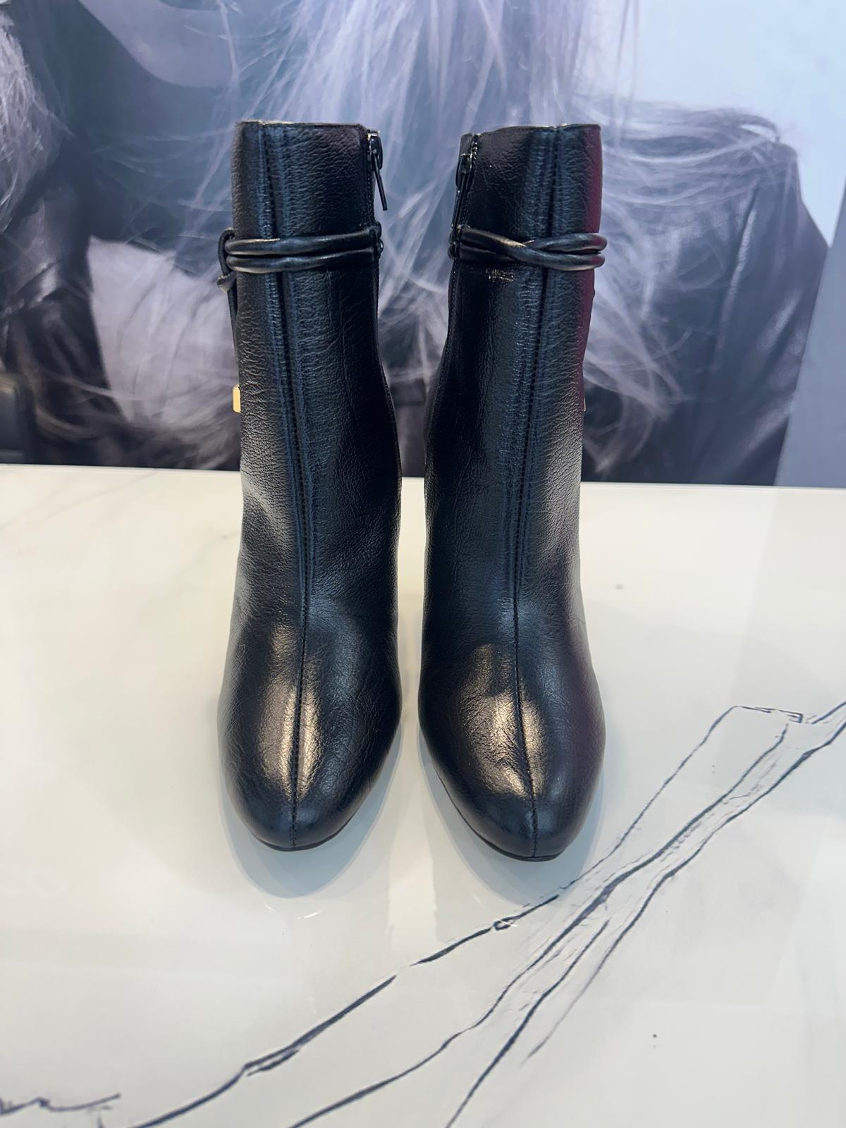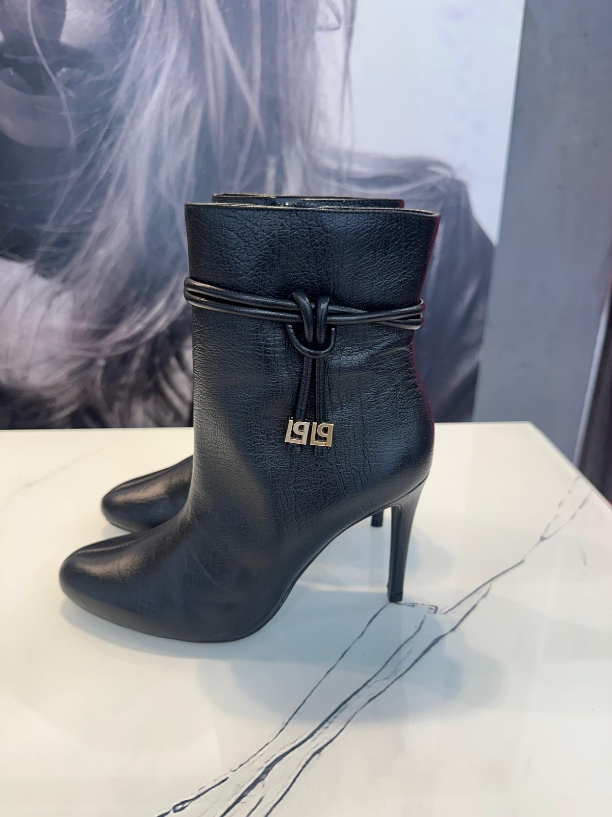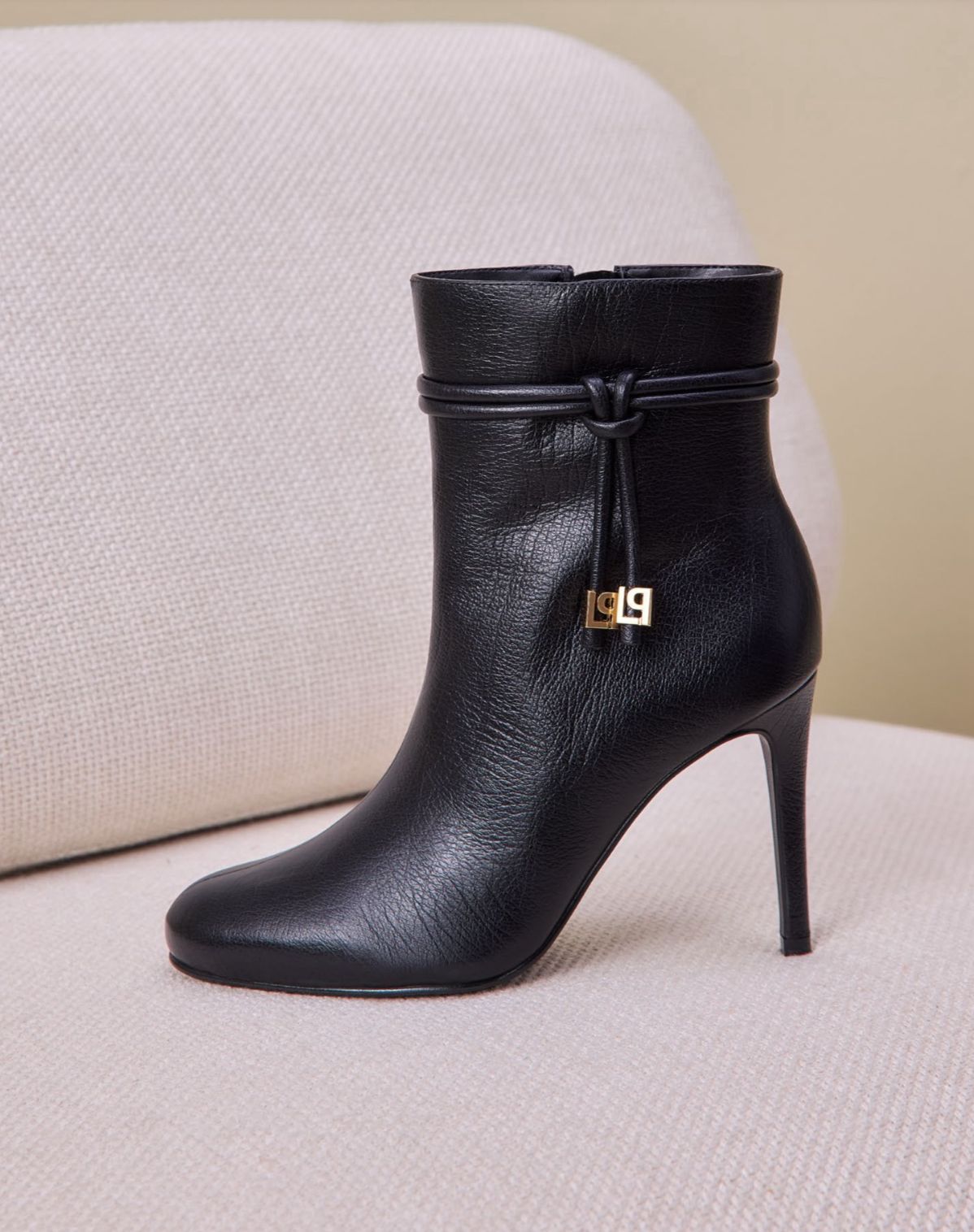 Sofisticada, a bota de cano curto apresenta salto alto, bico fino e fechamento por zíper lateral. O enfeite de logo vazado adiciona um toque final de elegância e exclusividade ao design. Invista!