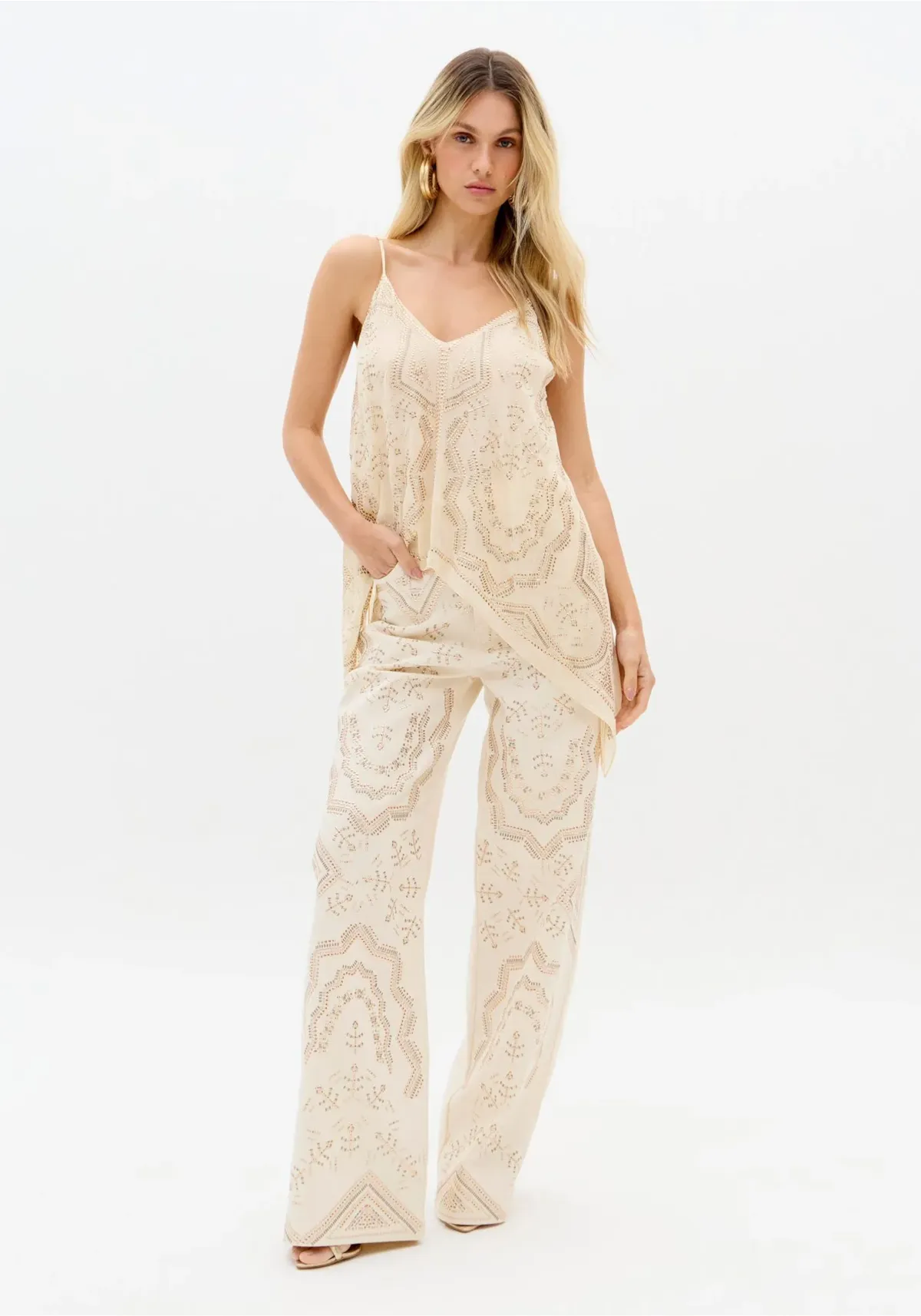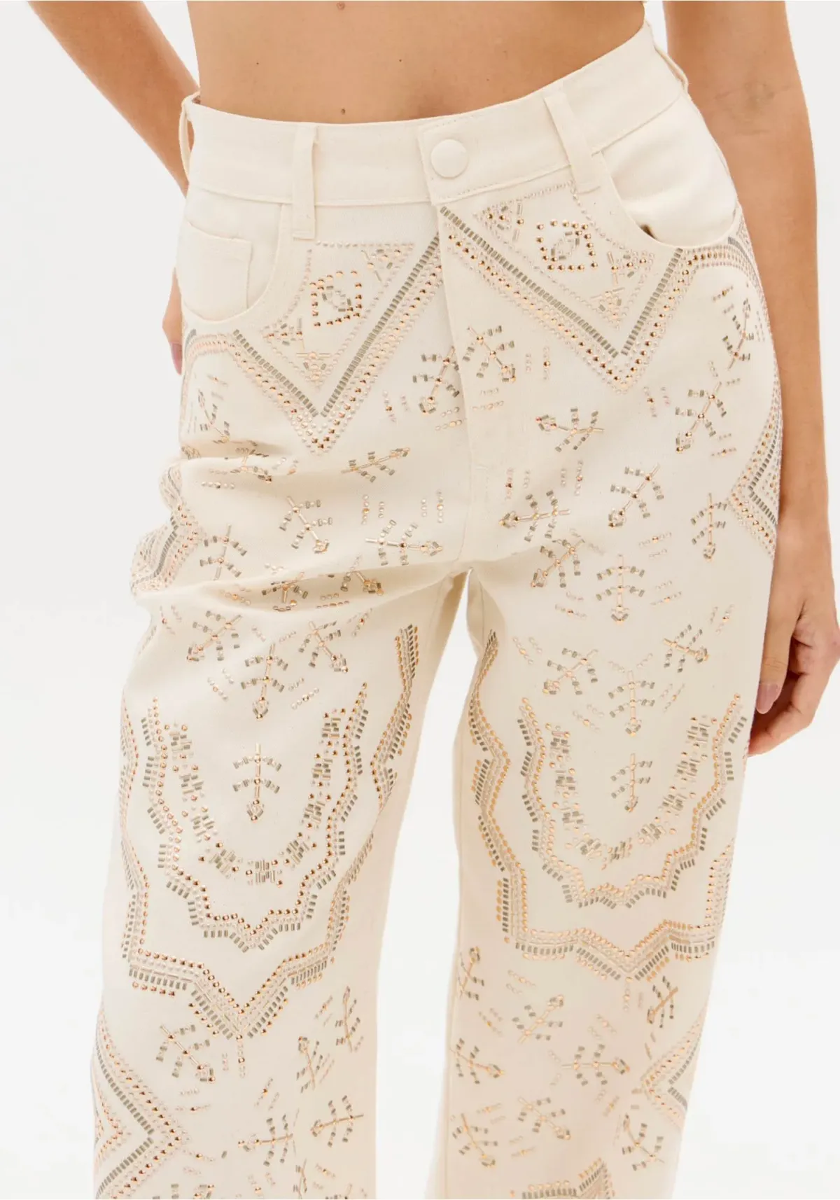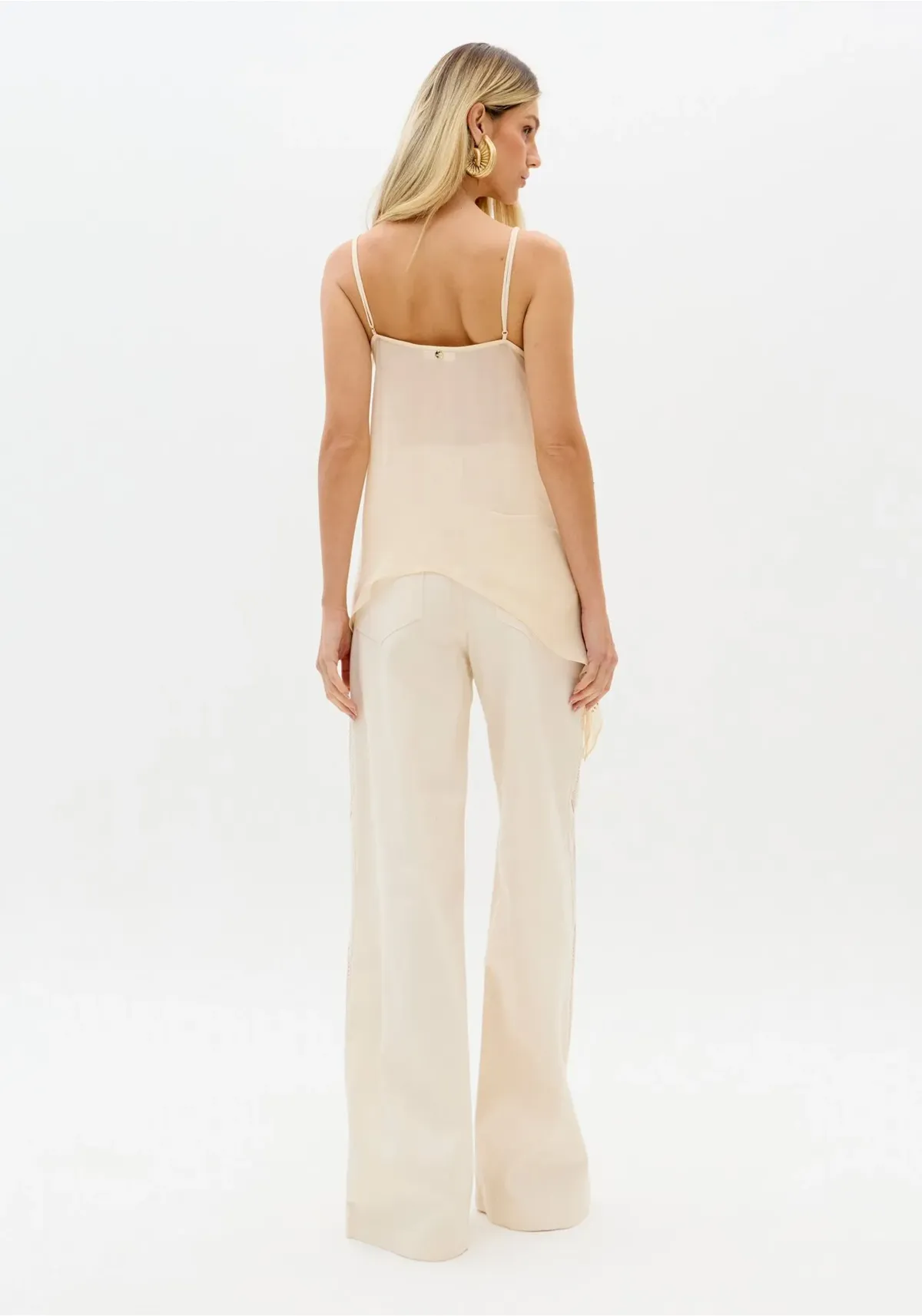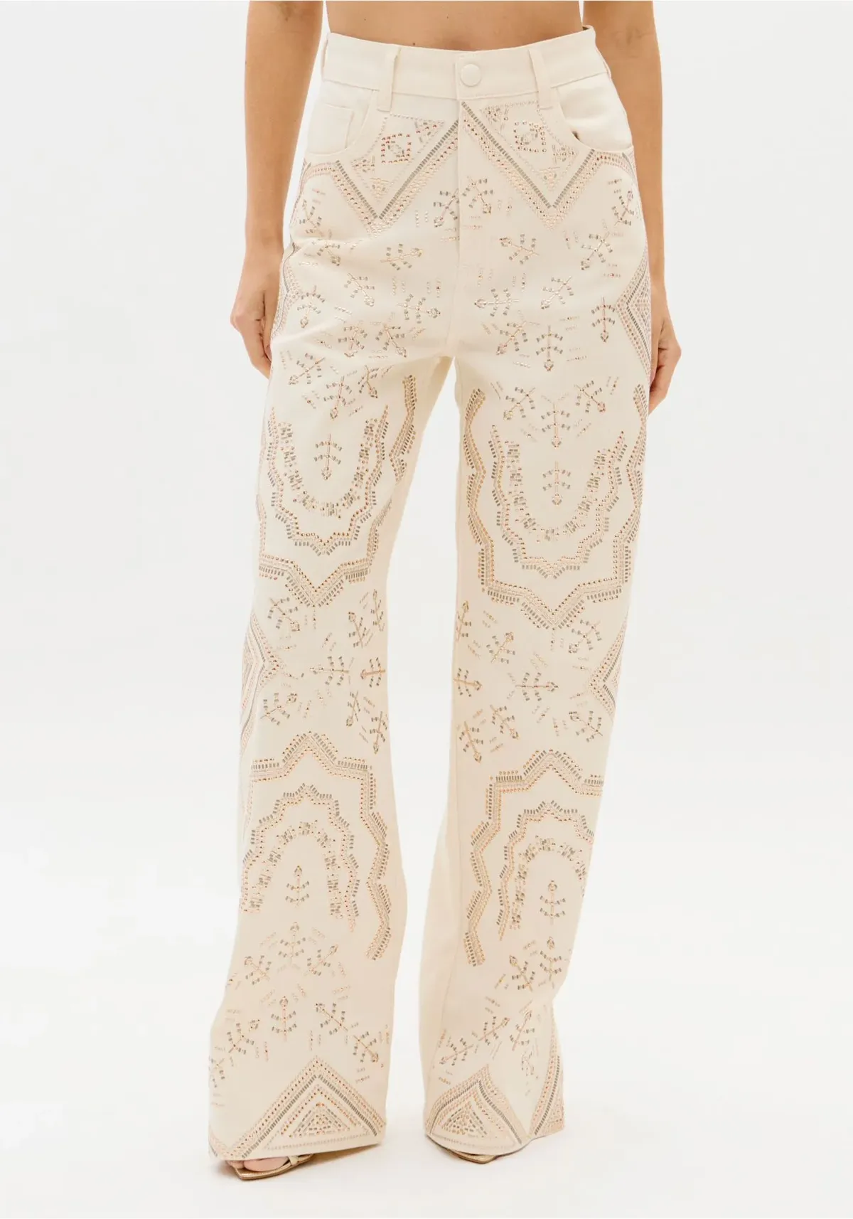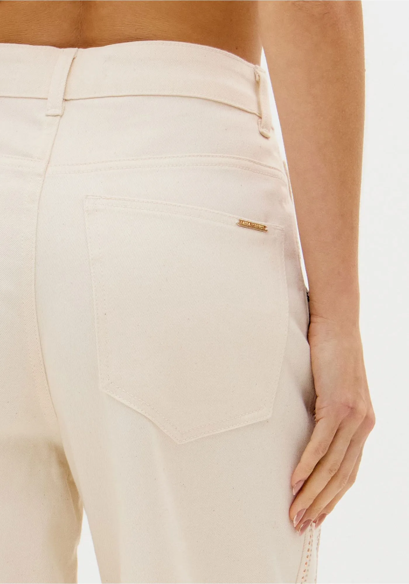 A calça em sarja com modelagem wide leg traz pernas amplas e soltas do quadril à barra, criando um visual marcante e contemporâneo. Possui cintura super alta, bolsos funcionais e aplicações frontais que imprimem atitude. Eleve seu visual com estilo!