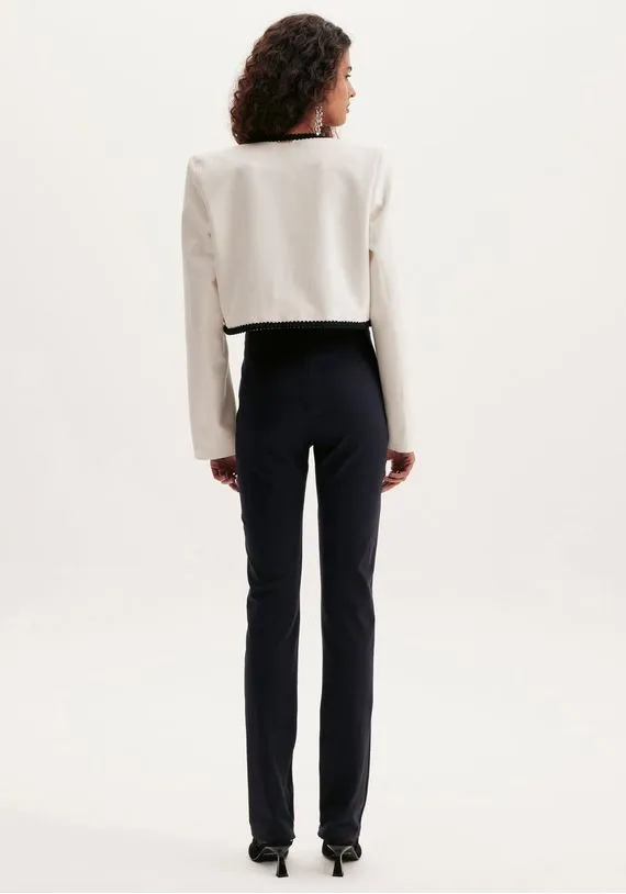 calça slim é a opção perfeita para quem busca valorizar o shape. De cintura alta, a peça se encaixa em looks casuais ou despojados.