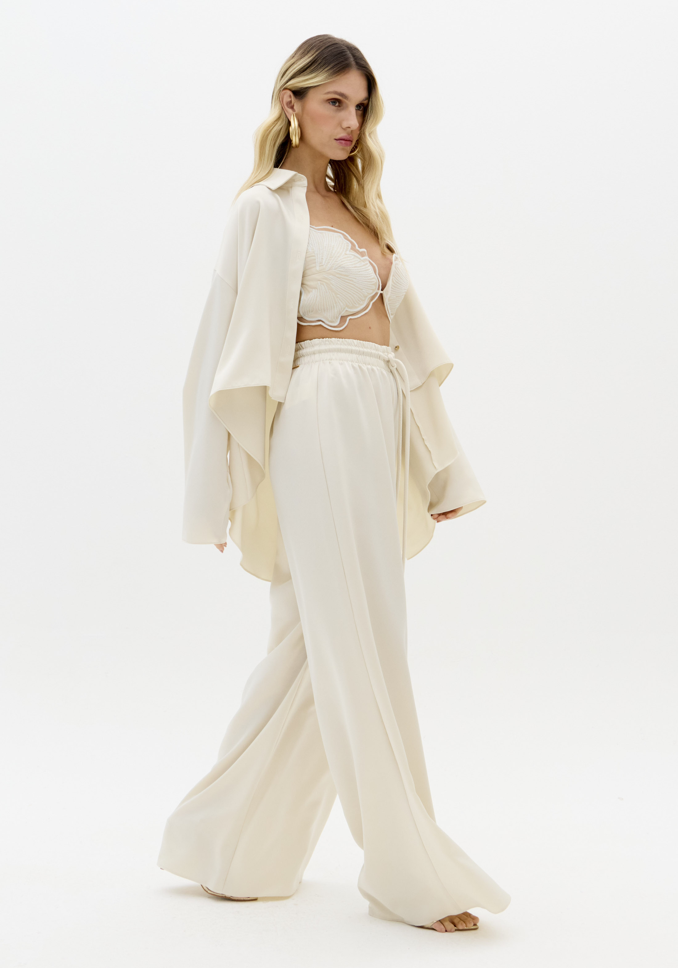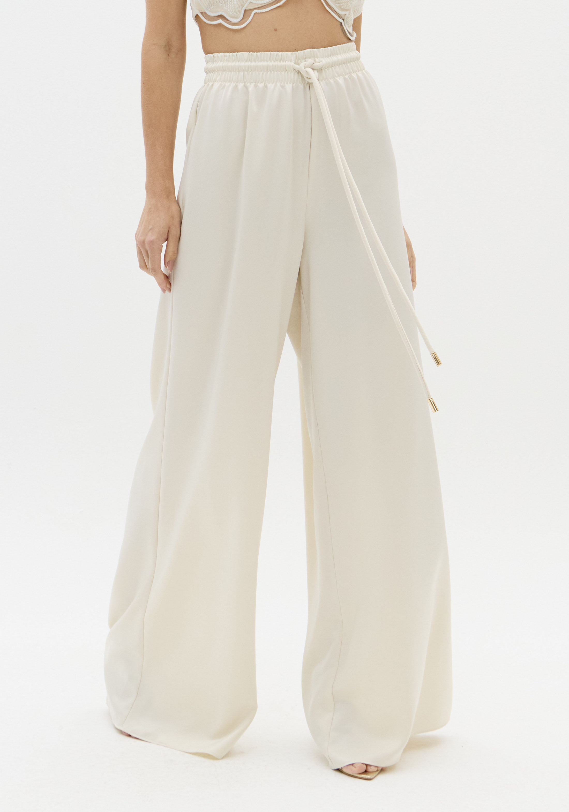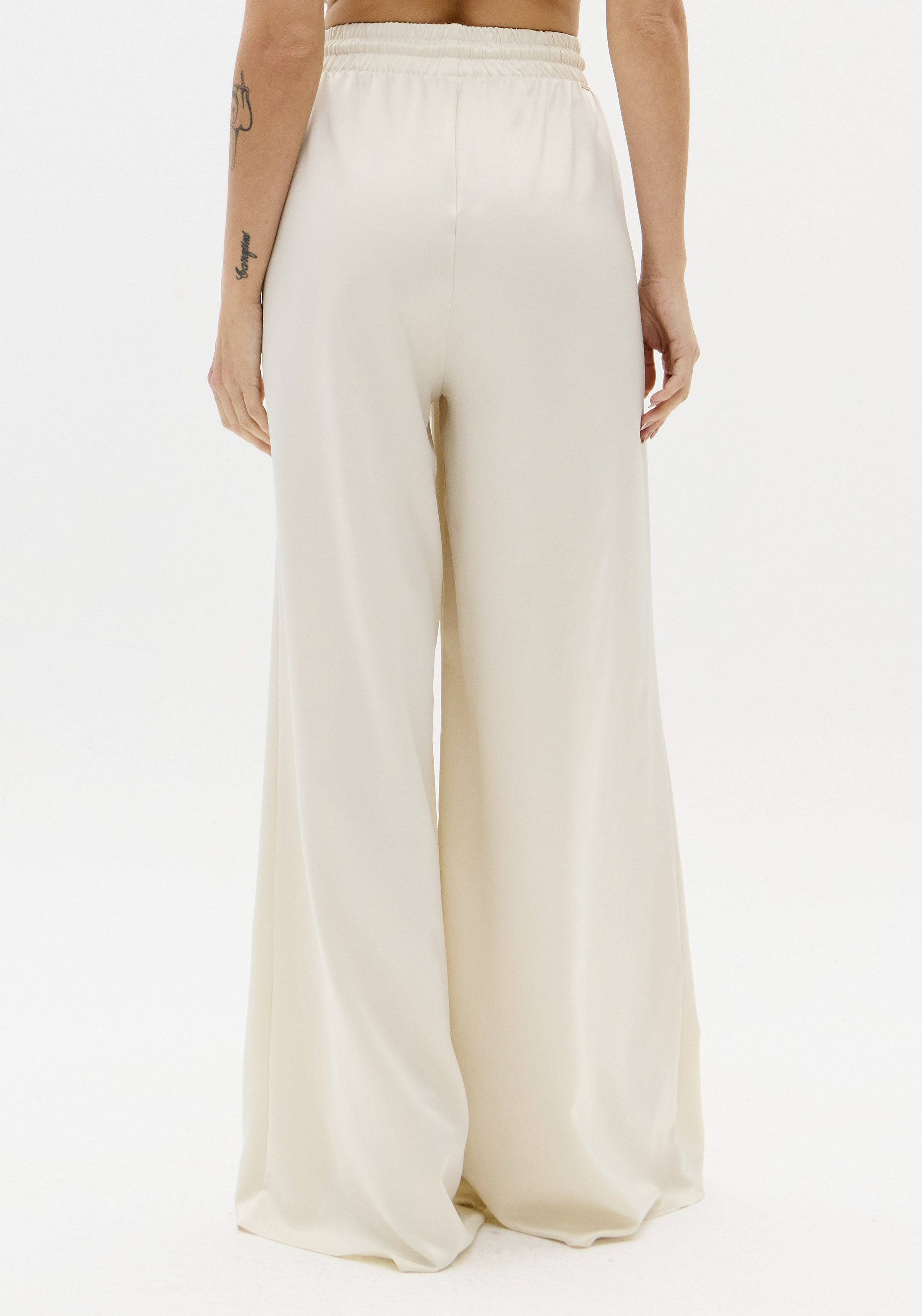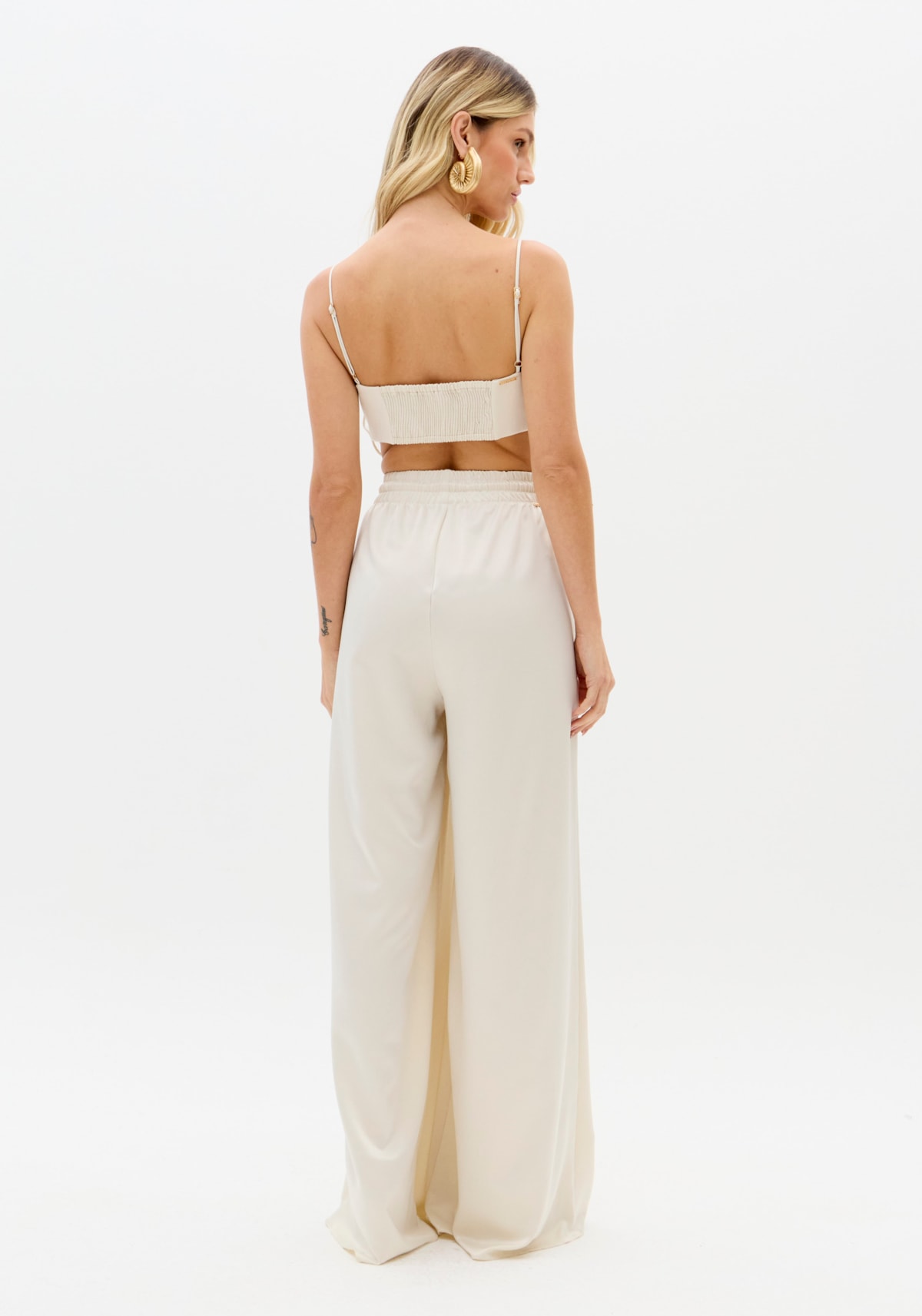 A calça em tecido plano acetinado aposta na modelagem wide leg com corte amplo e uniforme do quadril à barra. O caimento solto e a cintura alta se unem ao cós elástico com amarração frontal para elevar a produção. Use com top lança e destaque-se!