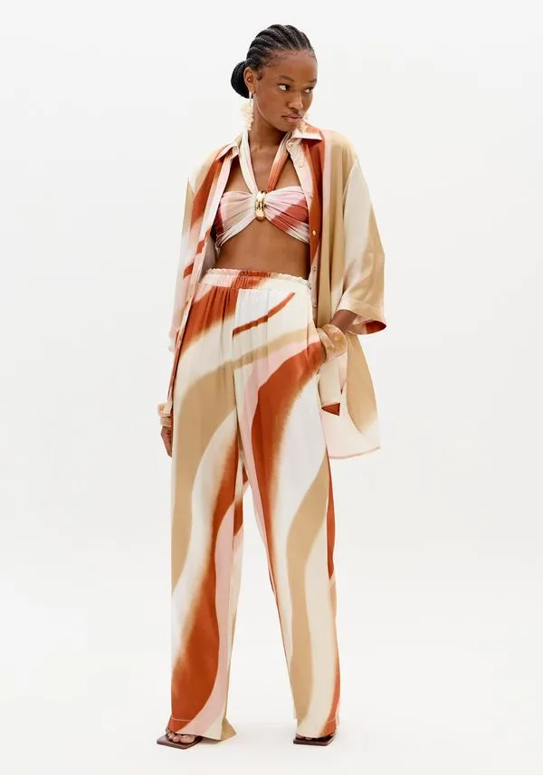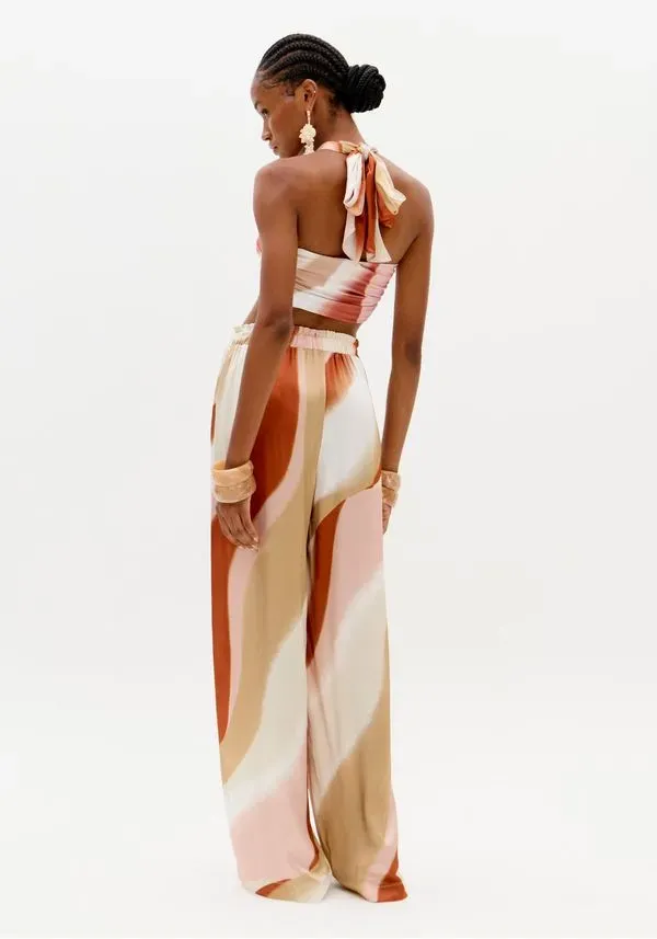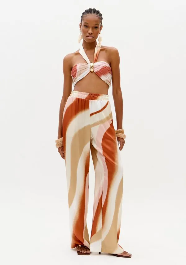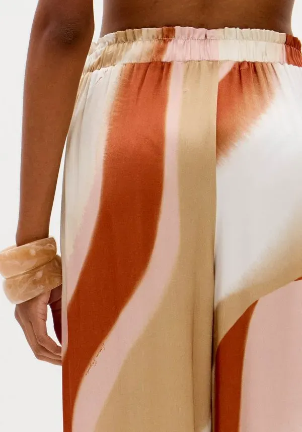 A calça estampada é feita em tecido leve com toque acetinado. Apresenta modelagem wide leg, marcada pelo shape amplo e fluido que se abre a partir do quadril, além de cintura alta, cós elástico e bolsos funcionais. Elegância e versatilidade em sintonia!
