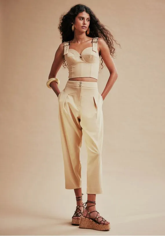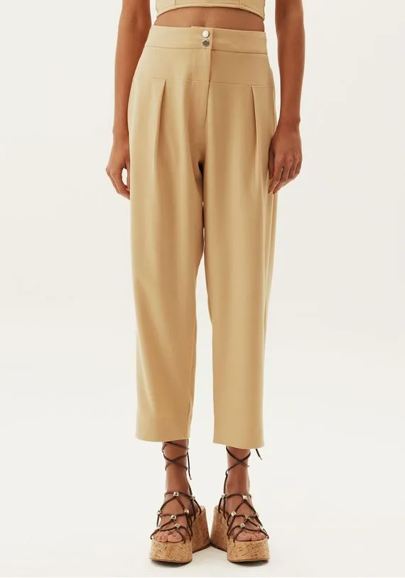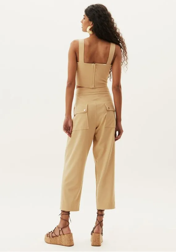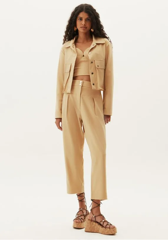Calça reta apresenta cintura média, bolsos e botão duplo. uma opção sofisticada para criar looks elegantes. Aposte!