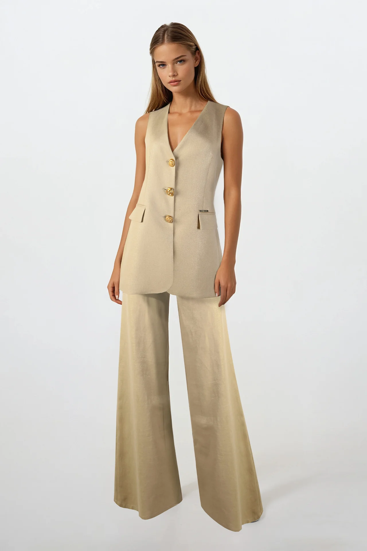 Calças confeccionadas com linho leve, apresentam cintura subida com trespasse e fecho frontal com botão e fecho éclair oculto. Silhueta solta e sofisticada - perfeitas para um verão em tons naturais.
