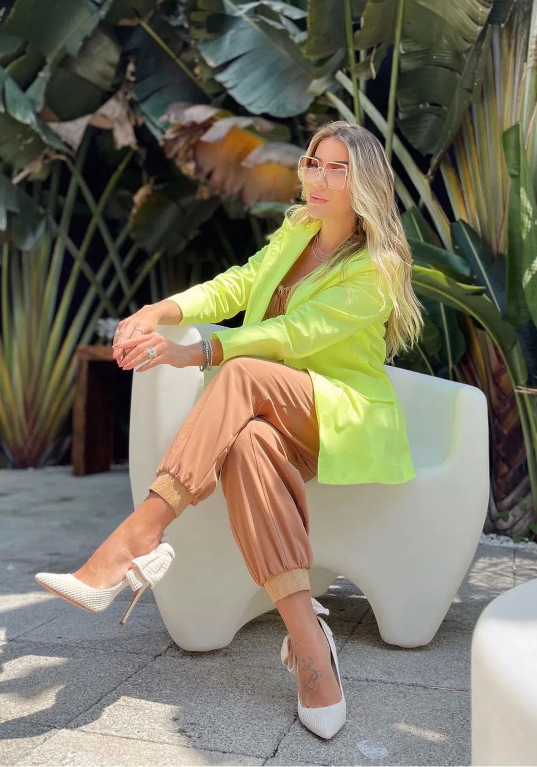 Calças de cor única e com elástico na parte de baixo