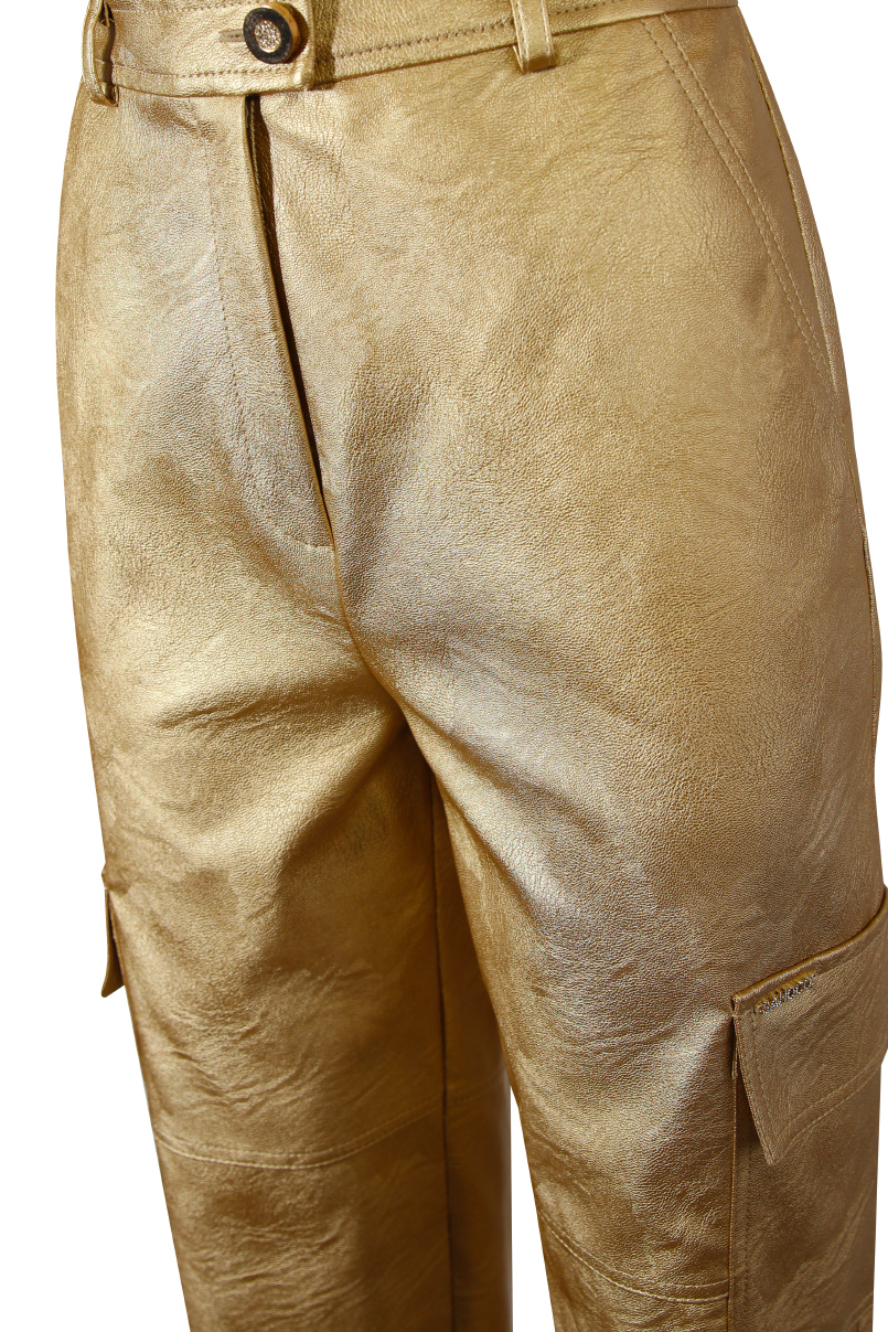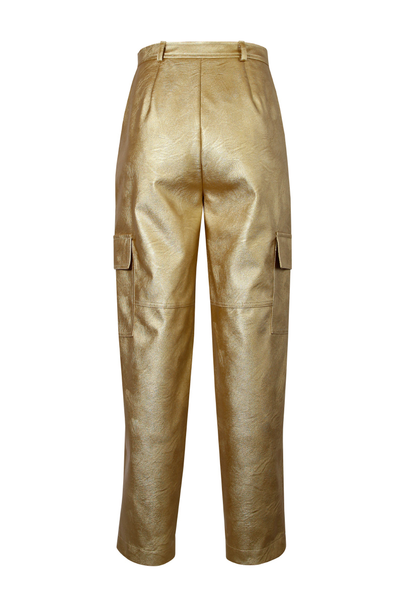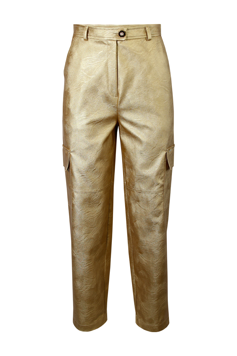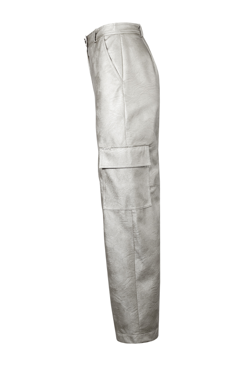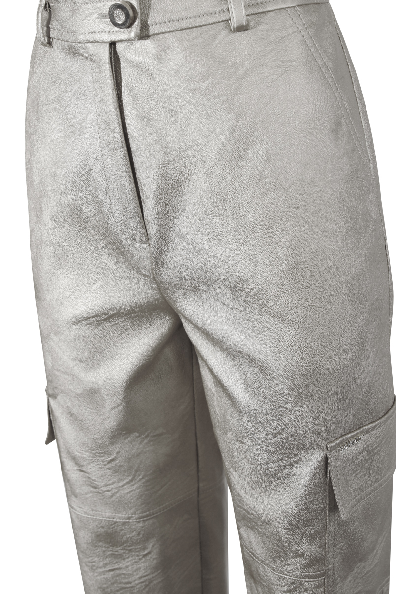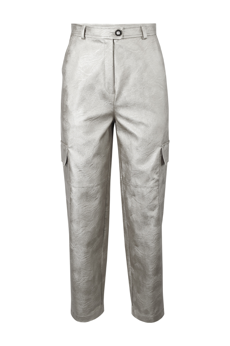Calças confeccionadas em tecido efeito pele. Cintura subida e perna direita.