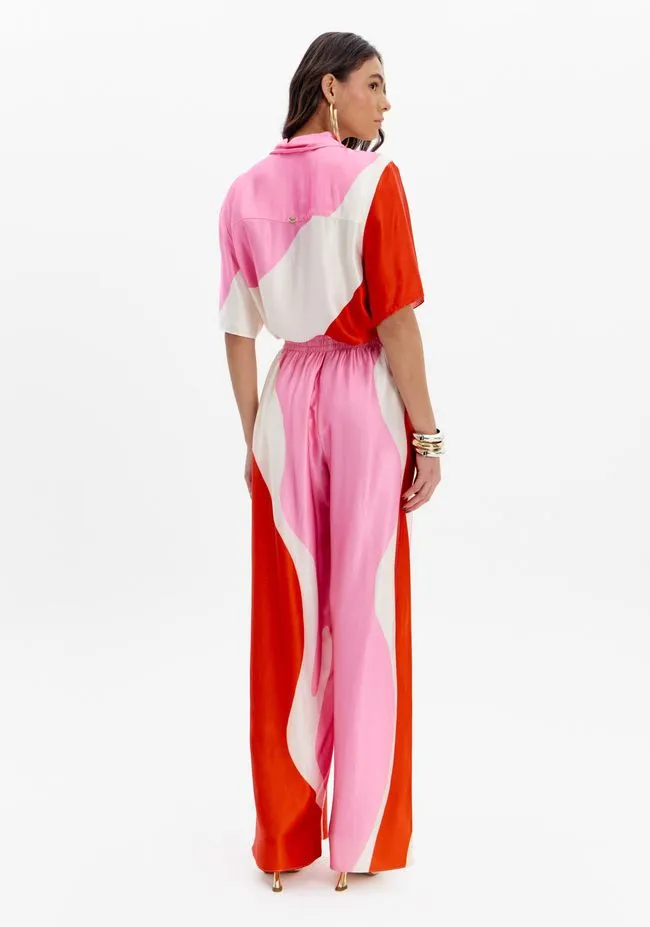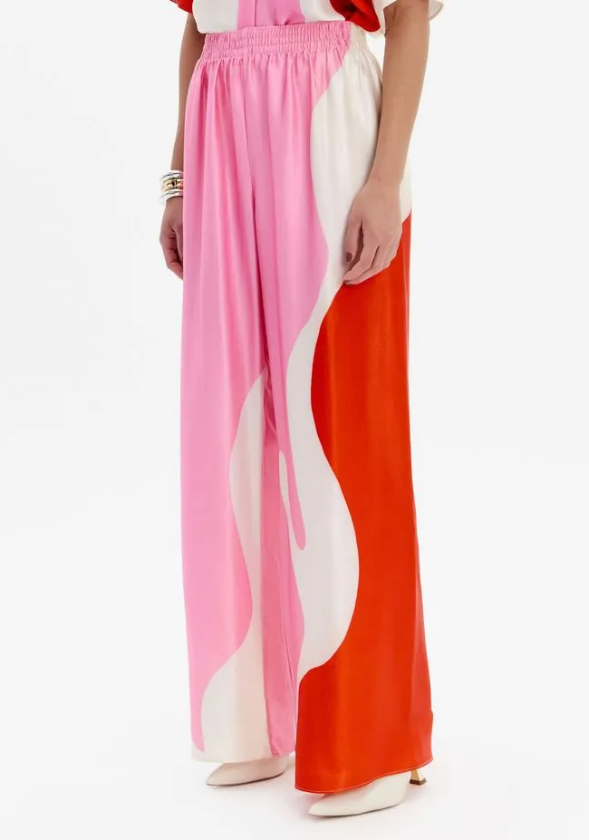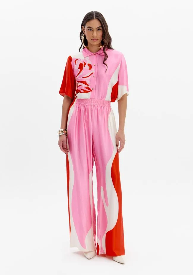 A calça estampada com modelagem full length proporciona um caimento elegante e alongado. Seu tecido leve com toque acetinado confere sofisticação, enquanto o cós elástico assegura conforto e se adapta perfeitamente à sua silhueta.