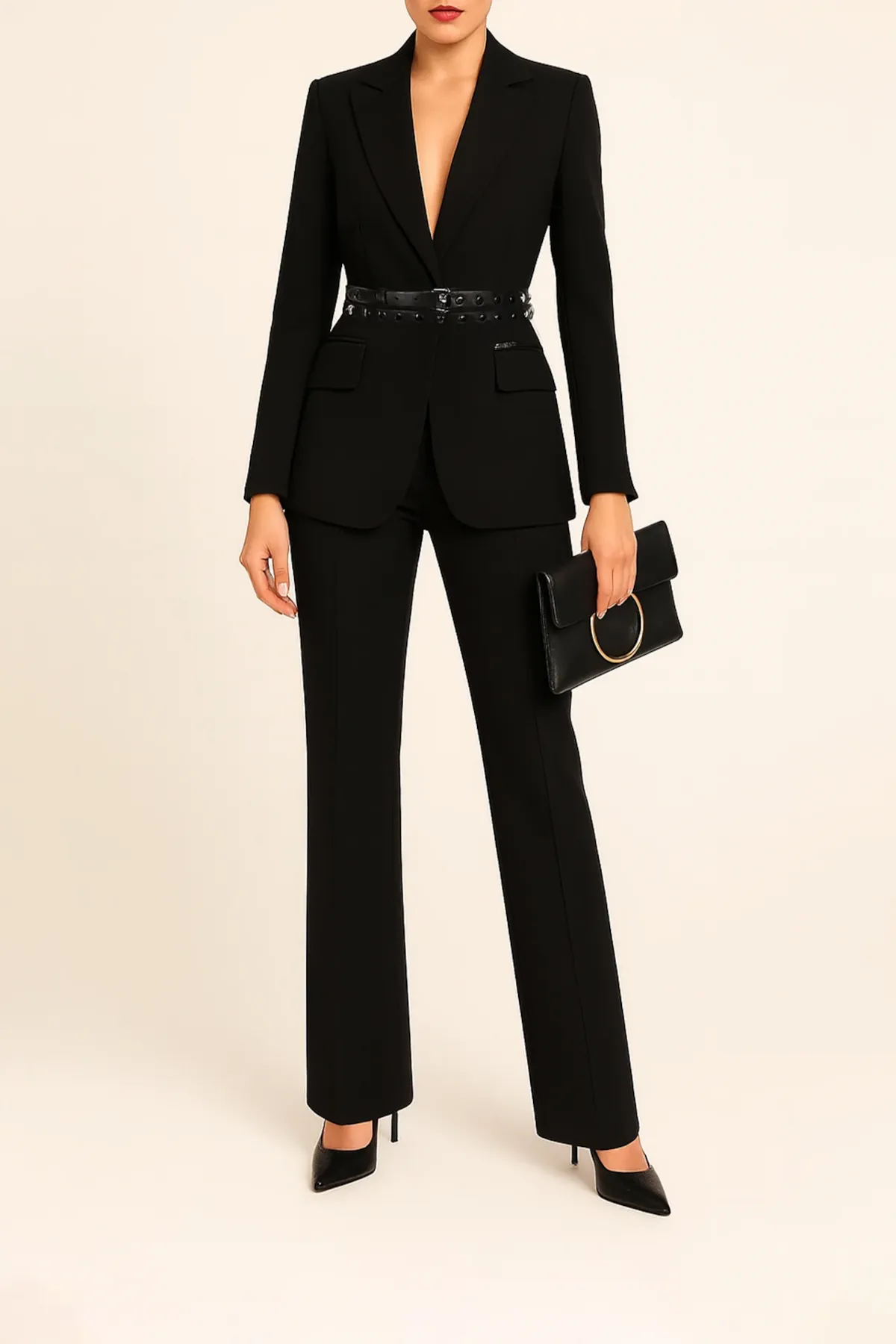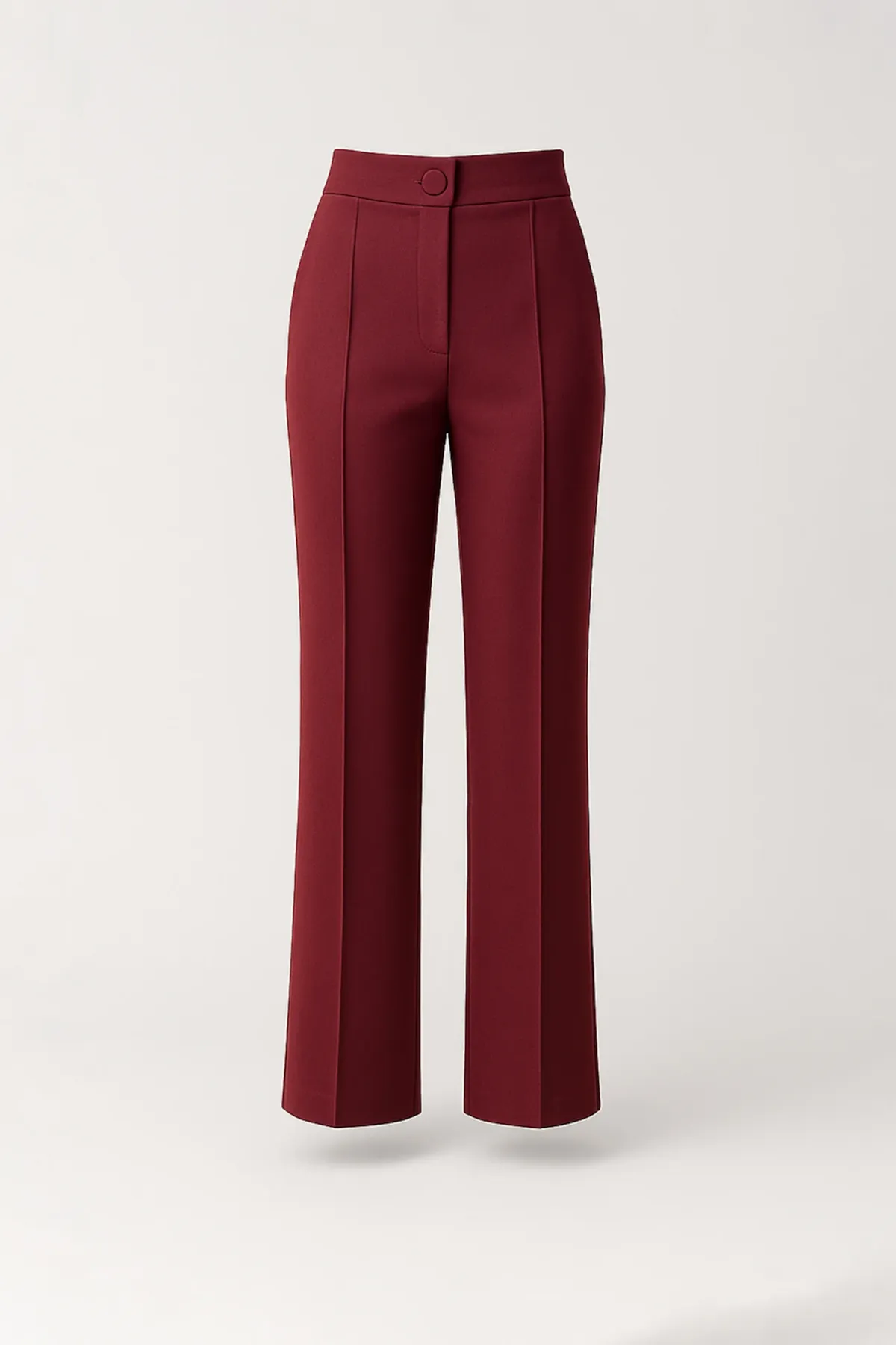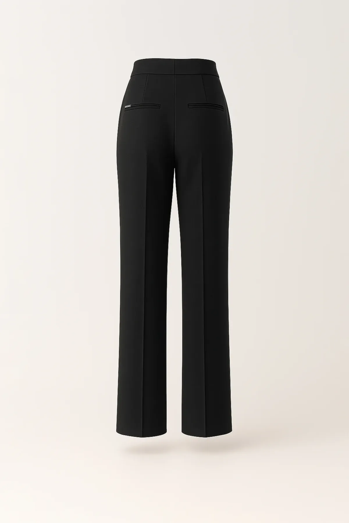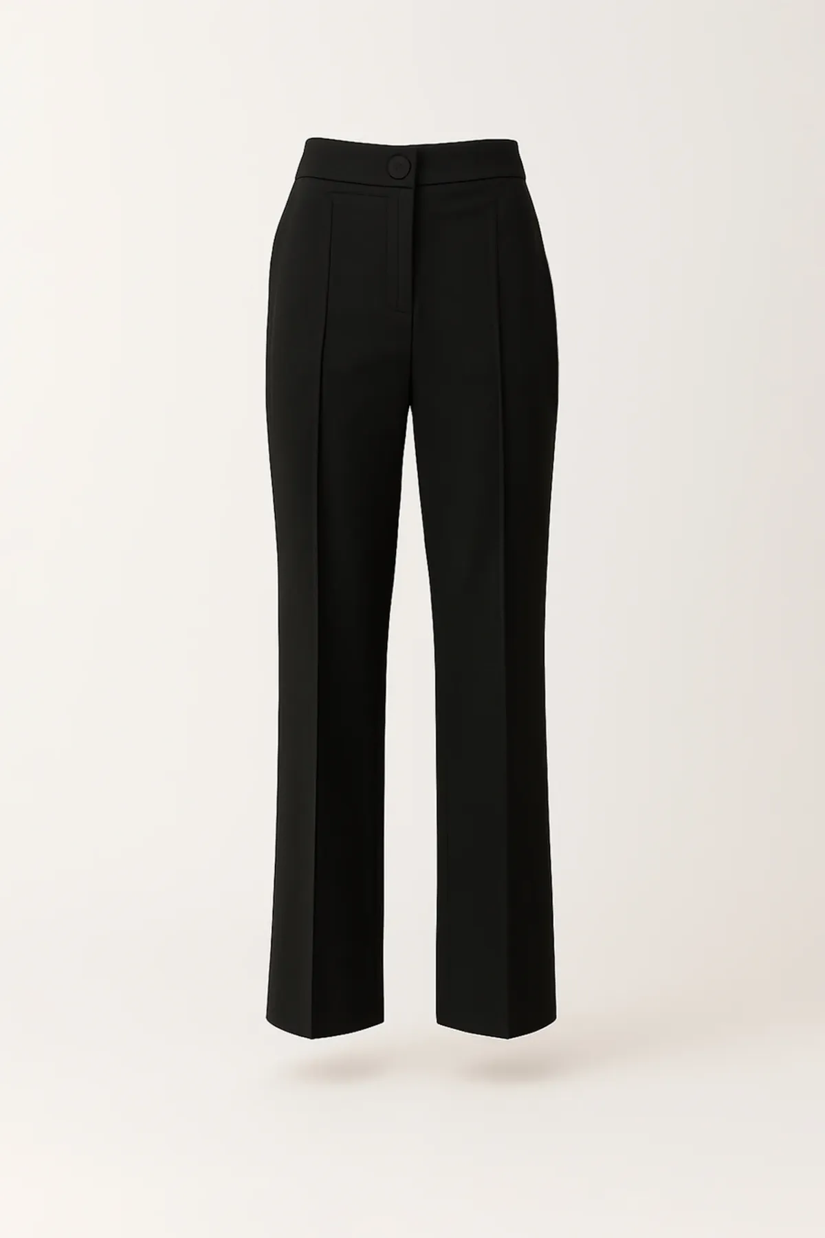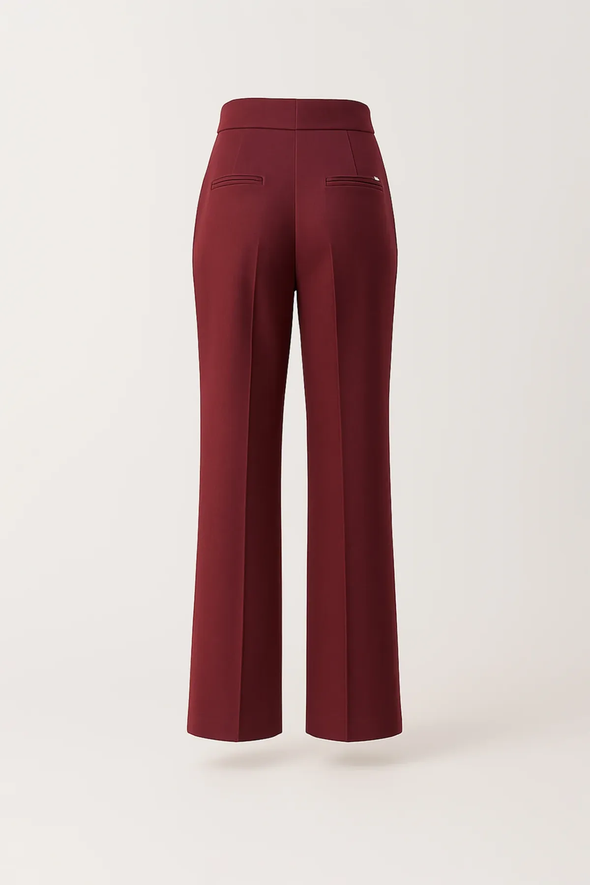 Calças de cintura subida com corte flare, confeccionadas em tecido de alfaiataria com estrutura e movimento elegantes. Apresentam bolsos frontais funcionais e falsos bolsos debruados nas costas, garantindo um acabamento limpo e refinado. A bainha em evasê acrescenta fluidez e alonga a silhueta, enquanto o fecho frontal com fecho de correr, botão e gancho assegura um ajuste perfeito.