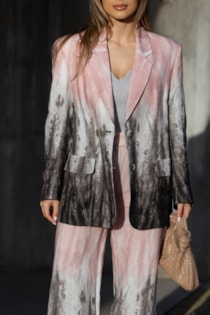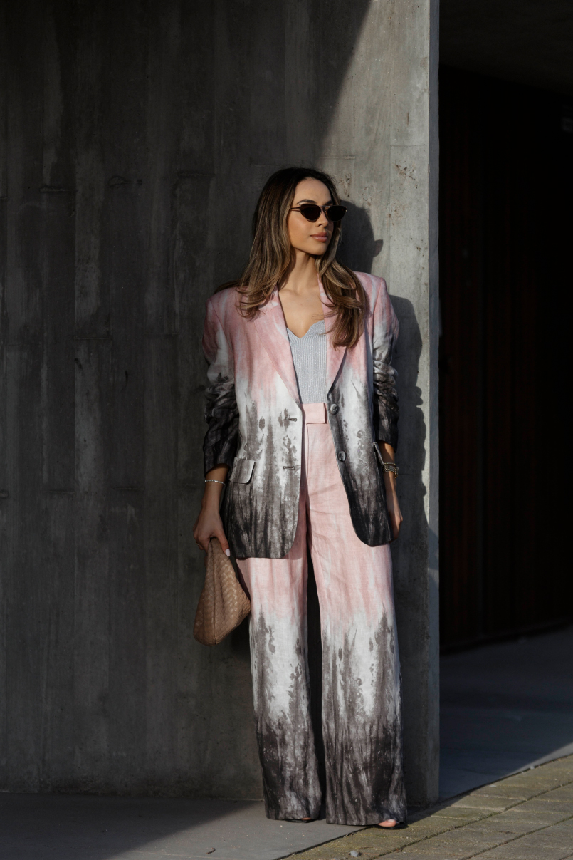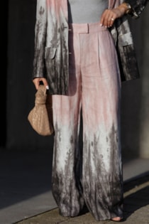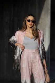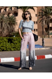 Calças confecionadas em tecido de linho. Pregas frontais. Corte amplo. Bolsos laterais. Fecho frontal com fecho de correr e botão. Total look.
