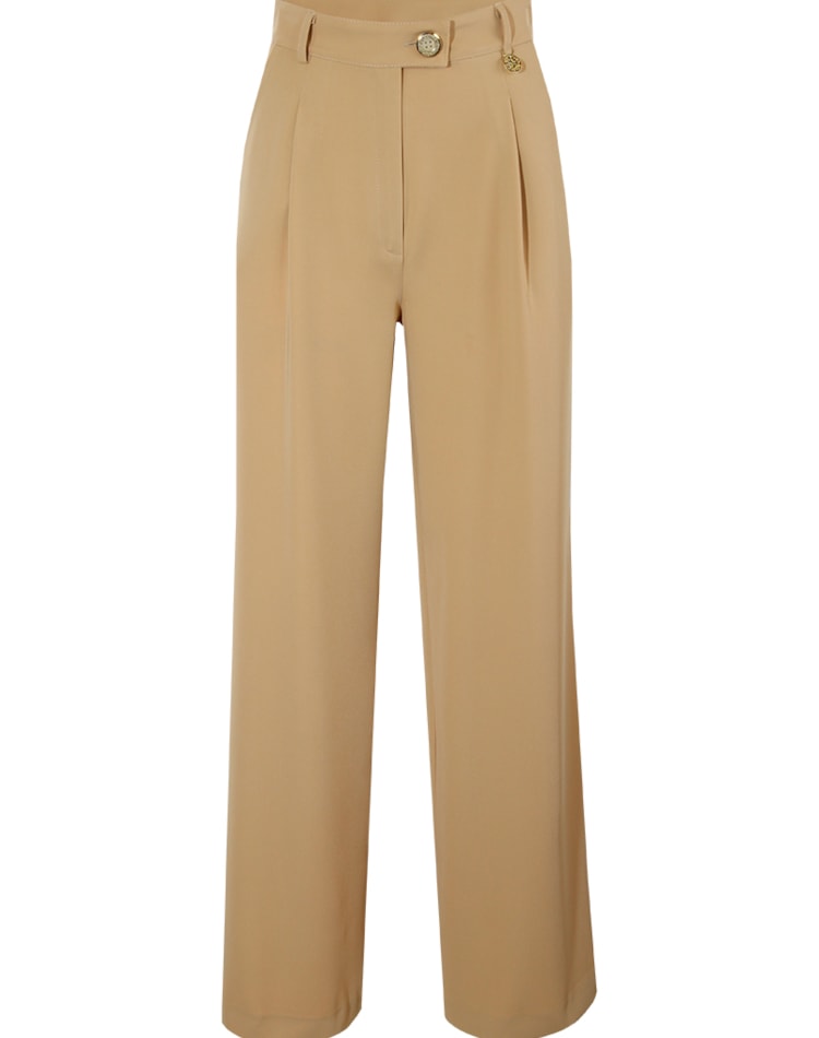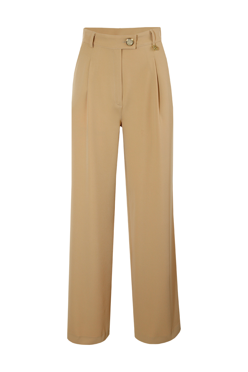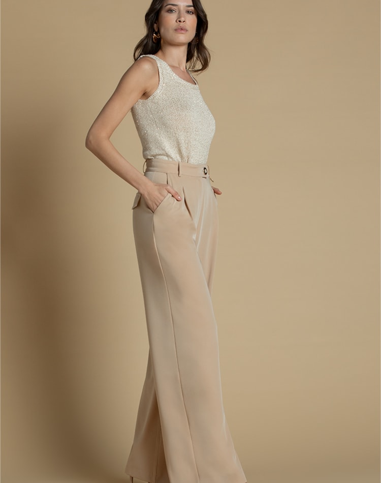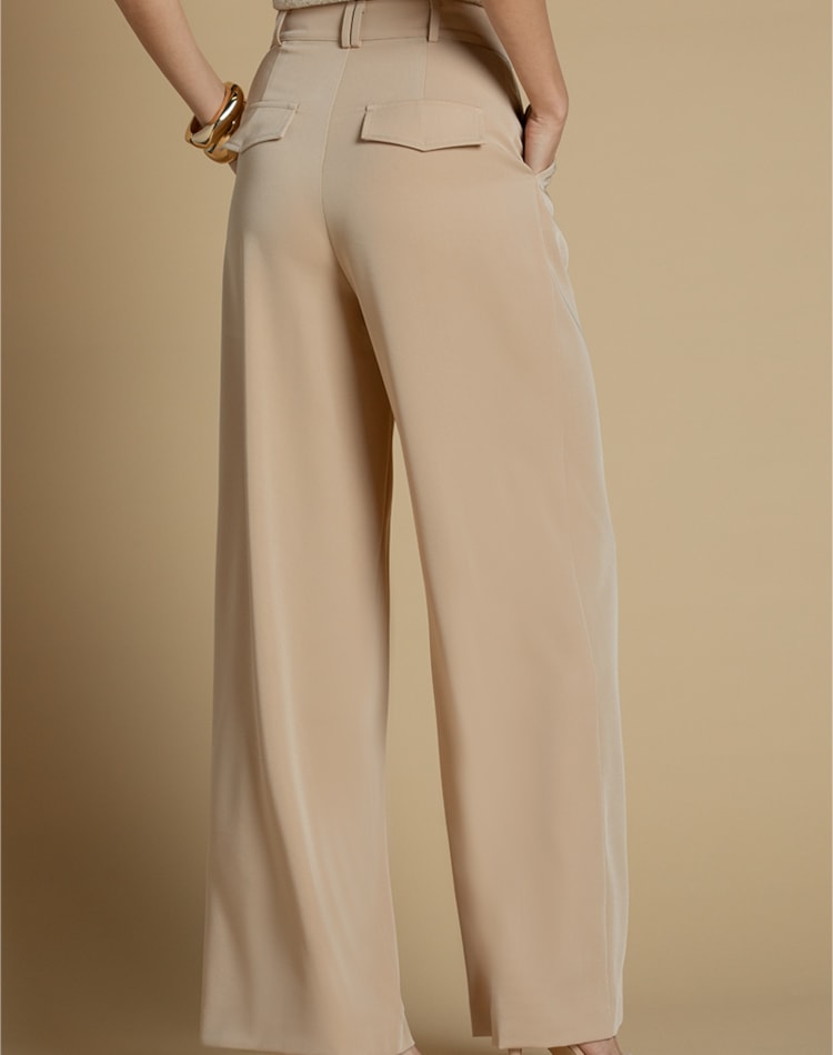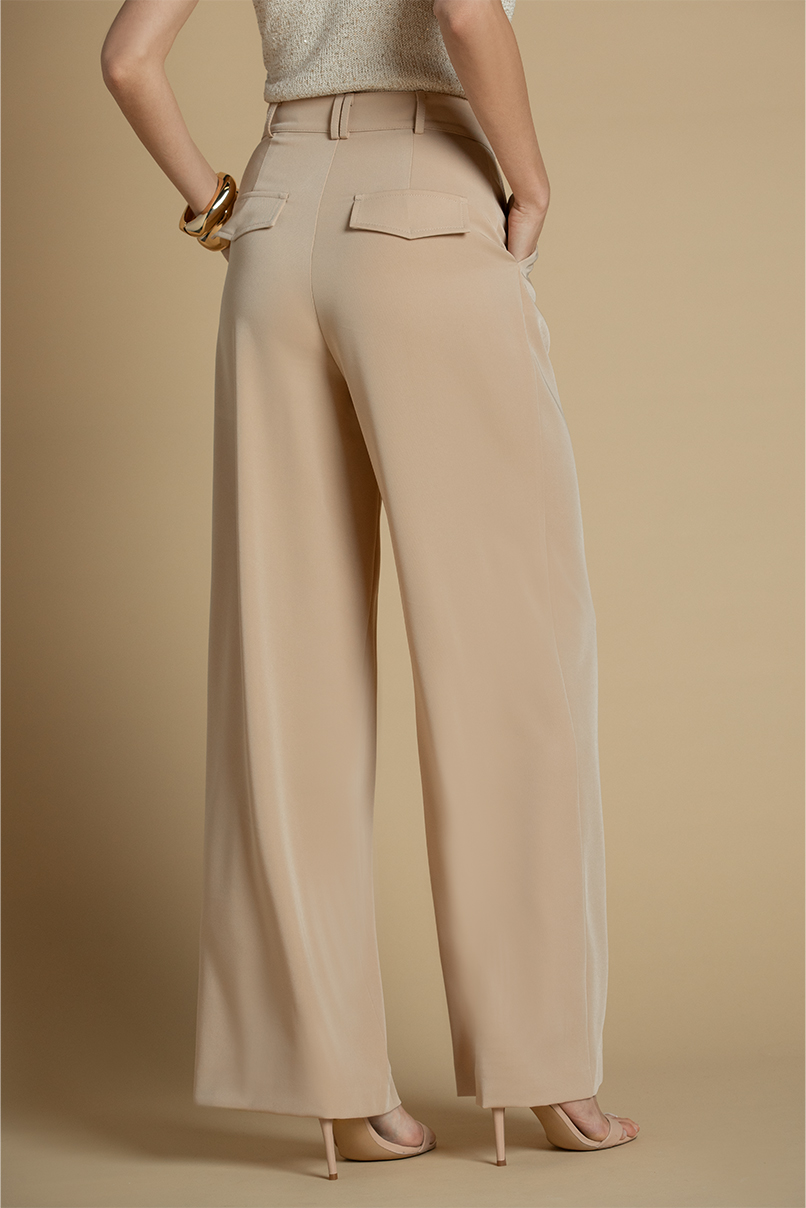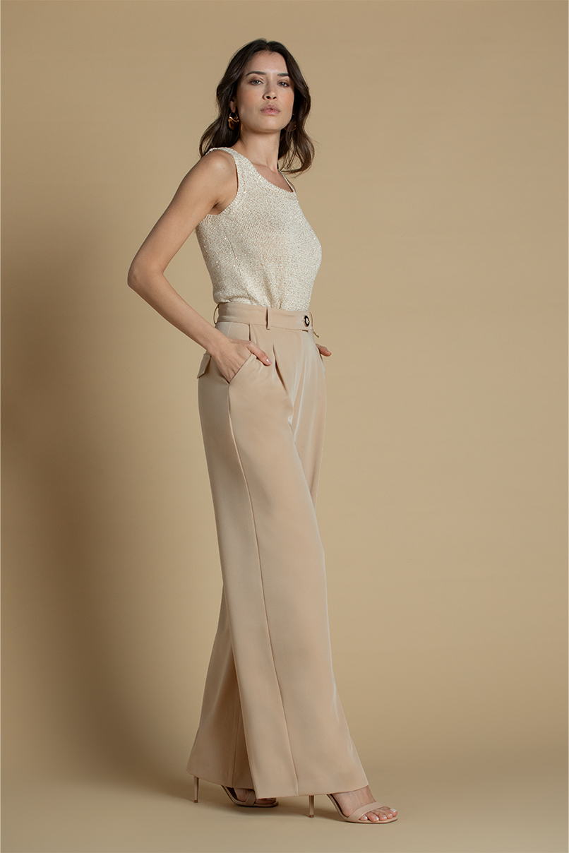 Calças pantalona de cintura alta e pinças frontais. Perna larga. Bolsos laterais e falsos bolsos de linha viva atrás. Fecho frontal com fecho de correr e botão.