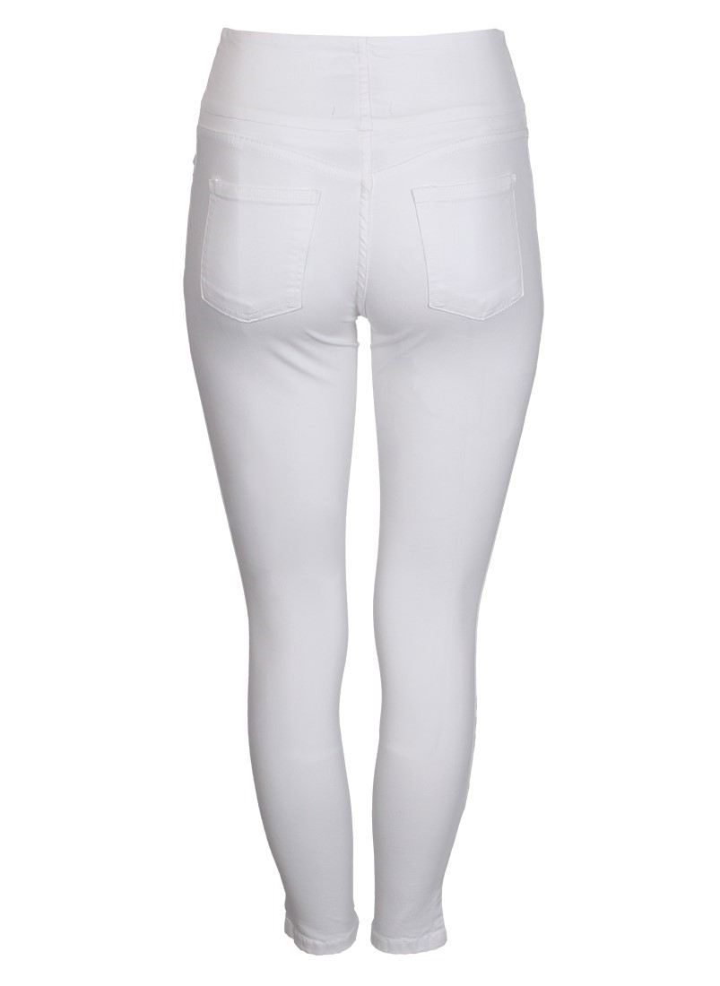 Calças skinny com pormenor de cós dobrado. Fecho com zip à frente.