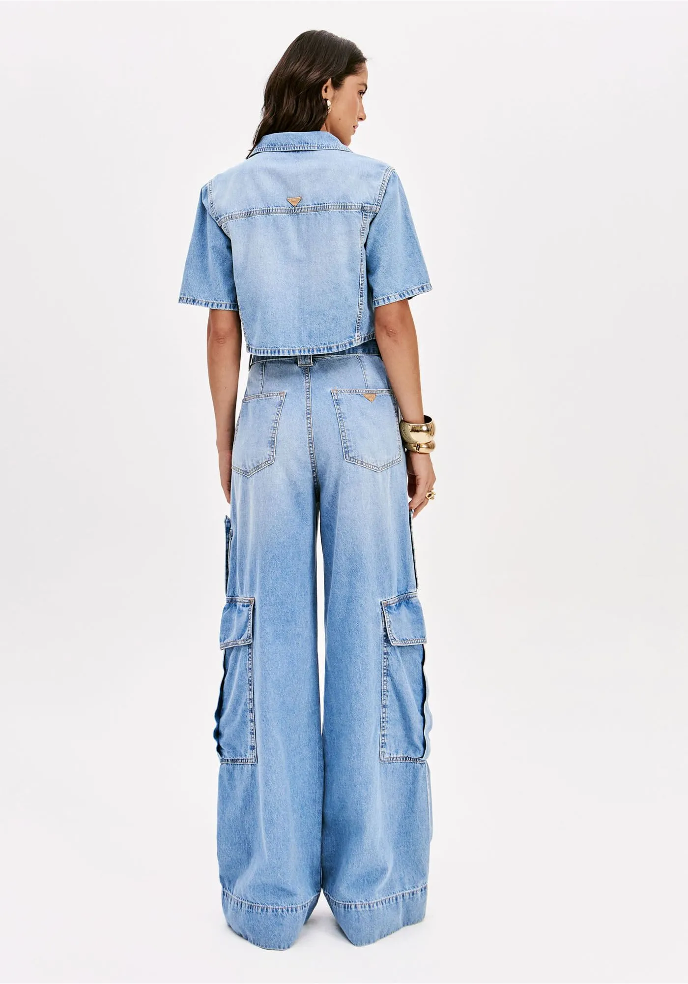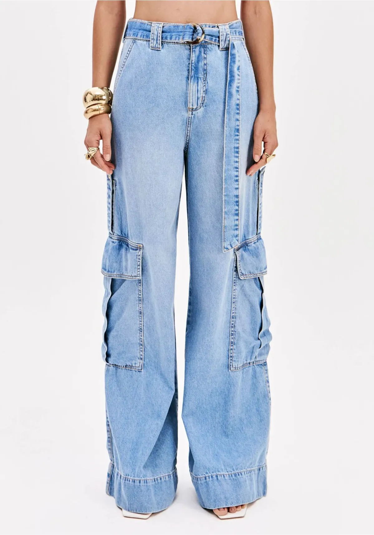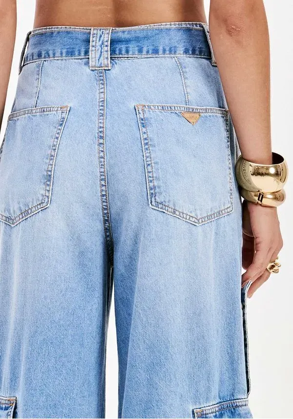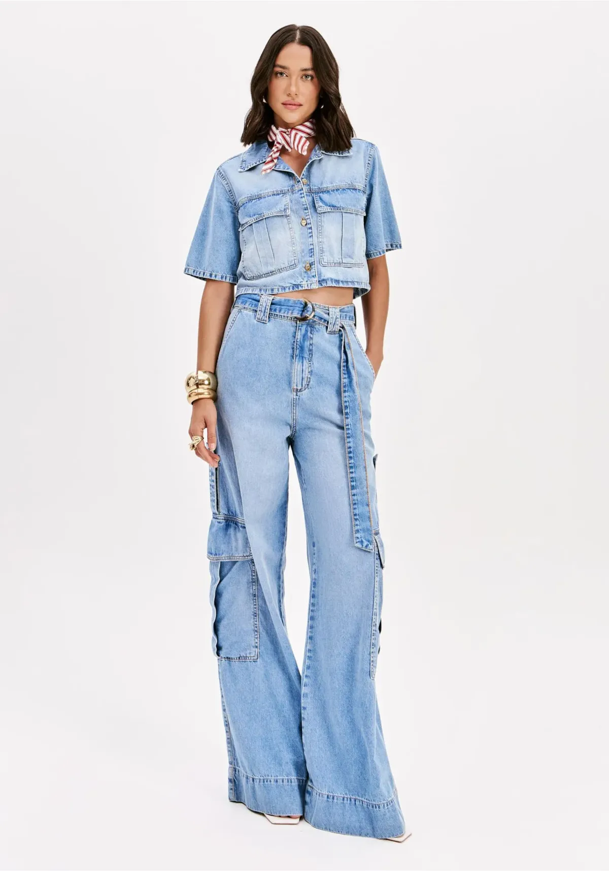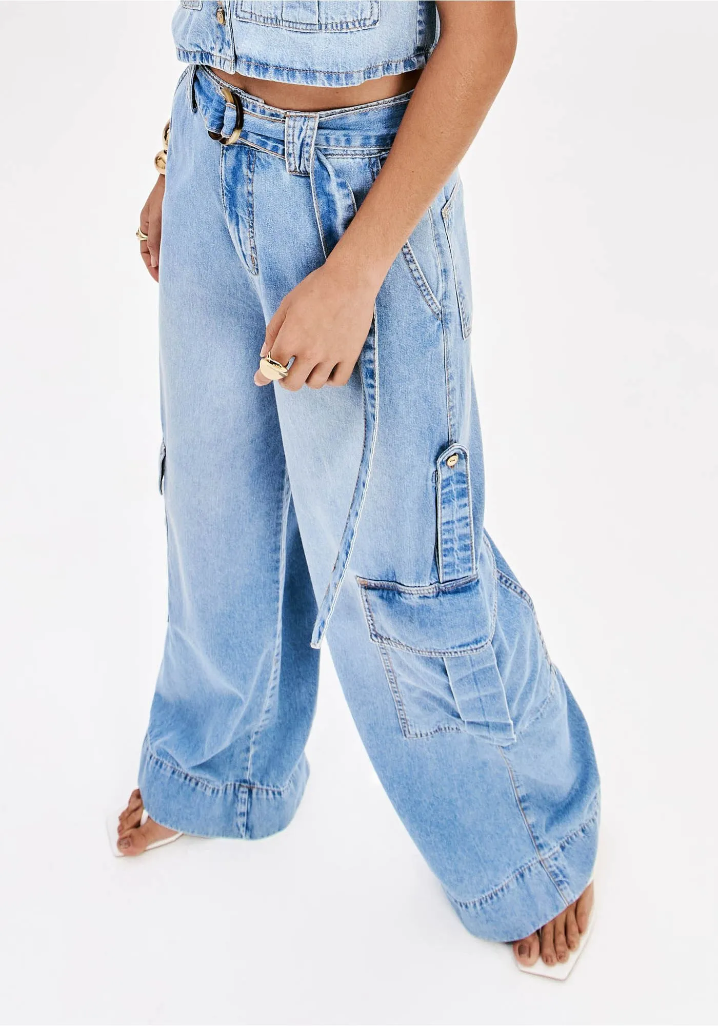 A calça jeans com modelagem pantalona oferece um shape amplo do cós até a barra. Possui cintura super alta, bolsos laterais cargo com martingale e fechamento frontal. O cinto que acompanha a peça finaliza a proposta urbana com uma dose extra de estilo!