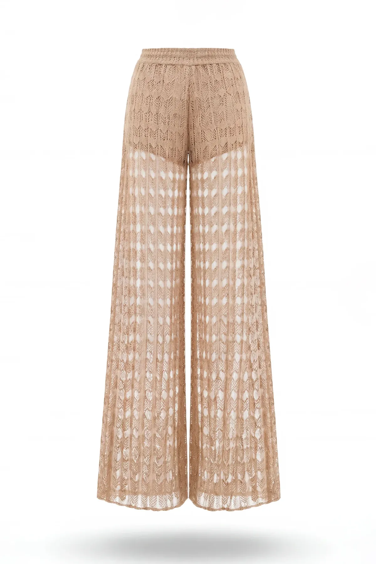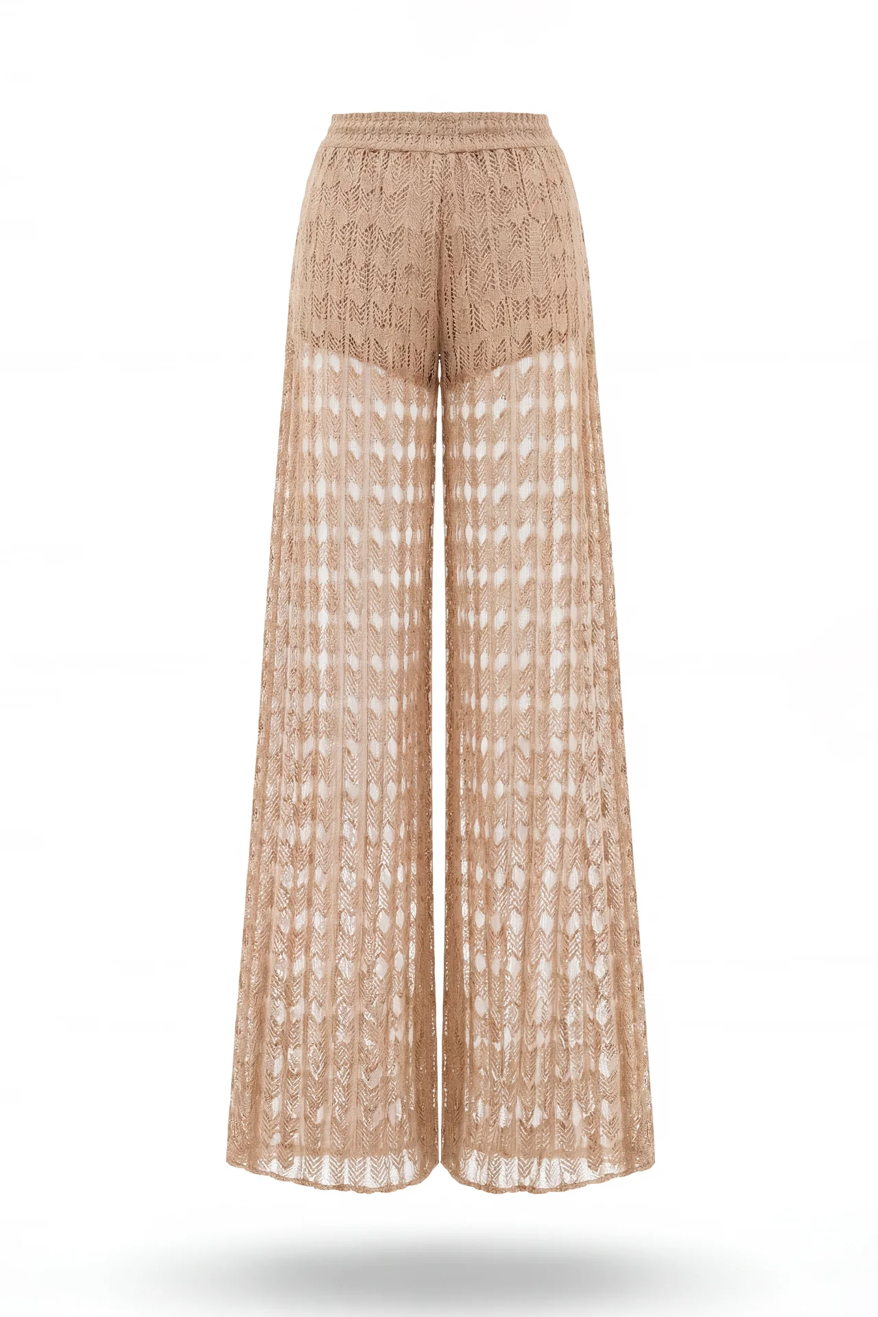Calças de perna larga em renda com transparência subtil. Cintura elástica para maior conforto e forro interior no tom tipo calções. Uma peça leve, pensada para coordenados de impacto.