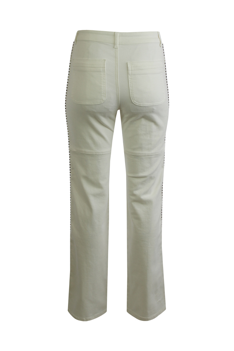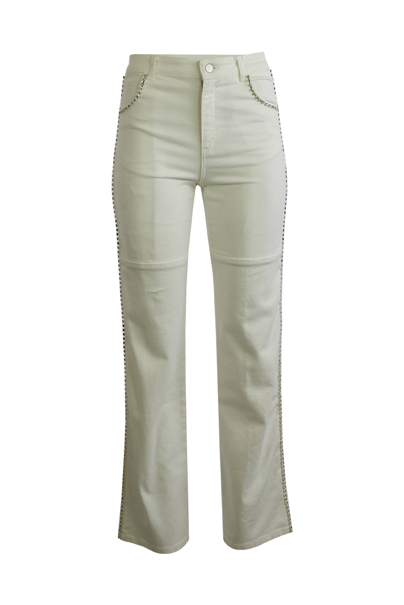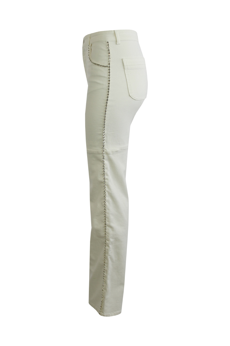 Detalhe de brilhantes tipo Swarovsky, na costura lateral da perna.