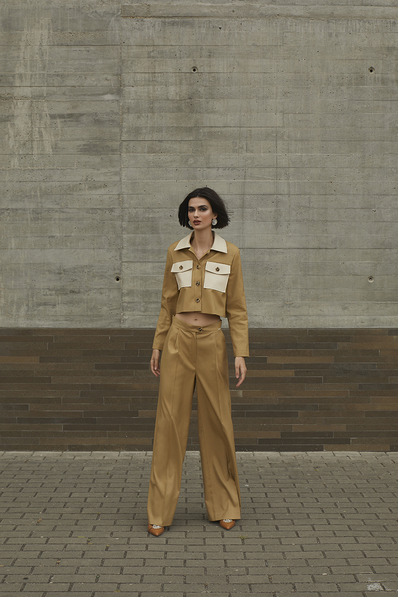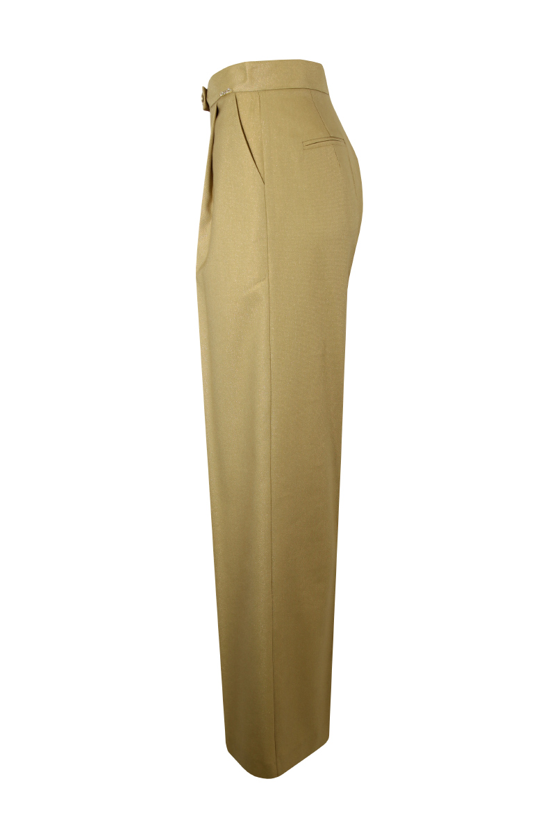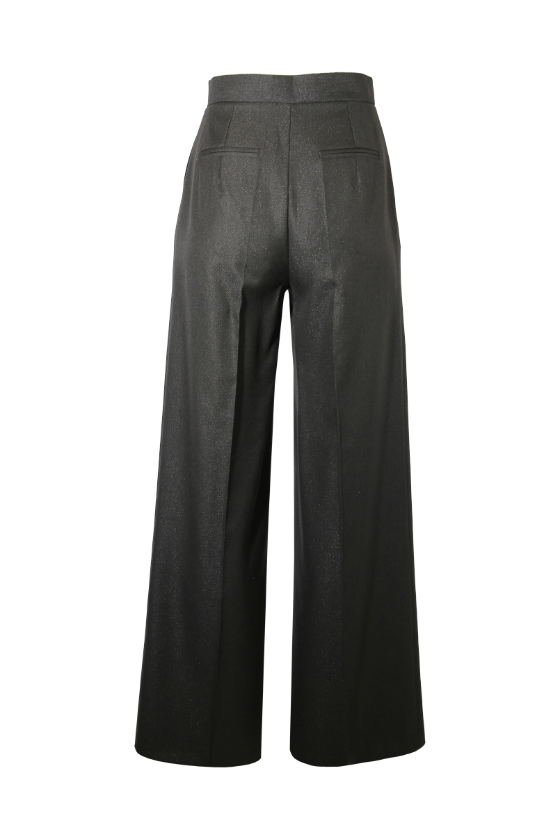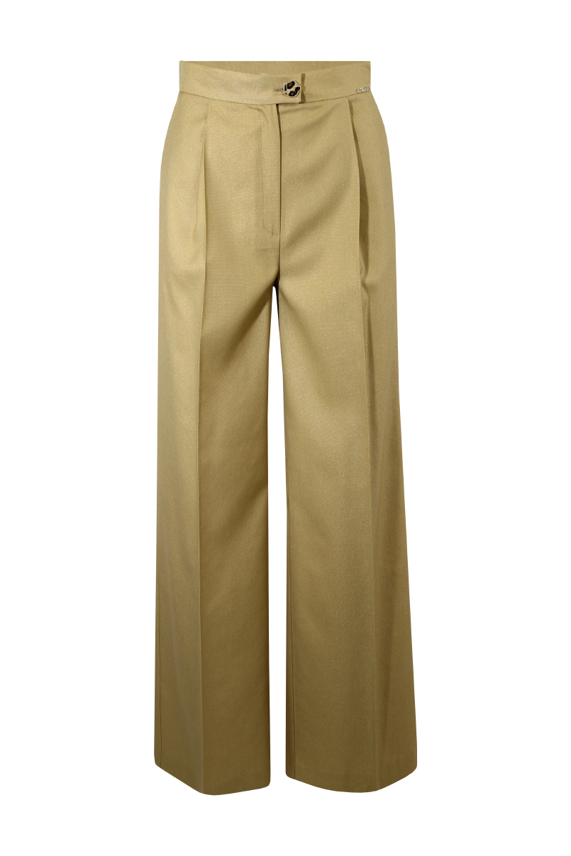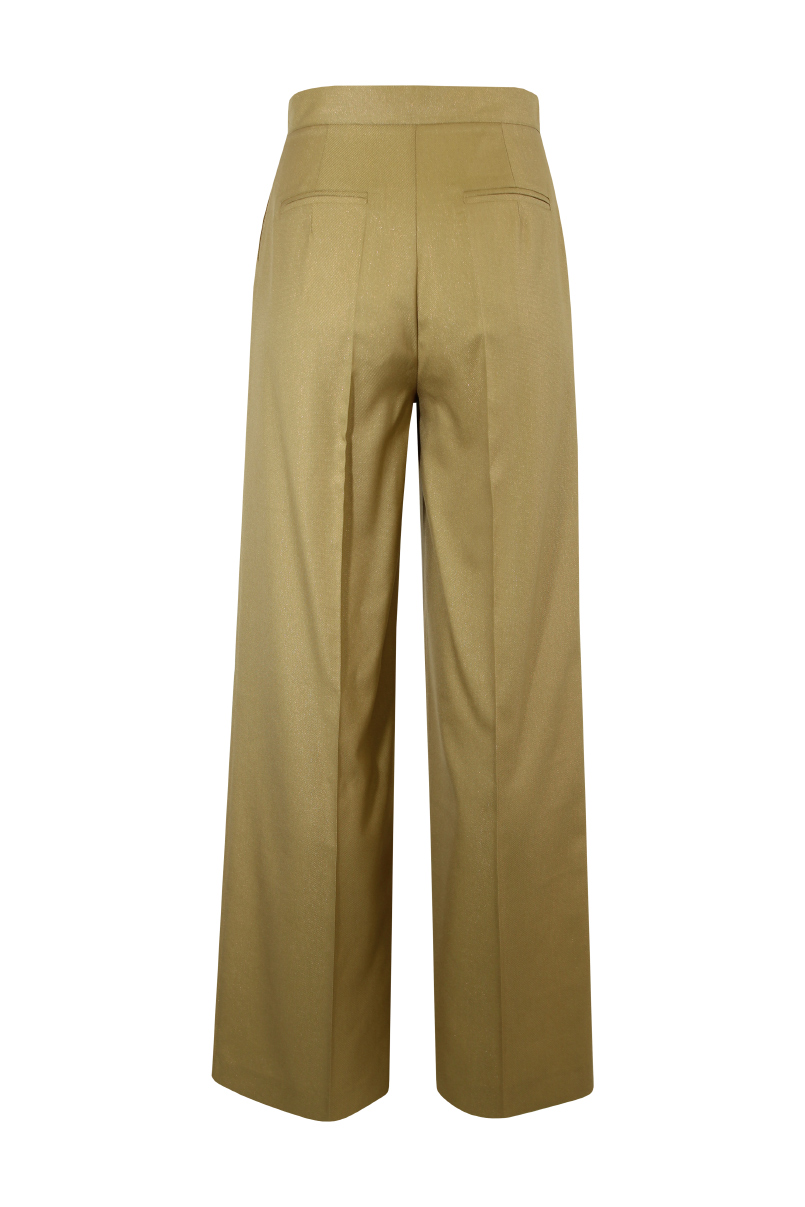 Calças de corte reto com cintura média e presilhas na cintura. Bolsos laterais e debruados atrás. Pormenor de pregas à frente. Fecho frontal com fecho de correr e presilha com botão.