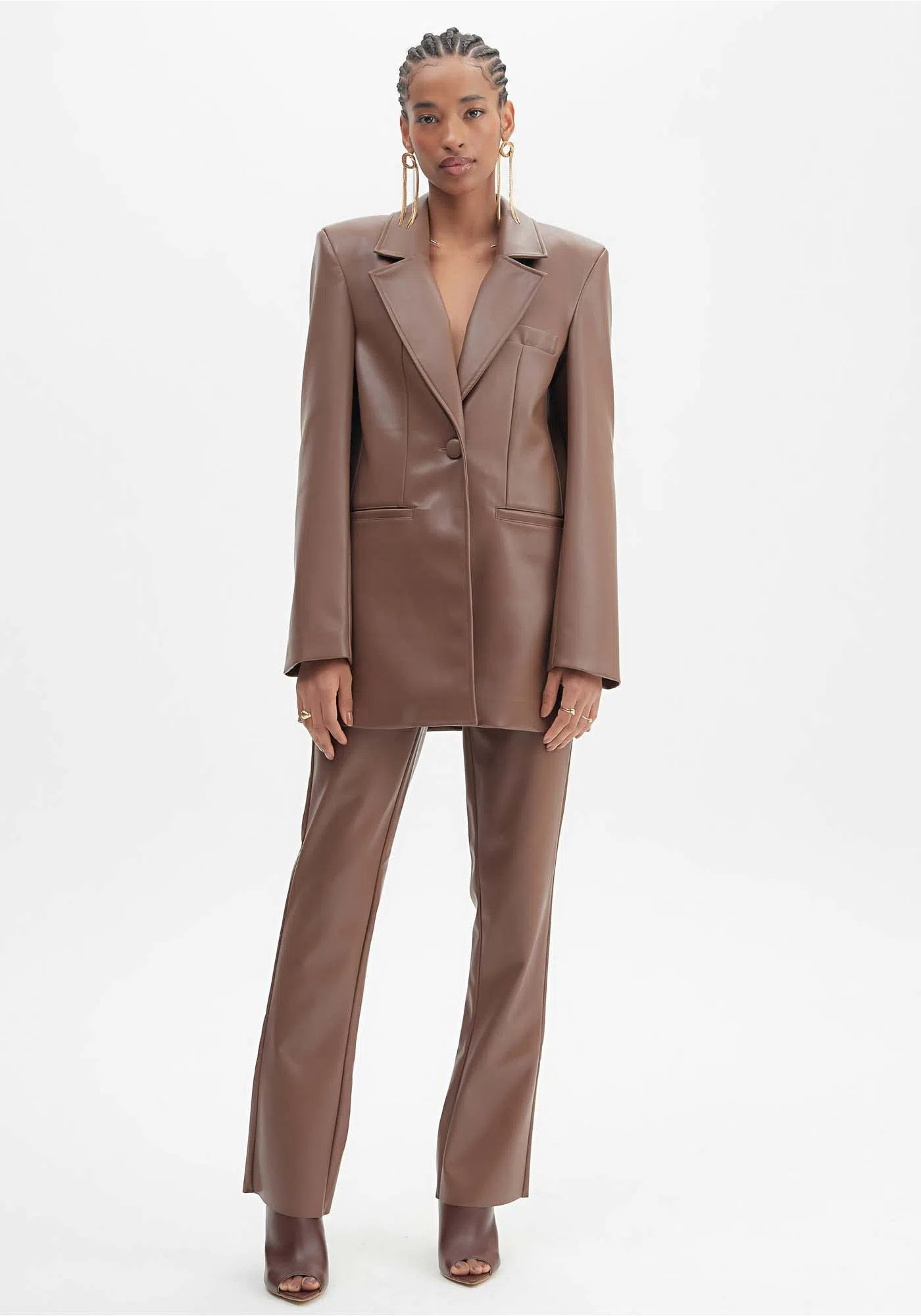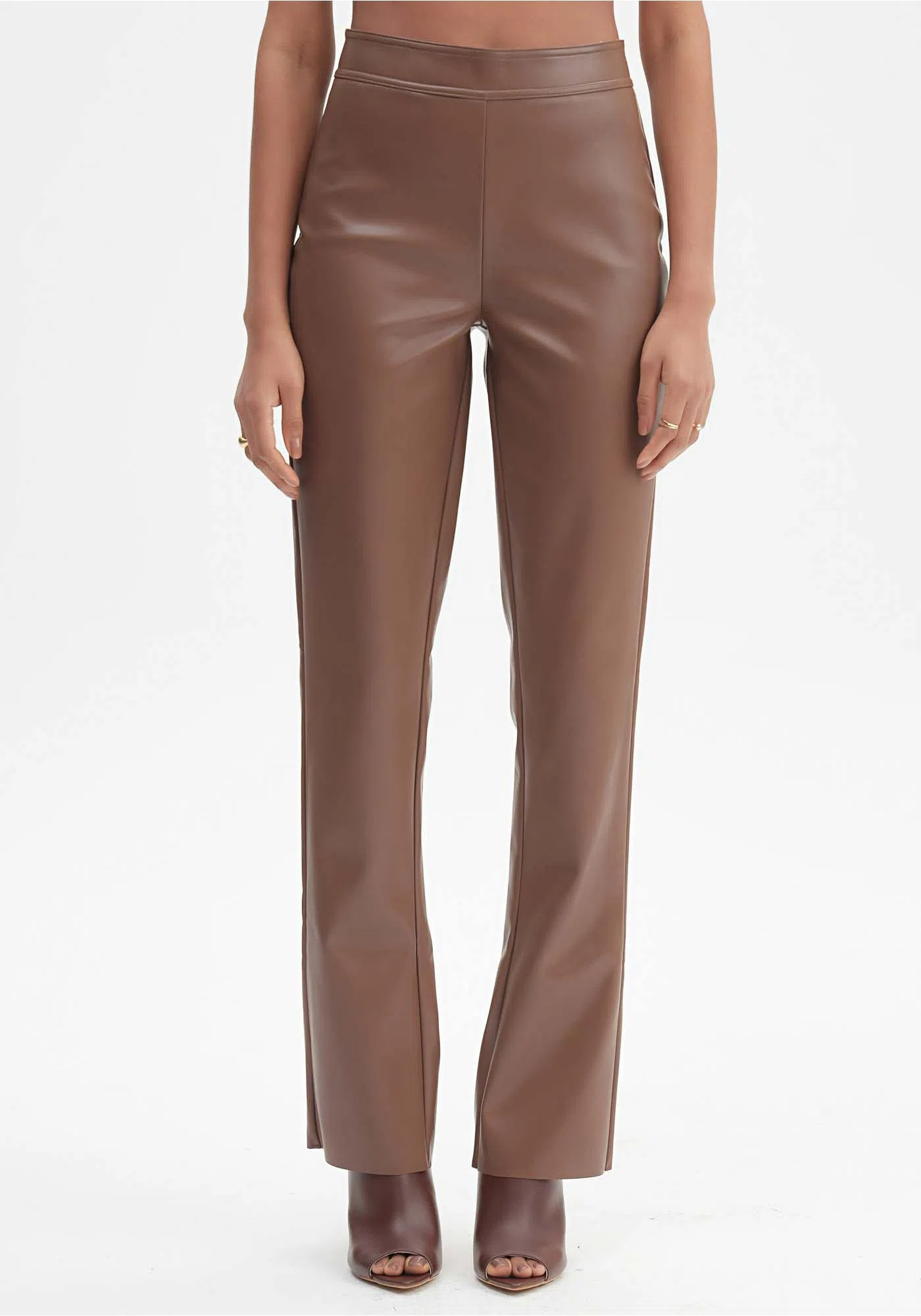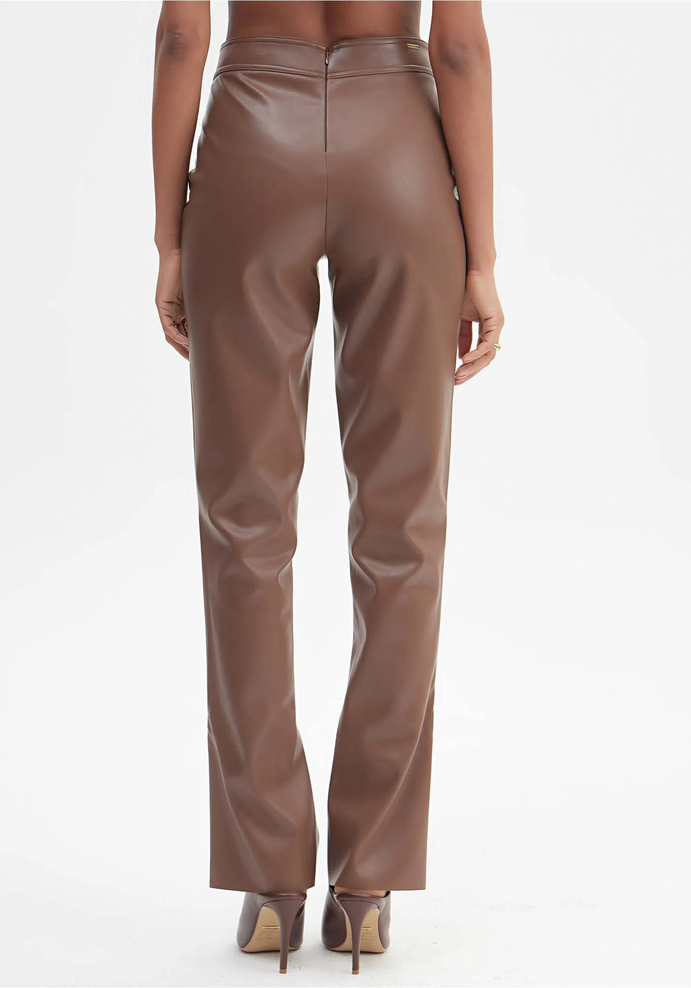 Em ecopele e com fechamento em fecho , a calça em modelagem boot cut possui cintura alta e caimento que valoriza a silhueta. Uma peça em tons terrosos, garantindo exuberância e eleg