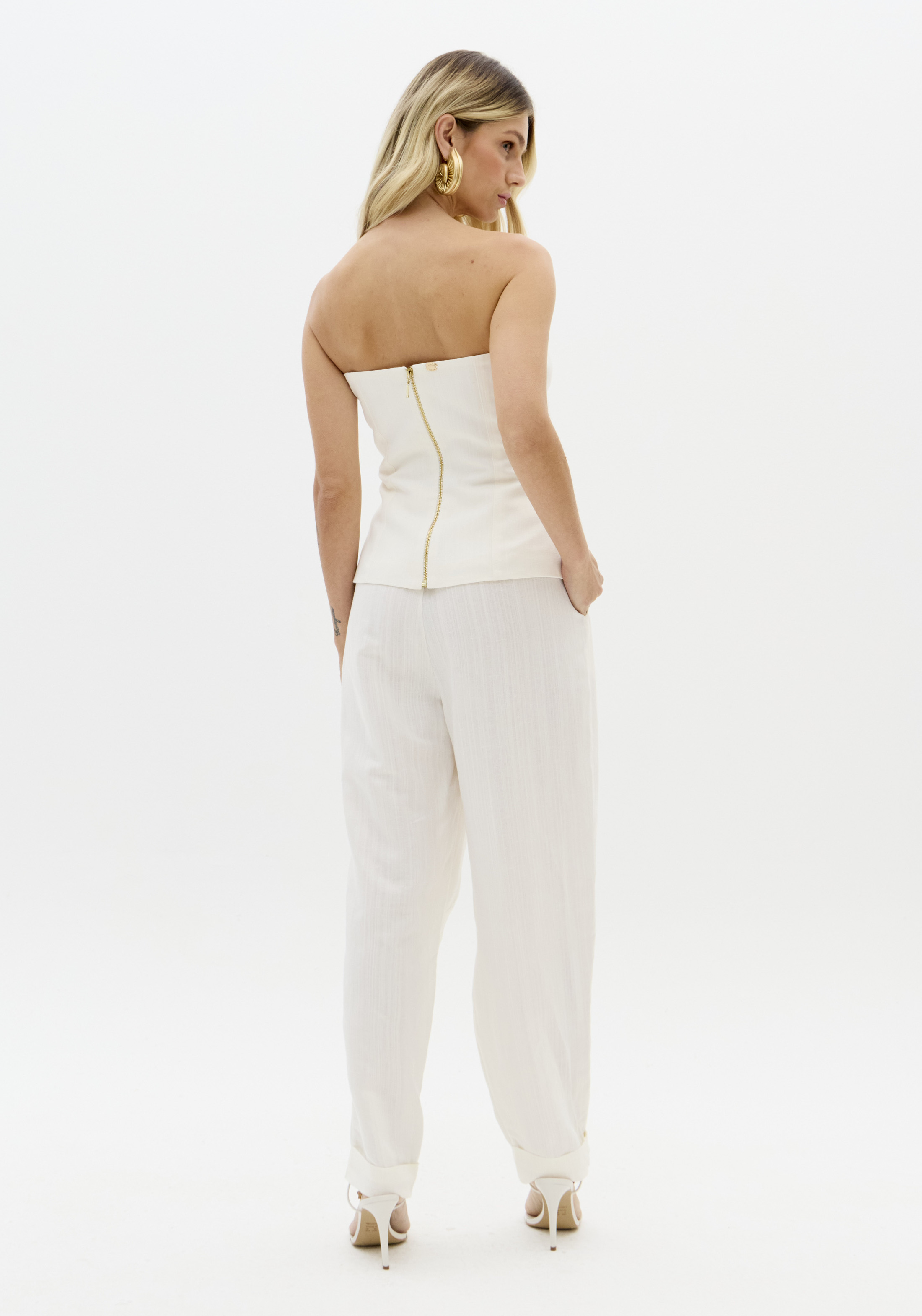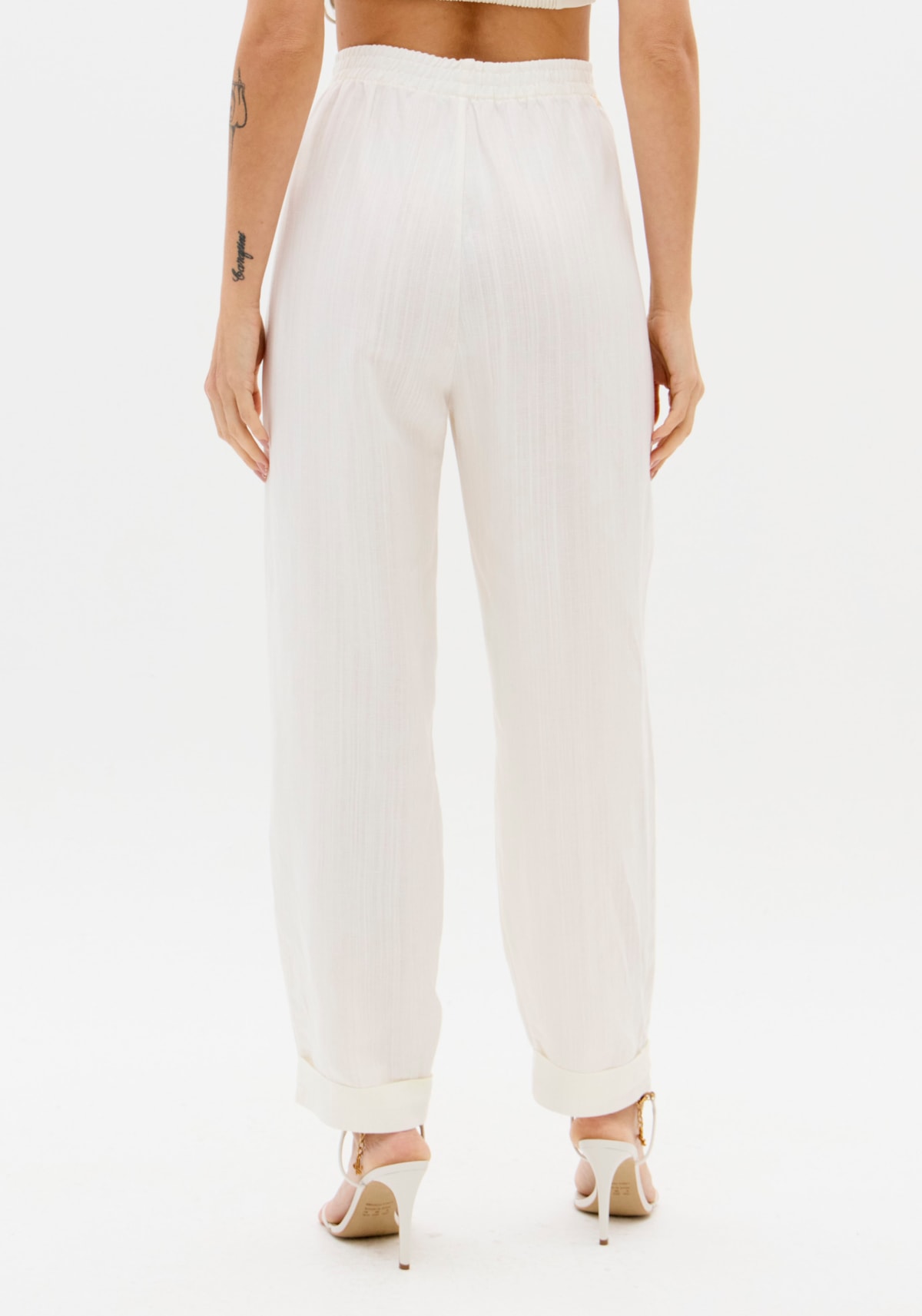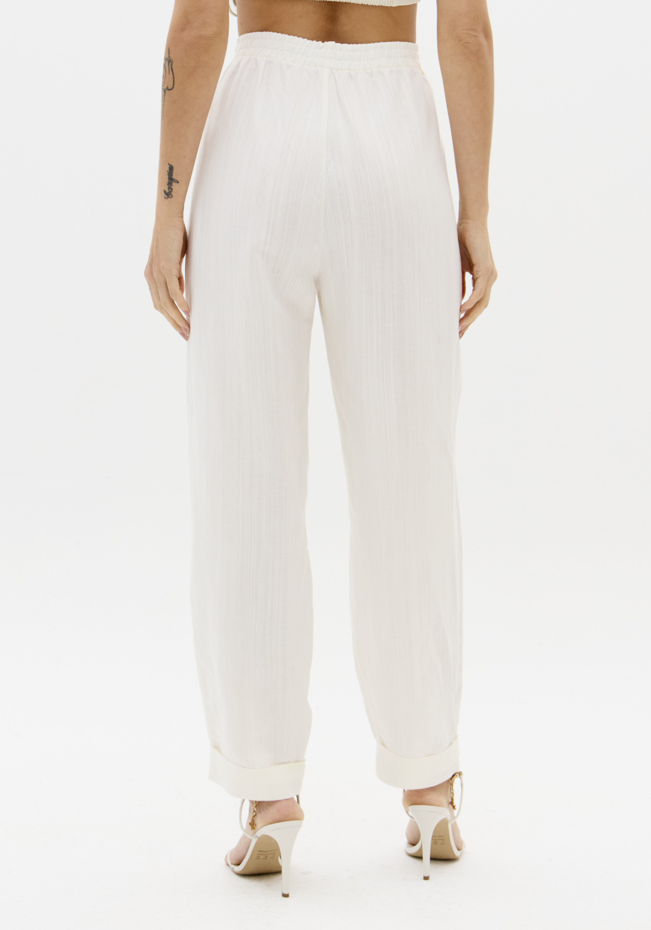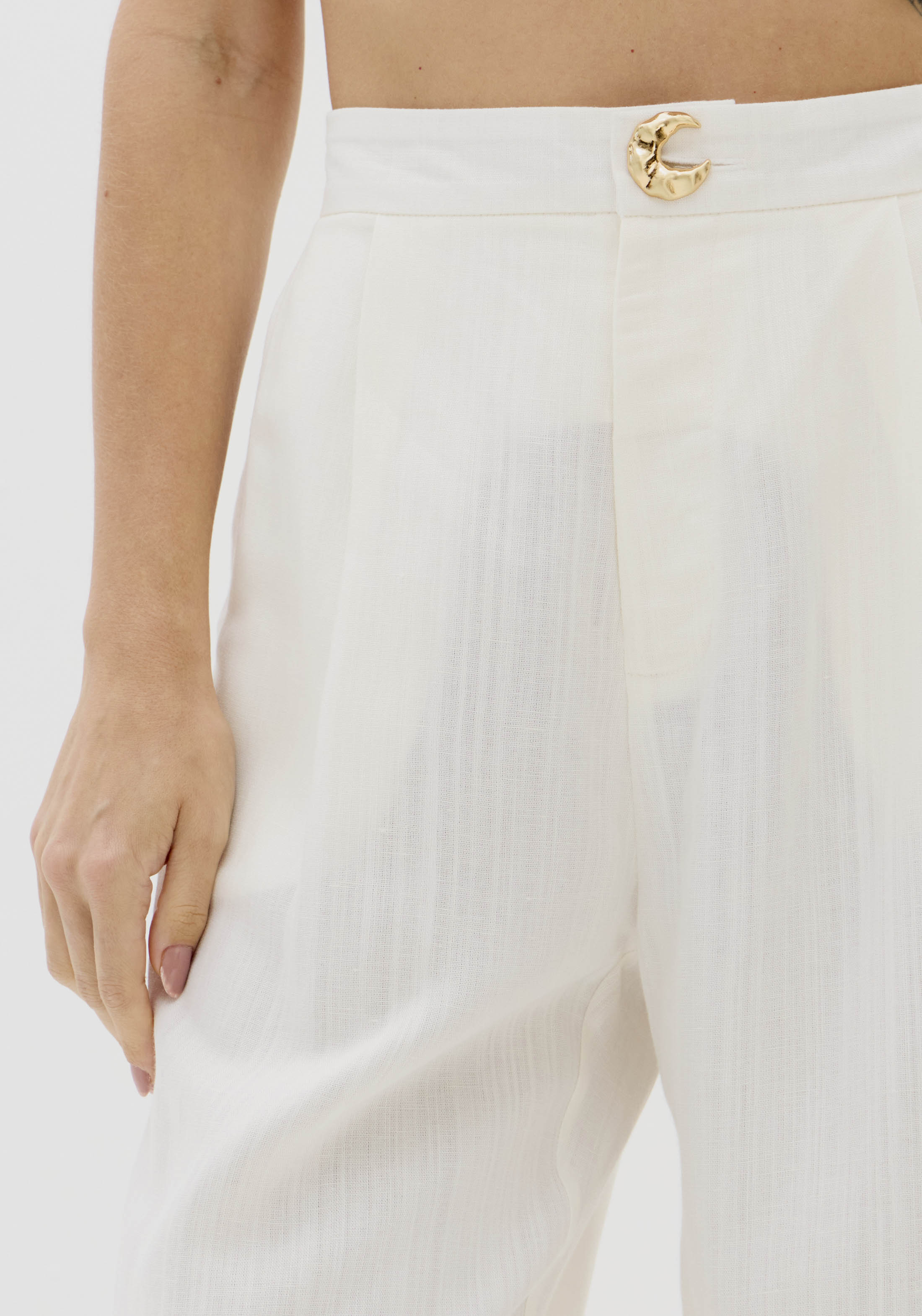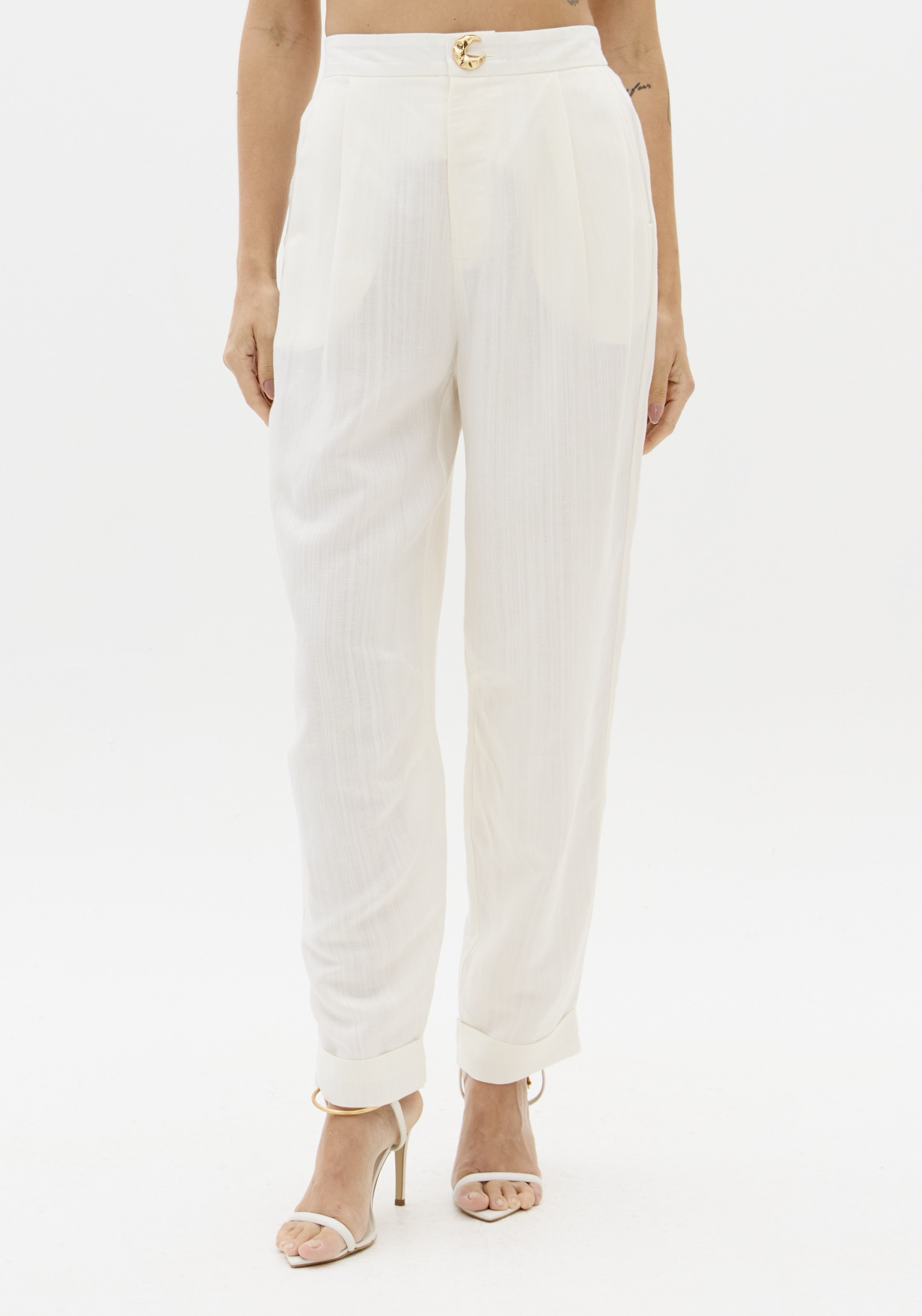 Com modelagem carrot, a calça em tecido com linho combina o caimento solto e levemente afunilado à cintura alta que valoriza a silhueta. Possui bolsos funcionais, fechamento por zíper e botão, além de barra italiana. Para um estilo elegante sem esforço!