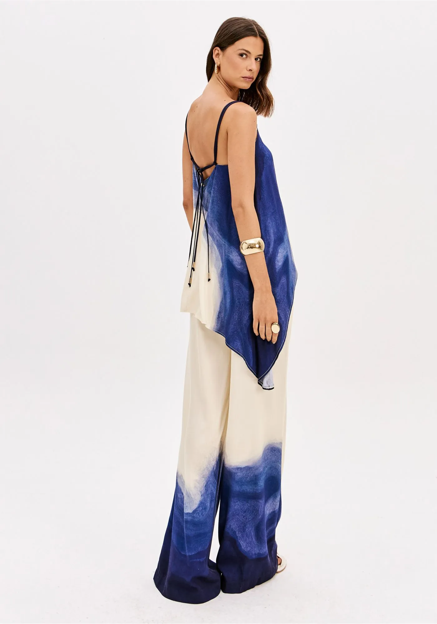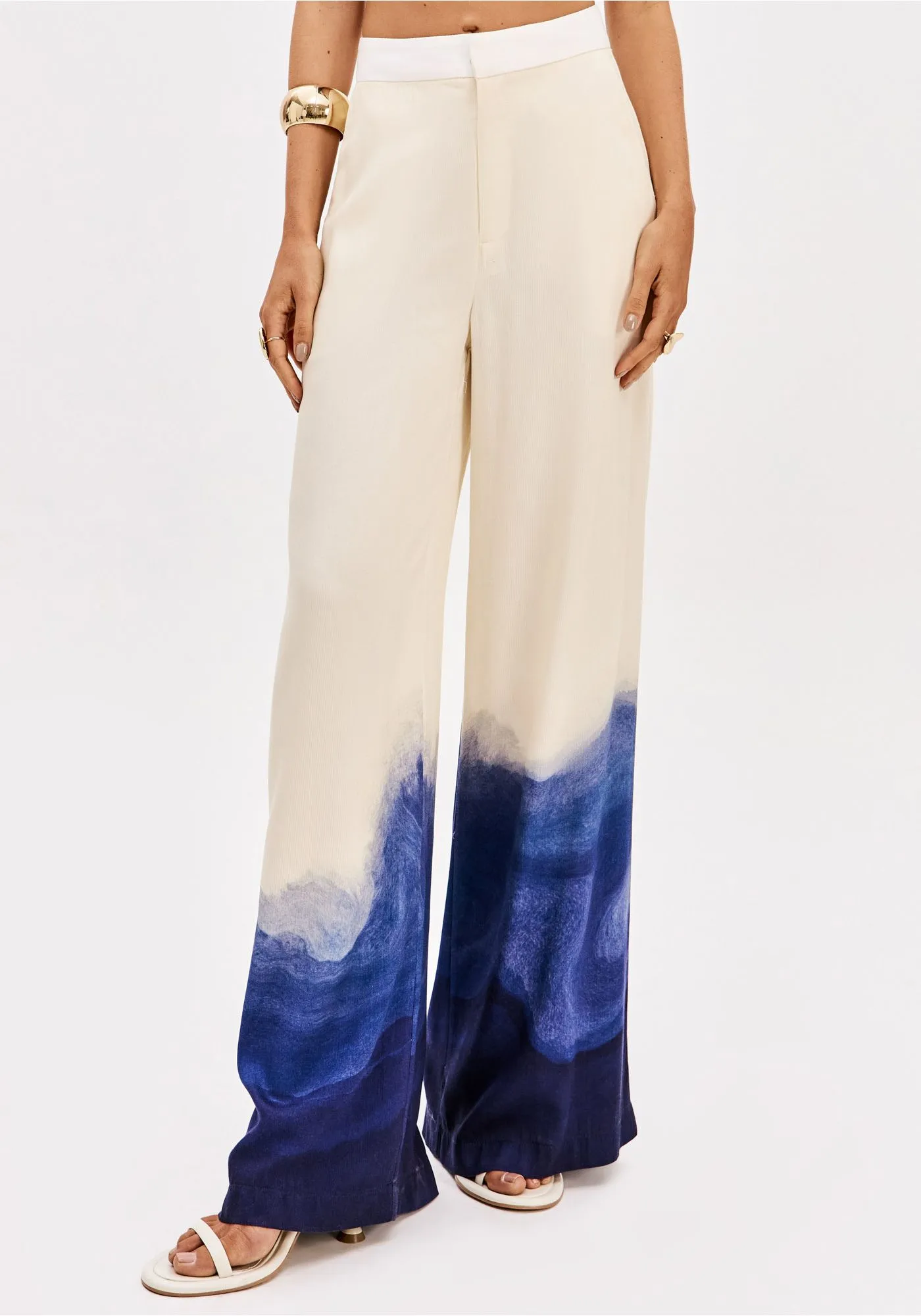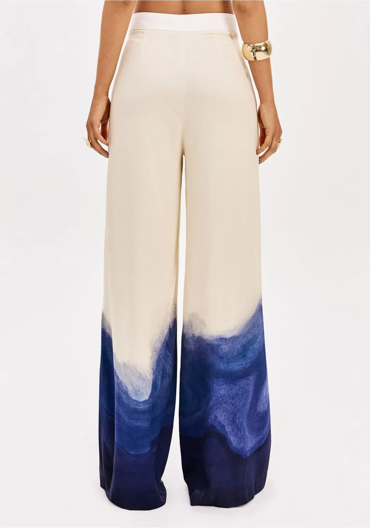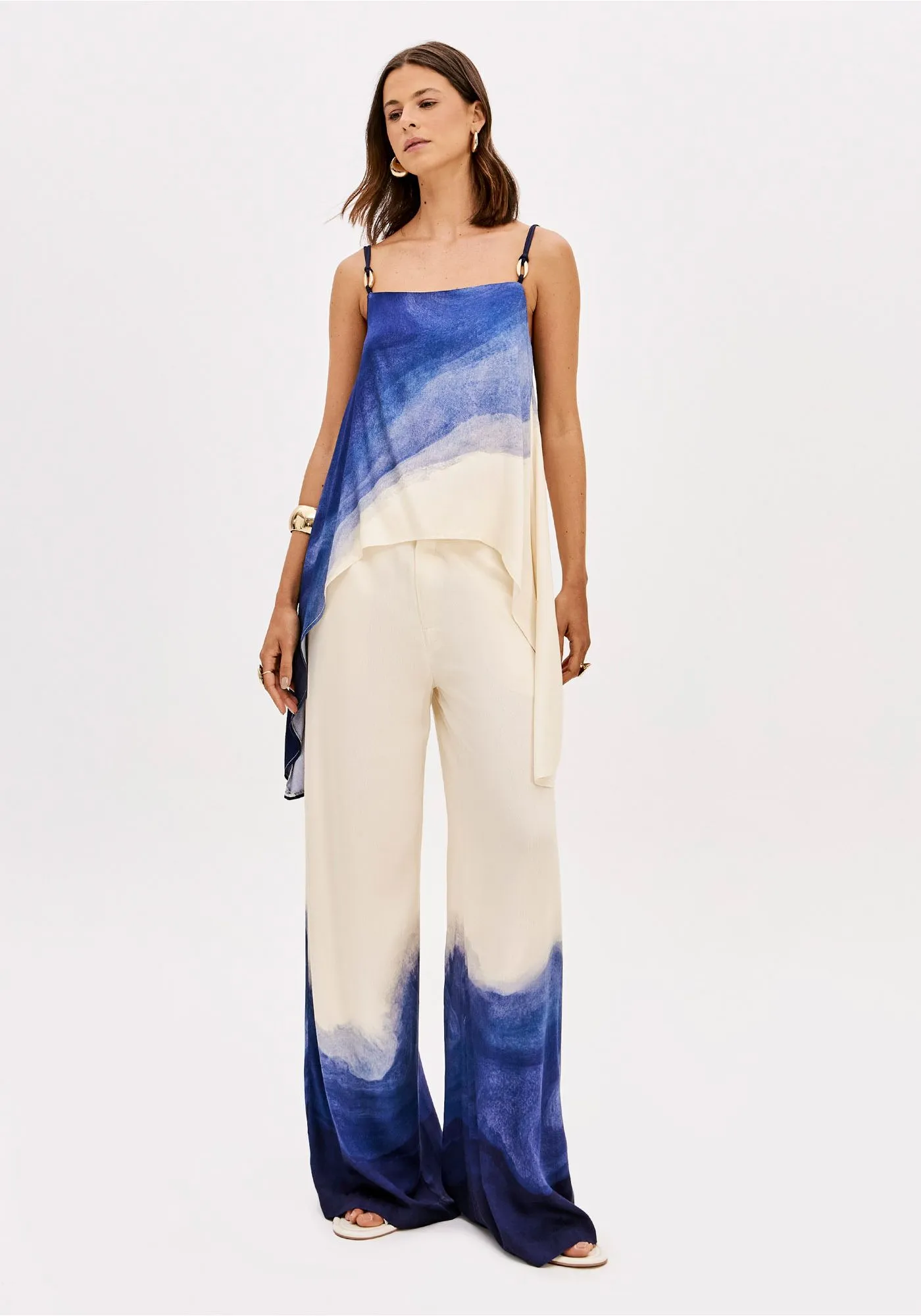 A calça wide leg de cintura alta é feita em tecido plano e leve de caimento fluido. Apresenta bolsos funcionais, fechamento frontal e estampa localizada que cria um contraste sofisticado. Aposte em blusa assimétrica lp para completar o look!